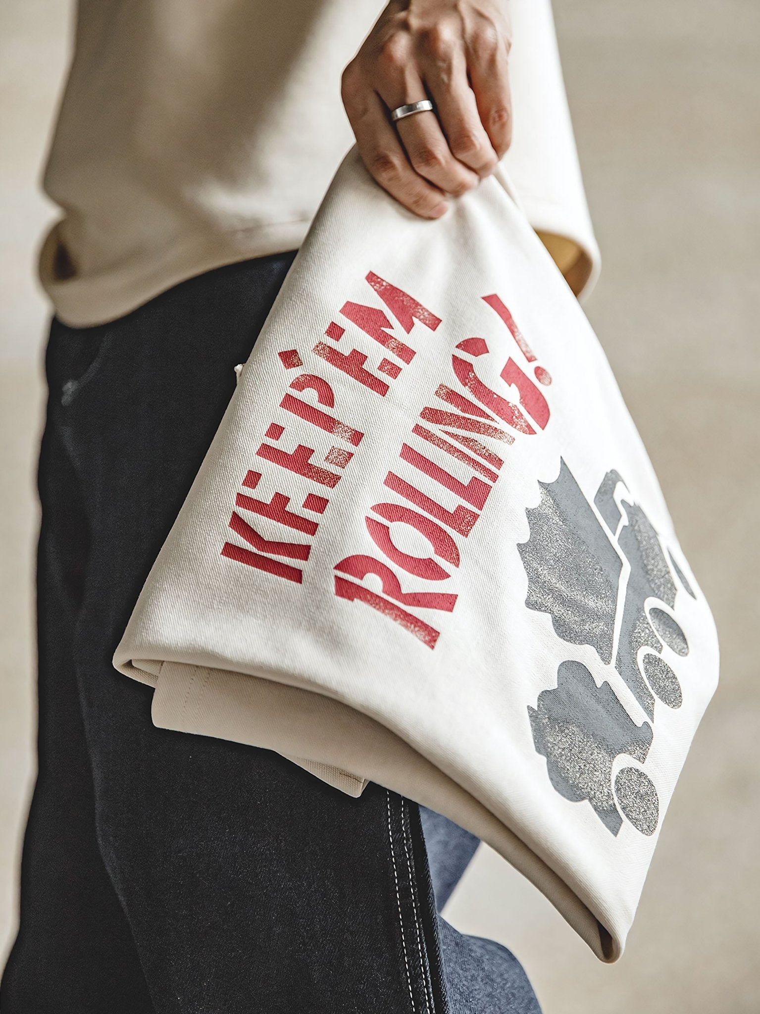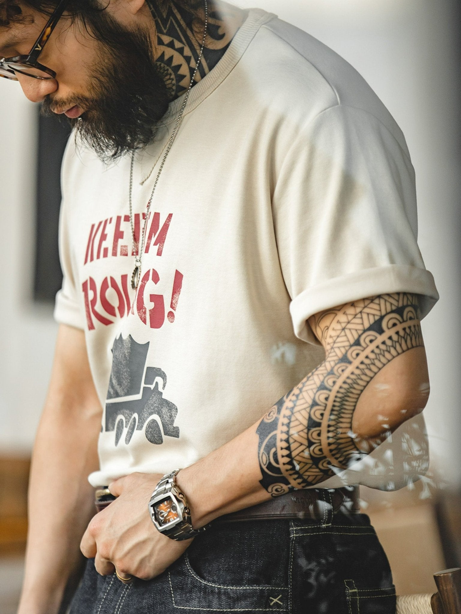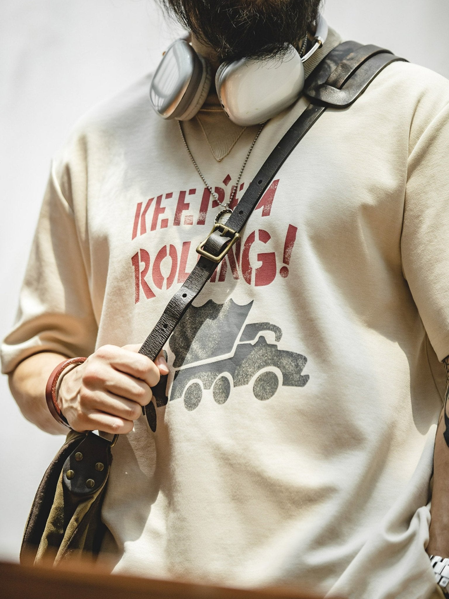 ヴィンテージ感溢れるプリントが特徴で、コーディネートやアイテムを引き立てるワンポイントのTシャツです。Vガゼットデザインがカジュアルなアクセントを加えています。リブで切り替えたネック部分はメリハリのある印象を演出しました。