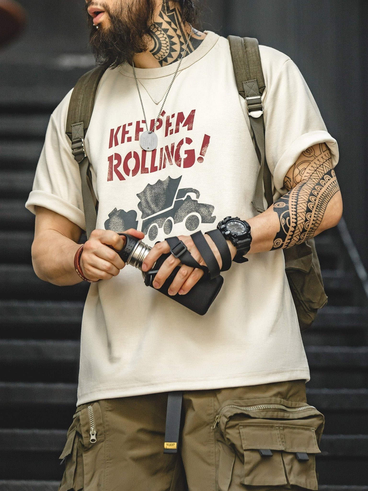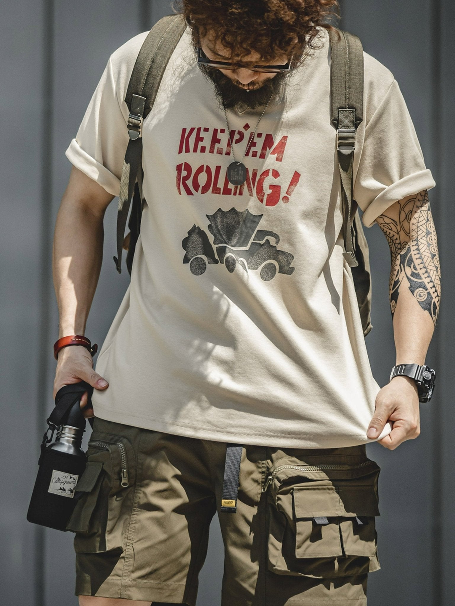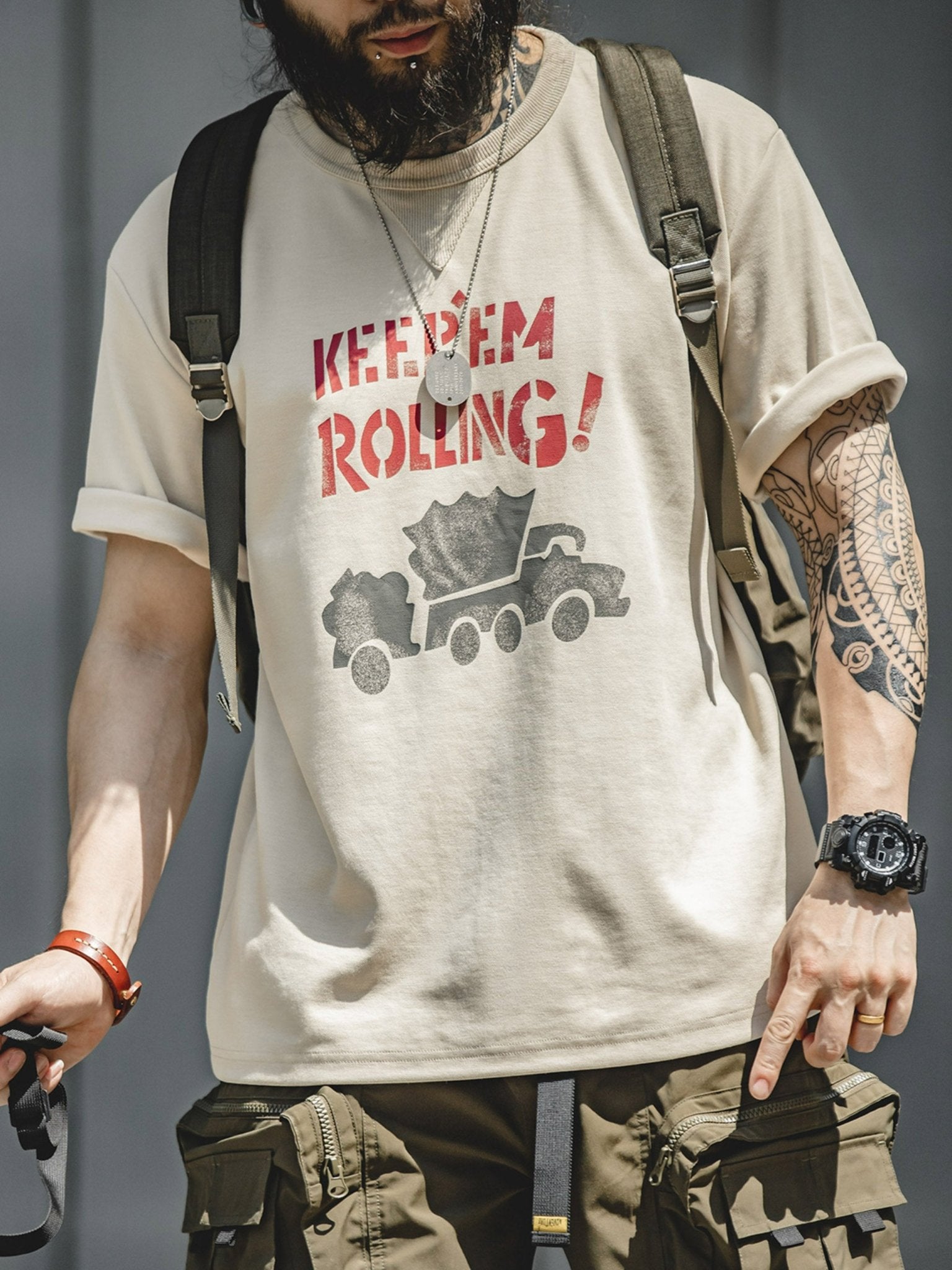 ヴィンテージ感溢れるプリントが特徴で、コーディネートやアイテムを引き立てるワンポイントのTシャツです。Vガゼットデザインがカジュアルなアクセントを加えています。リブで切り替えたネック部分はメリハリのある印象を演出しました。