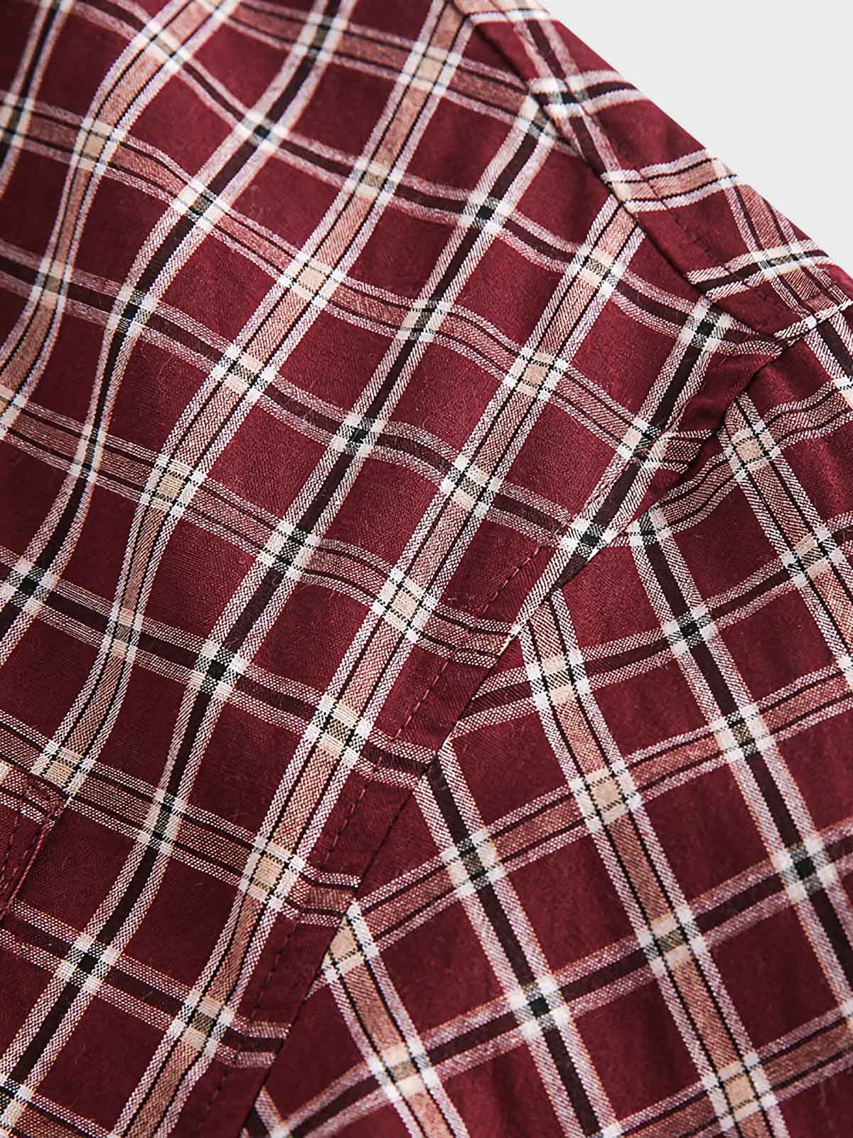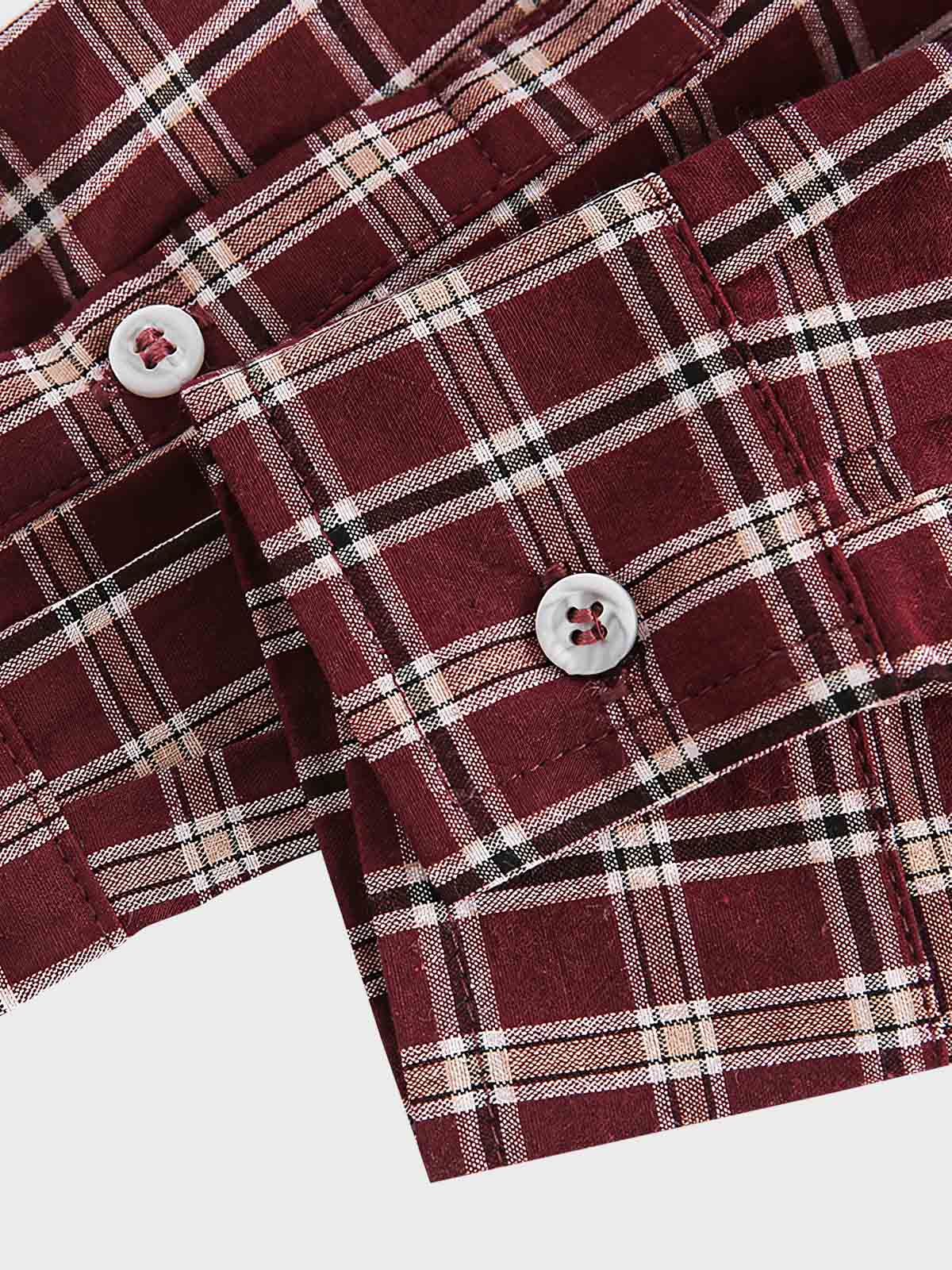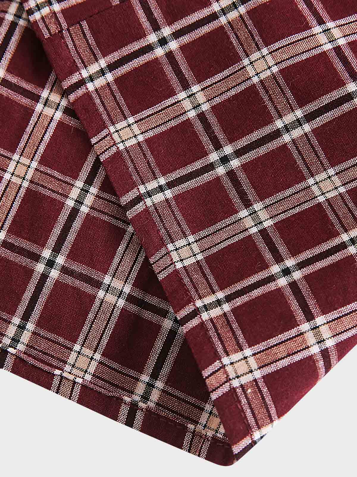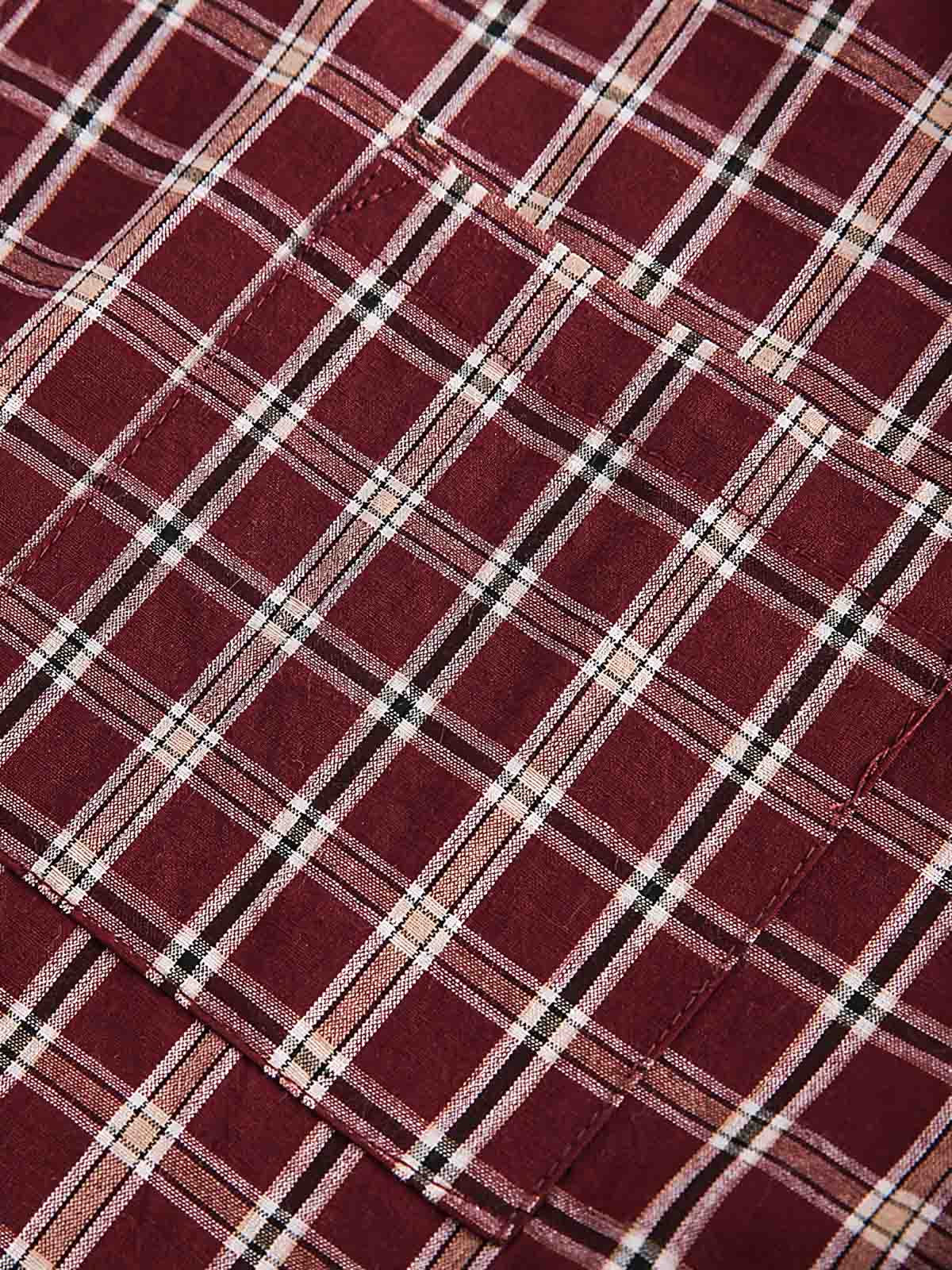 このシャツはイギリススタイルをデザインのベースにしており、チェック柄は19世紀のスコットランドに源を発しています。チェック柄はかつて貴族の狩猎時の象徴的な服装であり、現在では男性のクローゼットの中でクラシックな要素に進化しました。ワインレッドとダークトーンの交差は控えめで内向的な雰囲気を生み出し、伝統と現代の美的融合への理解を表現しています。