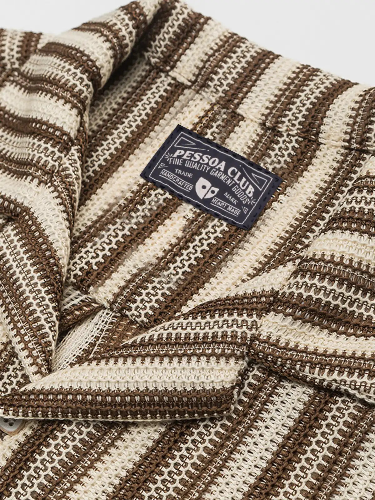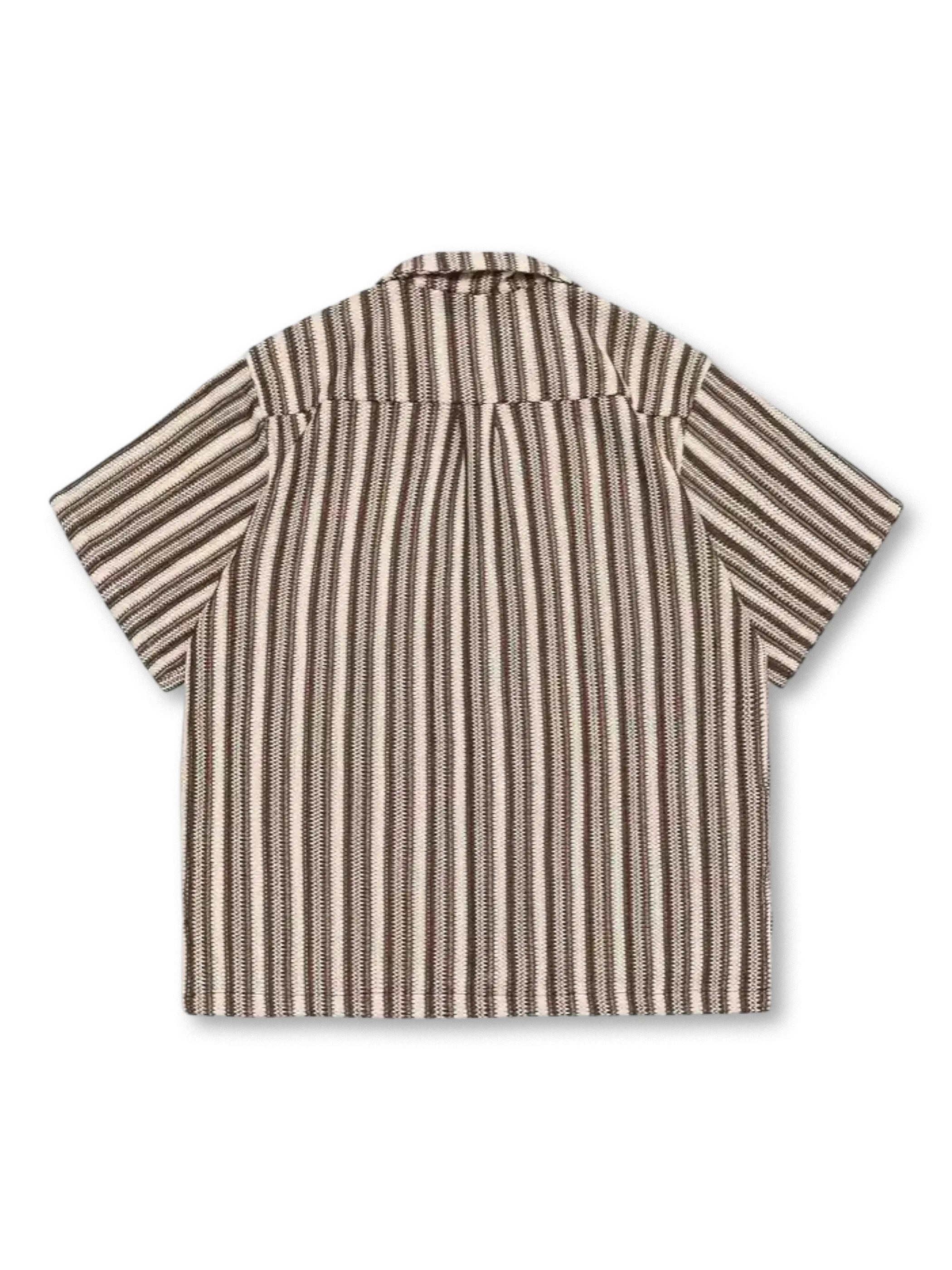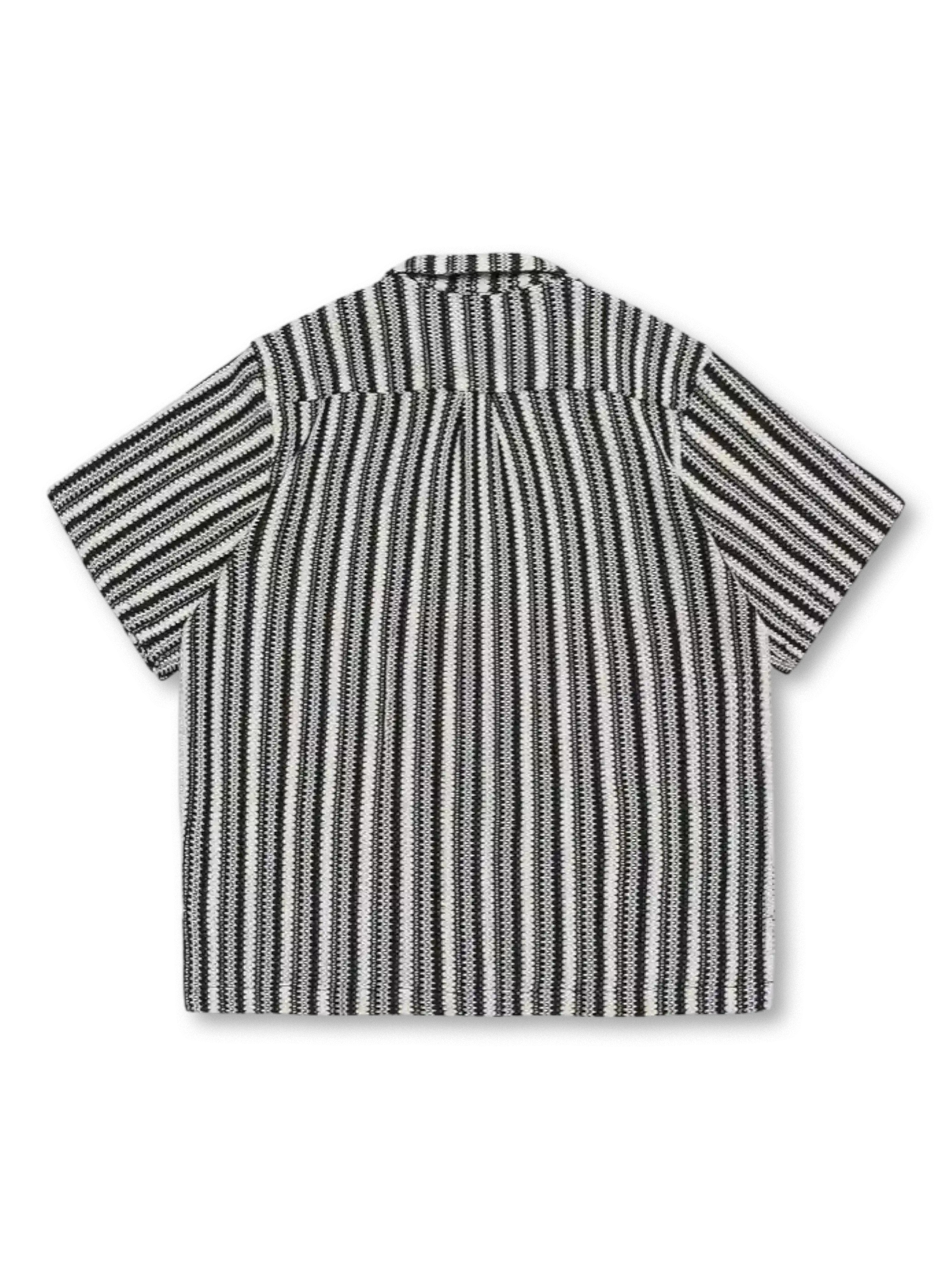さらりとしたタッチの75%ポリエステル・25%コットン混紡生地はシワになりにくく、日常使いでも扱いやすい。クラシックなキューバカラーをベースに、ベージュ×アイボリーまたはブラック×ホワイトの落ち着いた縦ストライプ柄を採用し、オンオフ問わずコーディネートしやすいデザイン。軽量で通気性に優れた生地はレイヤードしやすく、ボタンを開けて羽織りとしても、すっきりと一枚でもサマになる。ゆとりを持たせたボックスシルエットは、ショーツやスリムフィットパンツとの相性が良く、夏のリゾートからタウンユースまで幅広いシーンで活躍する汎用性の高い一着。