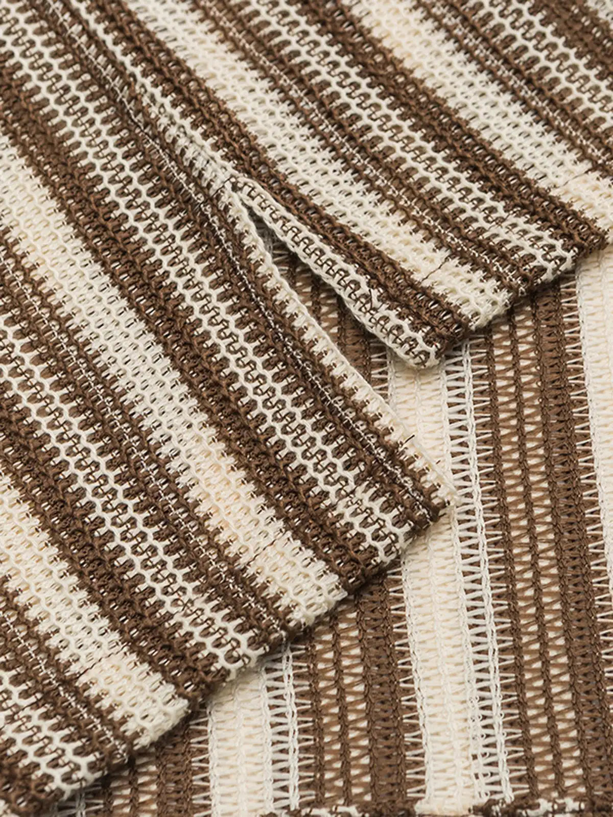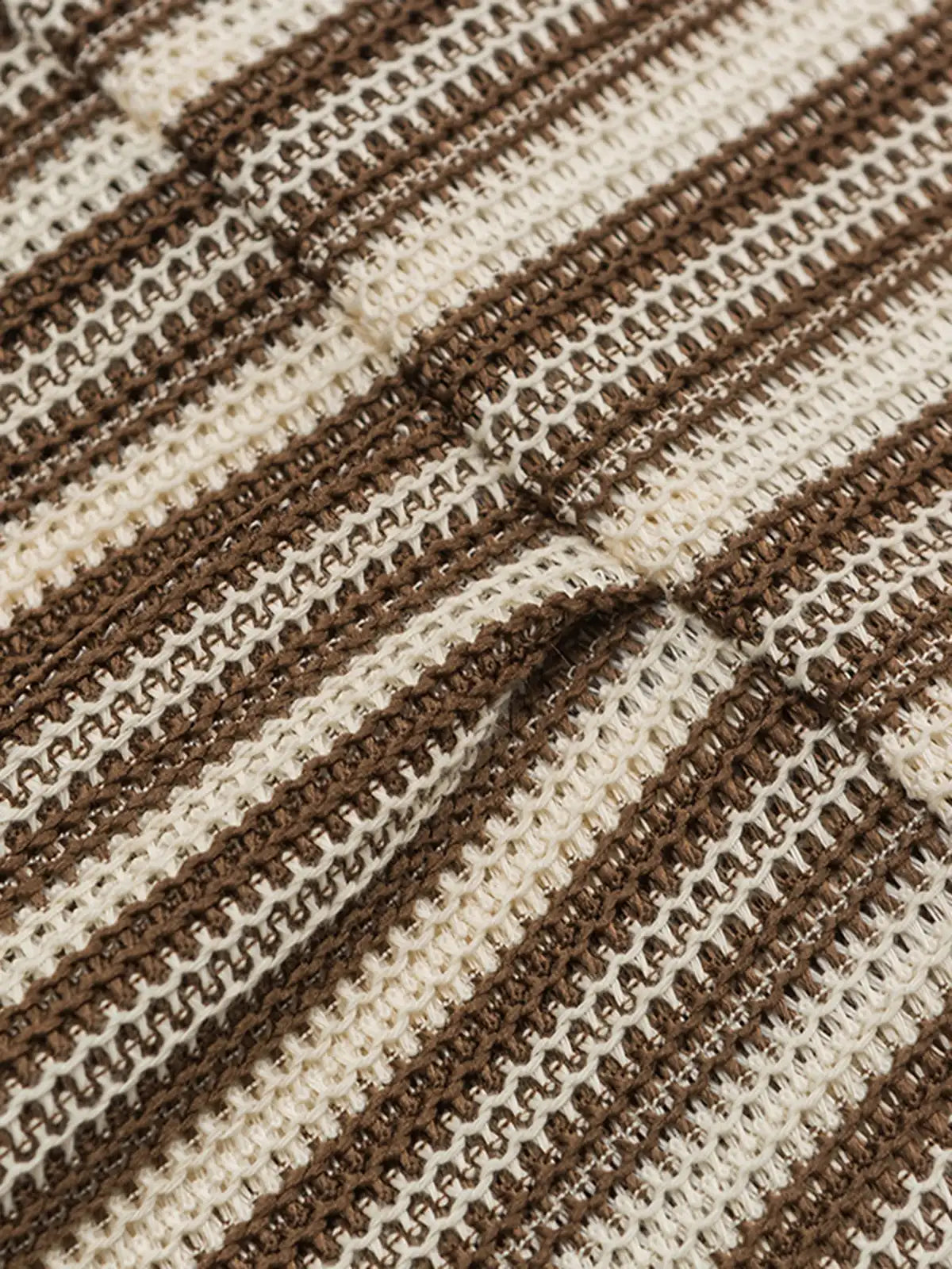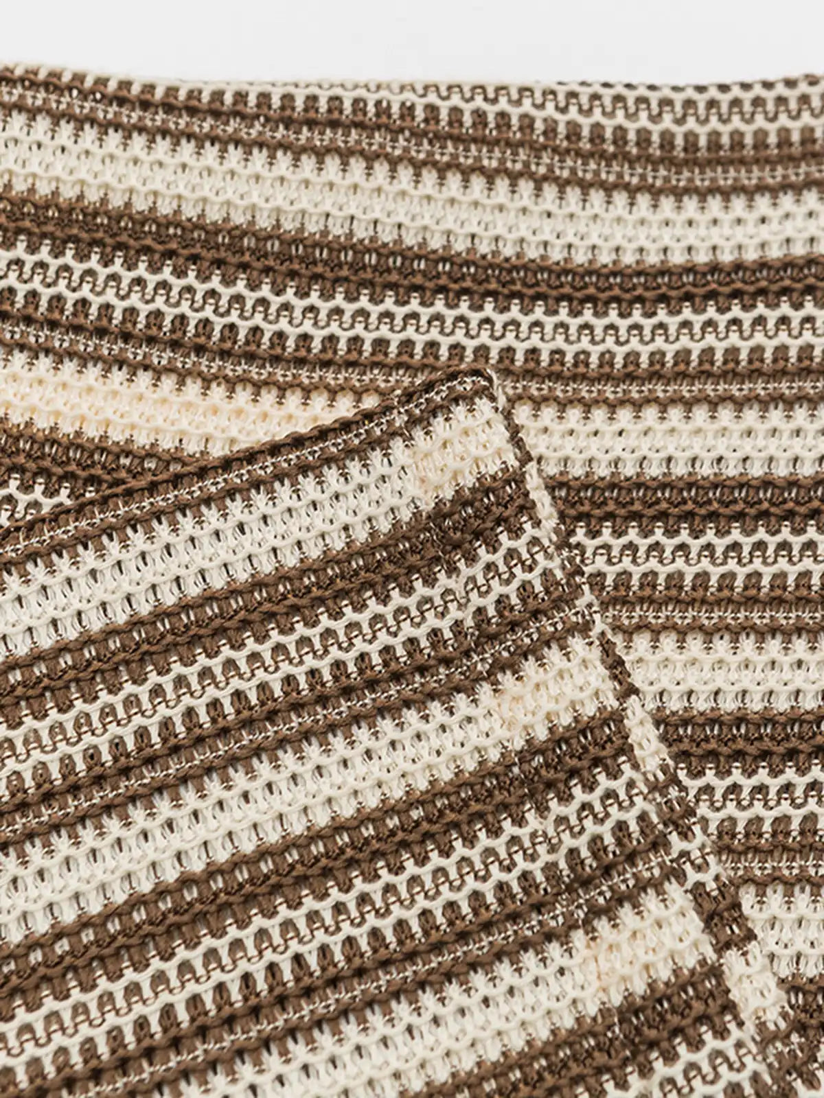 さらりとしたタッチの75%ポリエステル・25%コットン混紡生地はシワになりにくく、日常使いでも扱いやすい。クラシックなキューバカラーをベースに、ベージュ×アイボリーまたはブラック×ホワイトの落ち着いた縦ストライプ柄を採用し、オンオフ問わずコーディネートしやすいデザイン。軽量で通気性に優れた生地はレイヤードしやすく、ボタンを開けて羽織りとしても、すっきりと一枚でもサマになる。ゆとりを持たせたボックスシルエットは、ショーツやスリムフィットパンツとの相性が良く、夏のリゾートからタウンユースまで幅広いシーンで活躍する汎用性の高い一着。