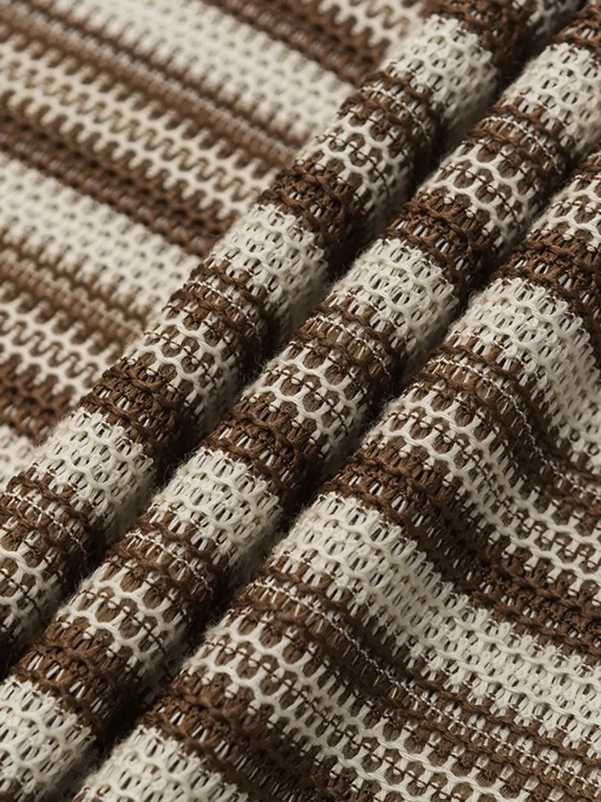 75%ポリエステル・25%コットン混紡の生地で仕立てた、モダンな縦ストライプ柄が映えるキューバカラー半袖シャツ。