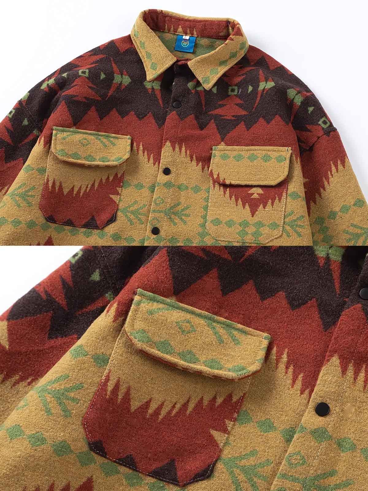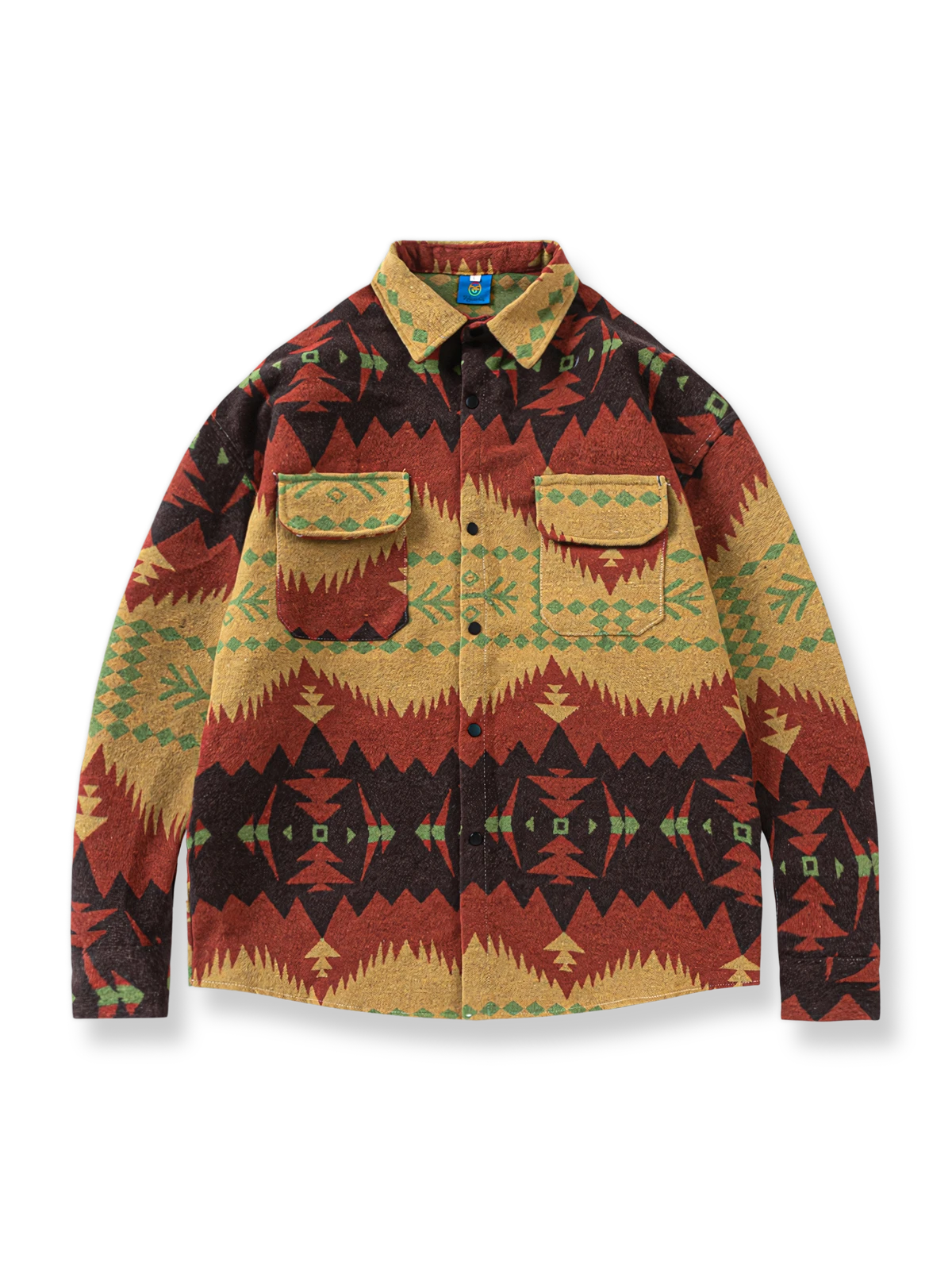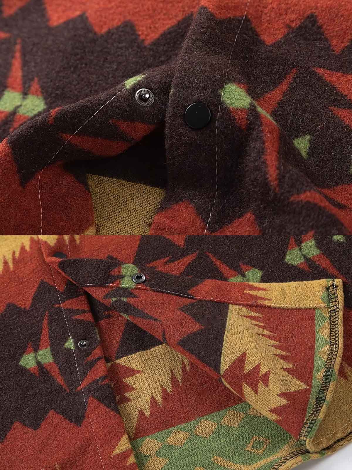 シャツの素材は高品質のウールを使用しており、保温性と耐久性に優れています。複雑なエスニックスタイルのパターンは精巧な技術で表現されており、色鮮やかで色褪せにくいです。さらに、シャツの製作工程は精密で、各縫い目や接合部は丁寧に処理されており、服の耐久性と美観を保証しています。