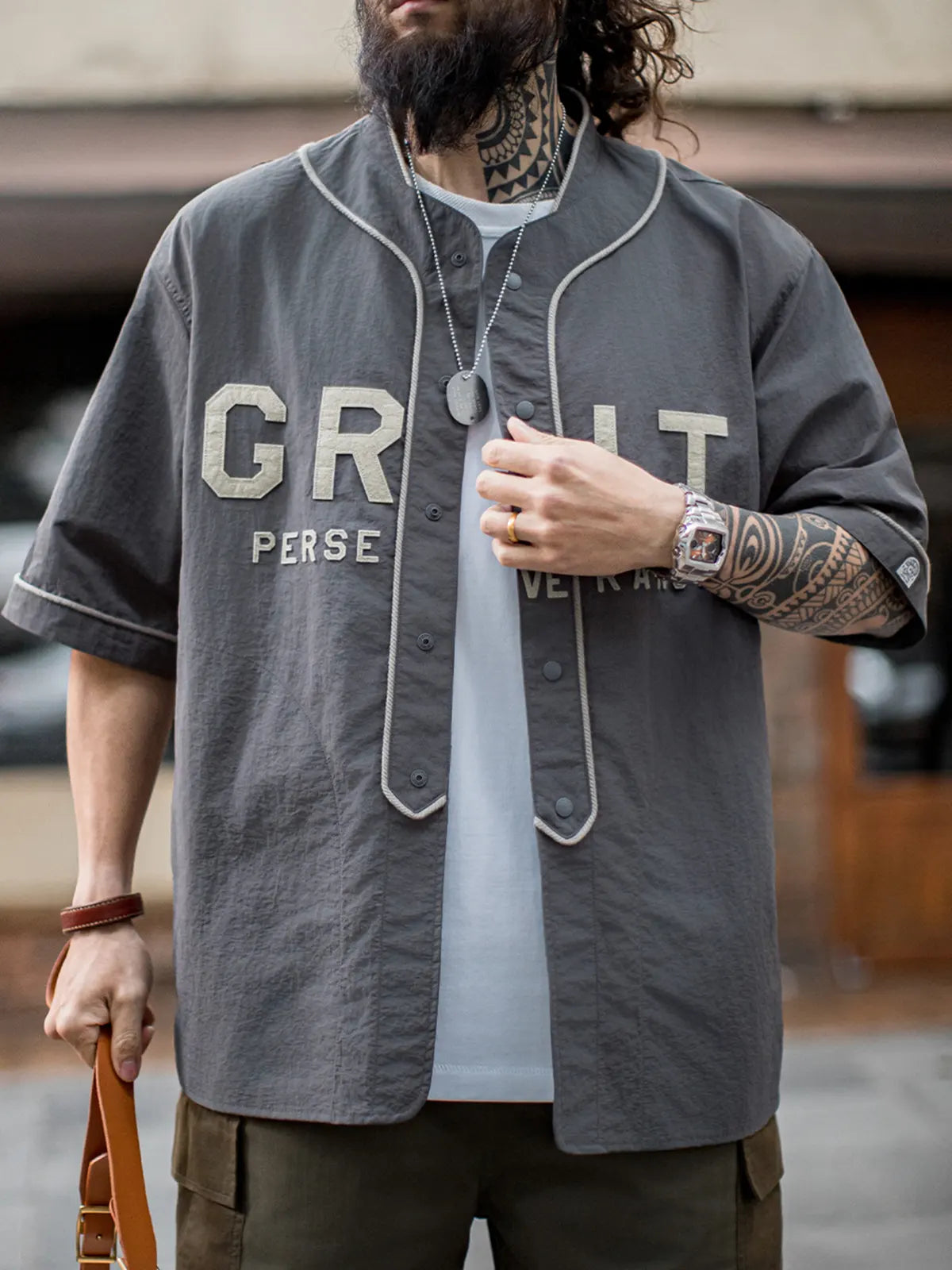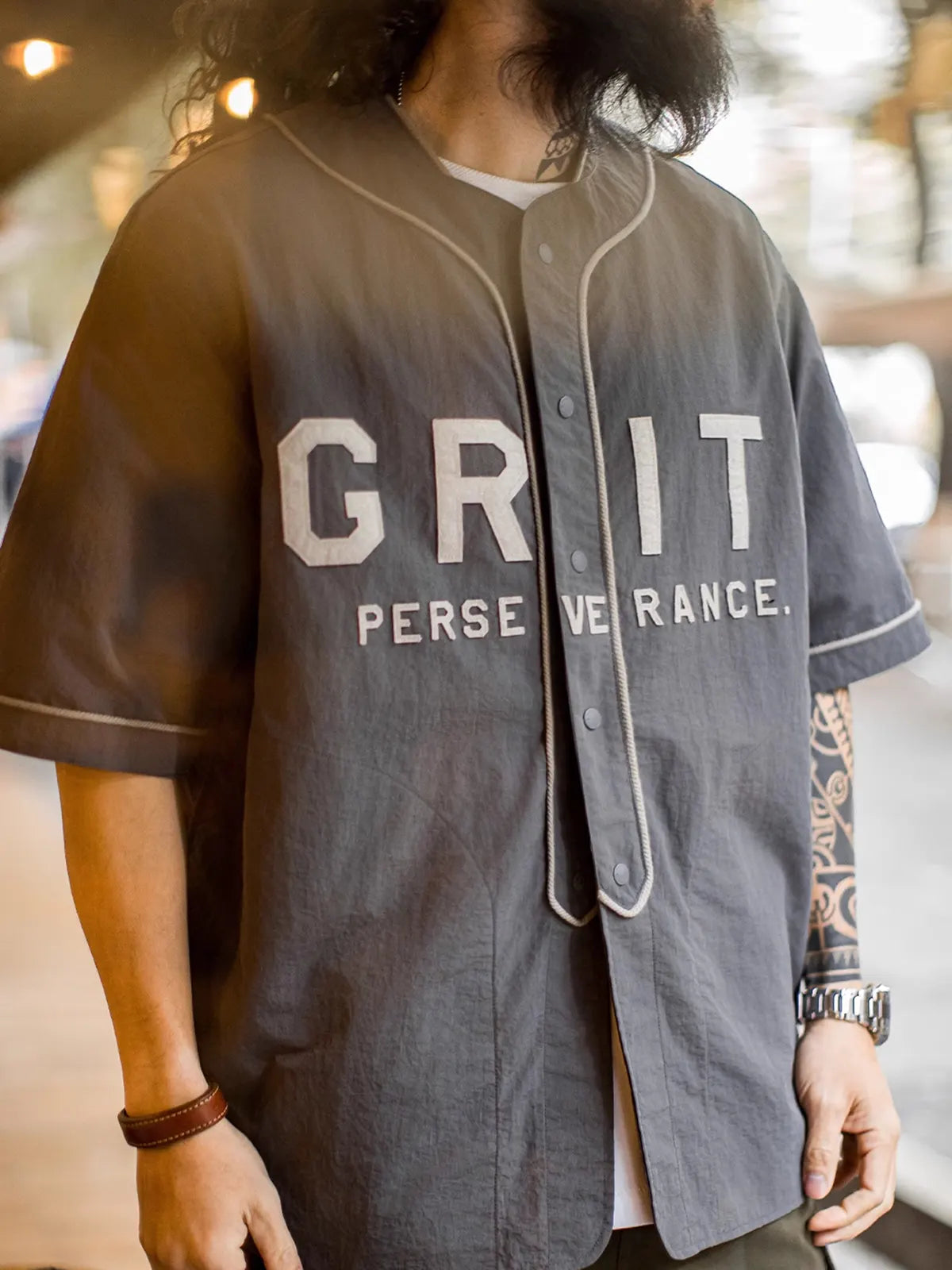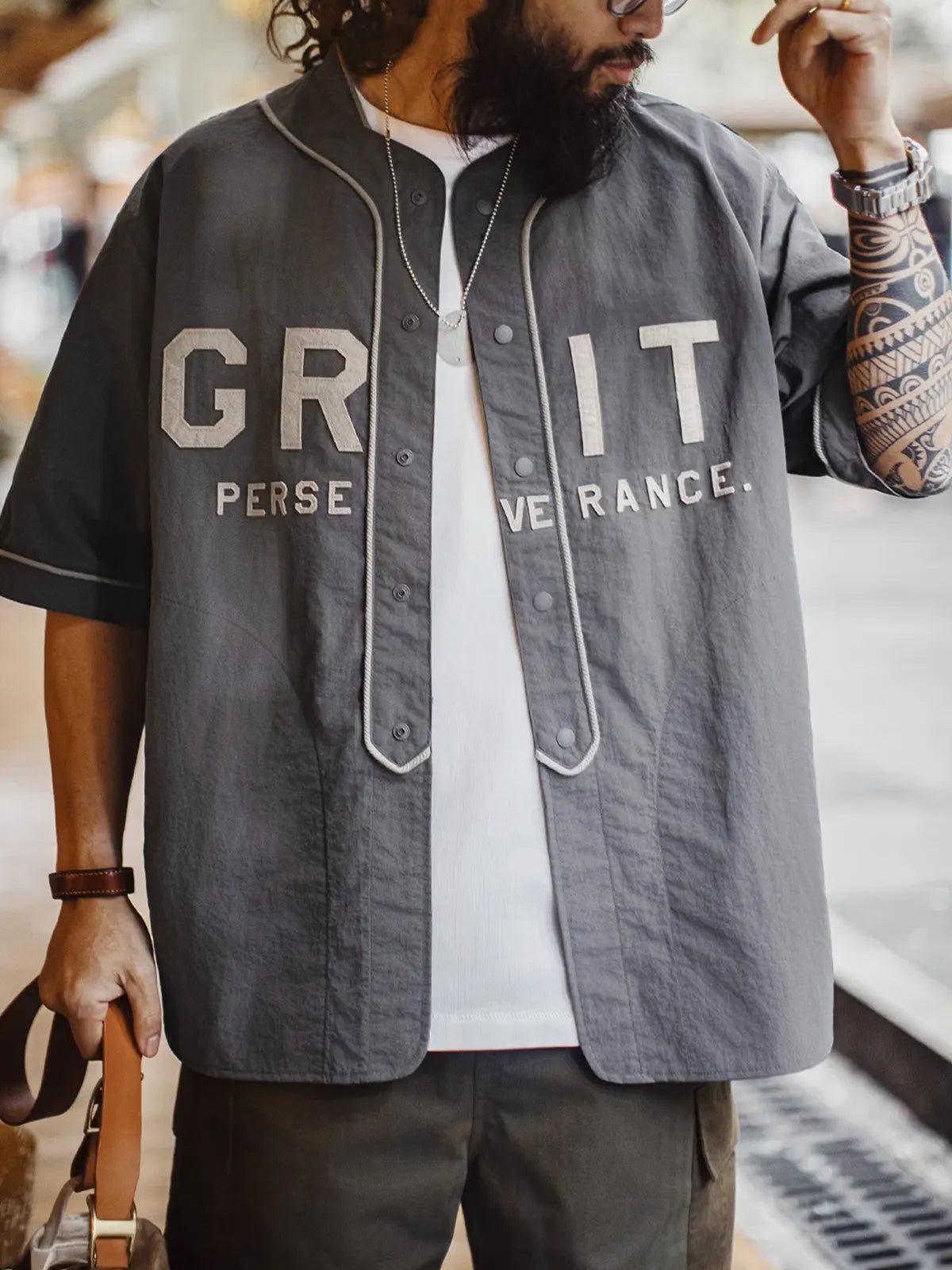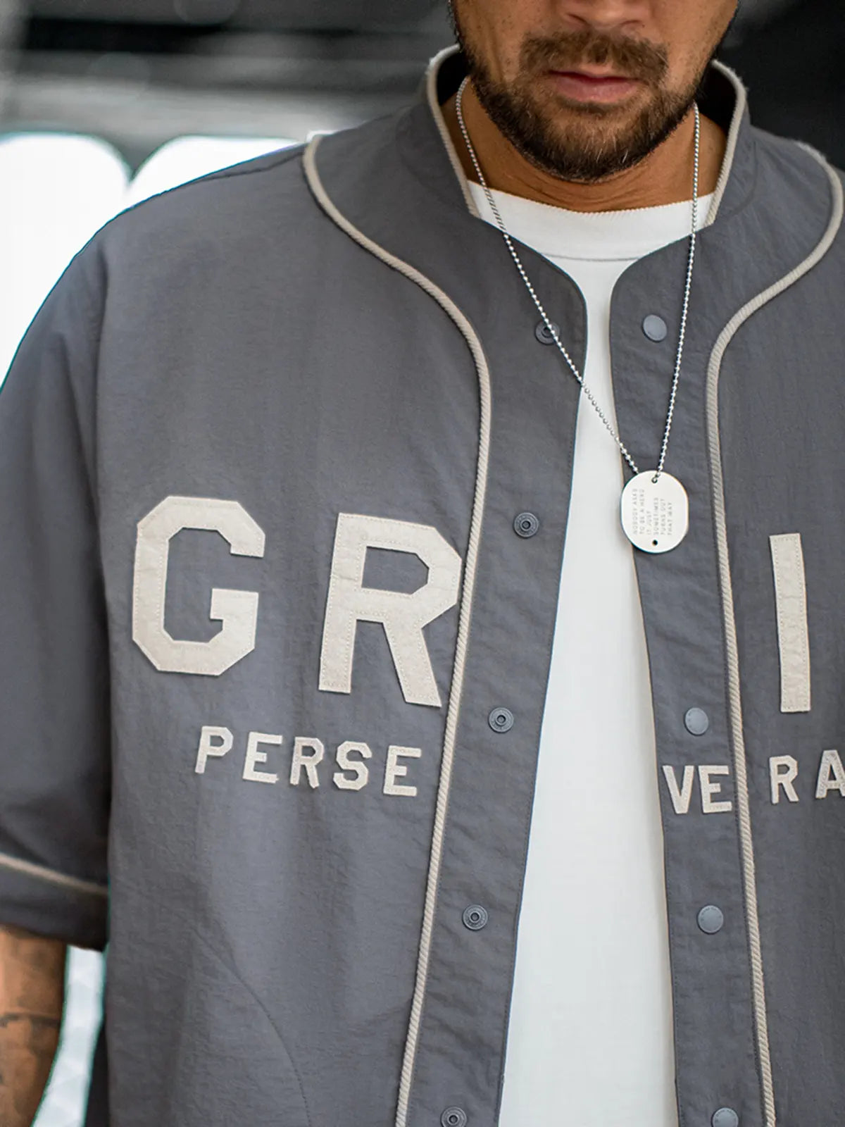 このベースボールシャツは、「GRIT PERSEVERANCE」の立体的なフェルト刺繍とメテオライトグレーの軽量生地が、スポーティーかつヴィンテージライクな雰囲気を演出する一着です。