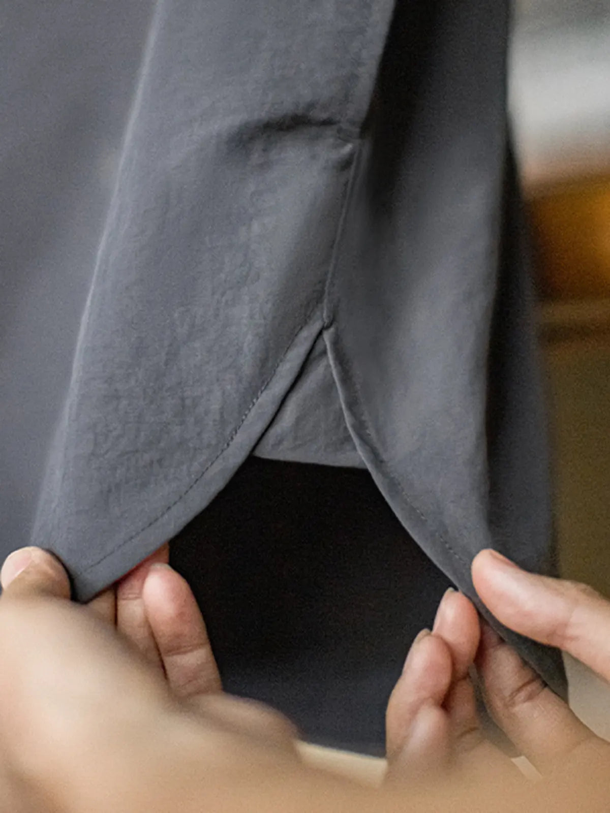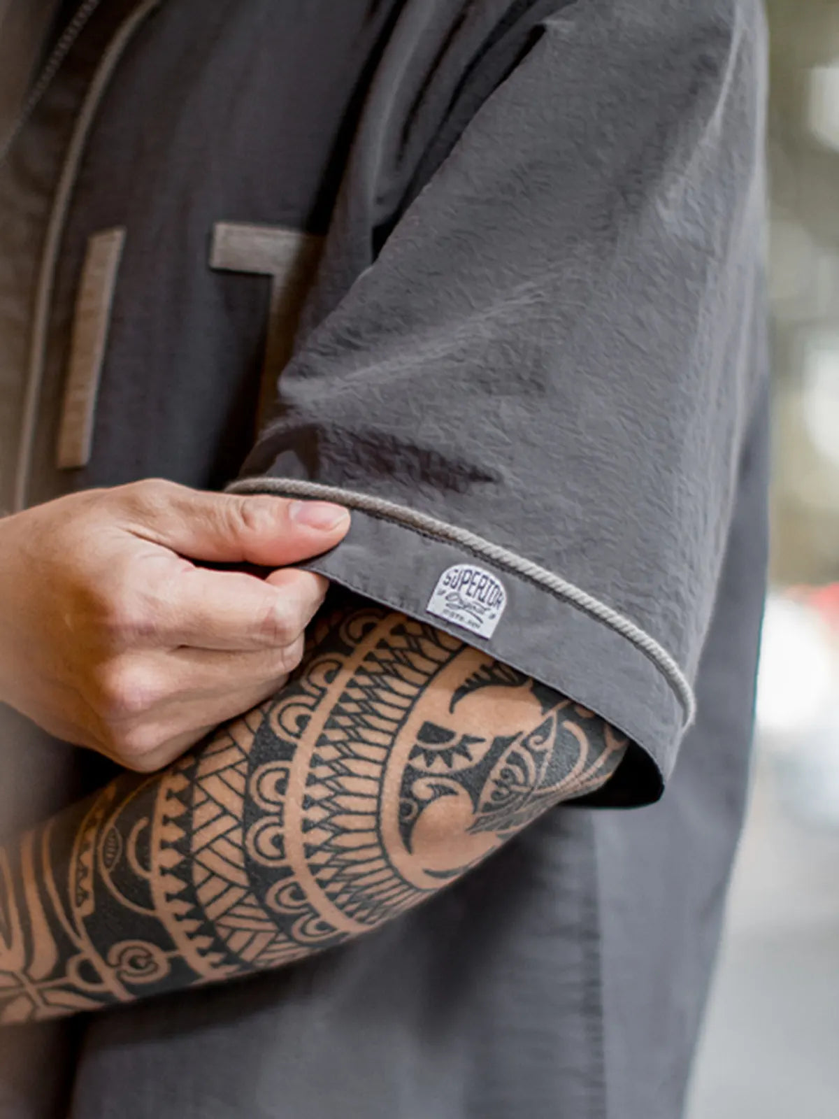 90年代風ベースボールシャツをベースに改良し、胸元には「GRIT PERSEVERANCE」のフェルトパッチが施され、粘り強い精神を体現。メテオライトグレーのややシワ感ある生地(125g/m²)を使用し、軽量かつ通気性に優れた仕上がりです。立体的なパターンによって、カジュアルからスポーティーまで幅広いコーデに対応。ホログラム風スナップボタンや紐状の子母テープがディテールを引き立て、ヴィンテージ感と現代的な要素を絶妙にミックスしたアイテムです。