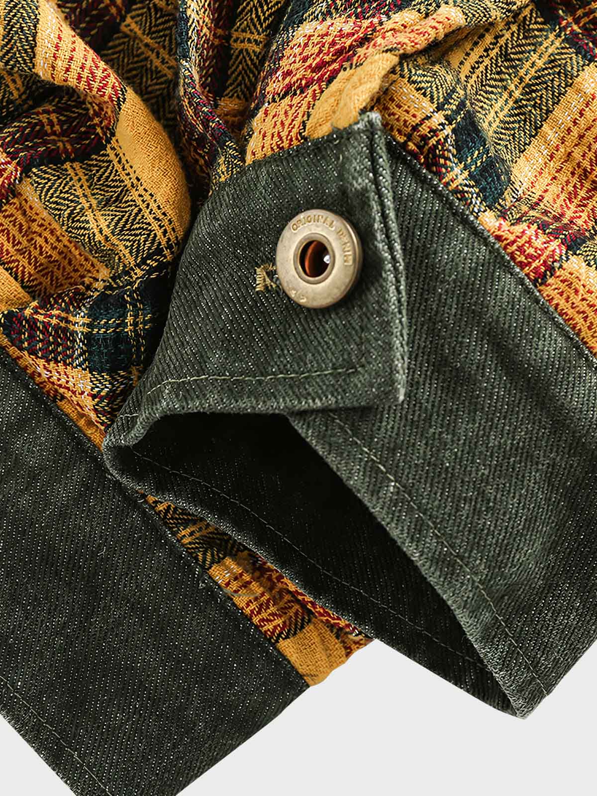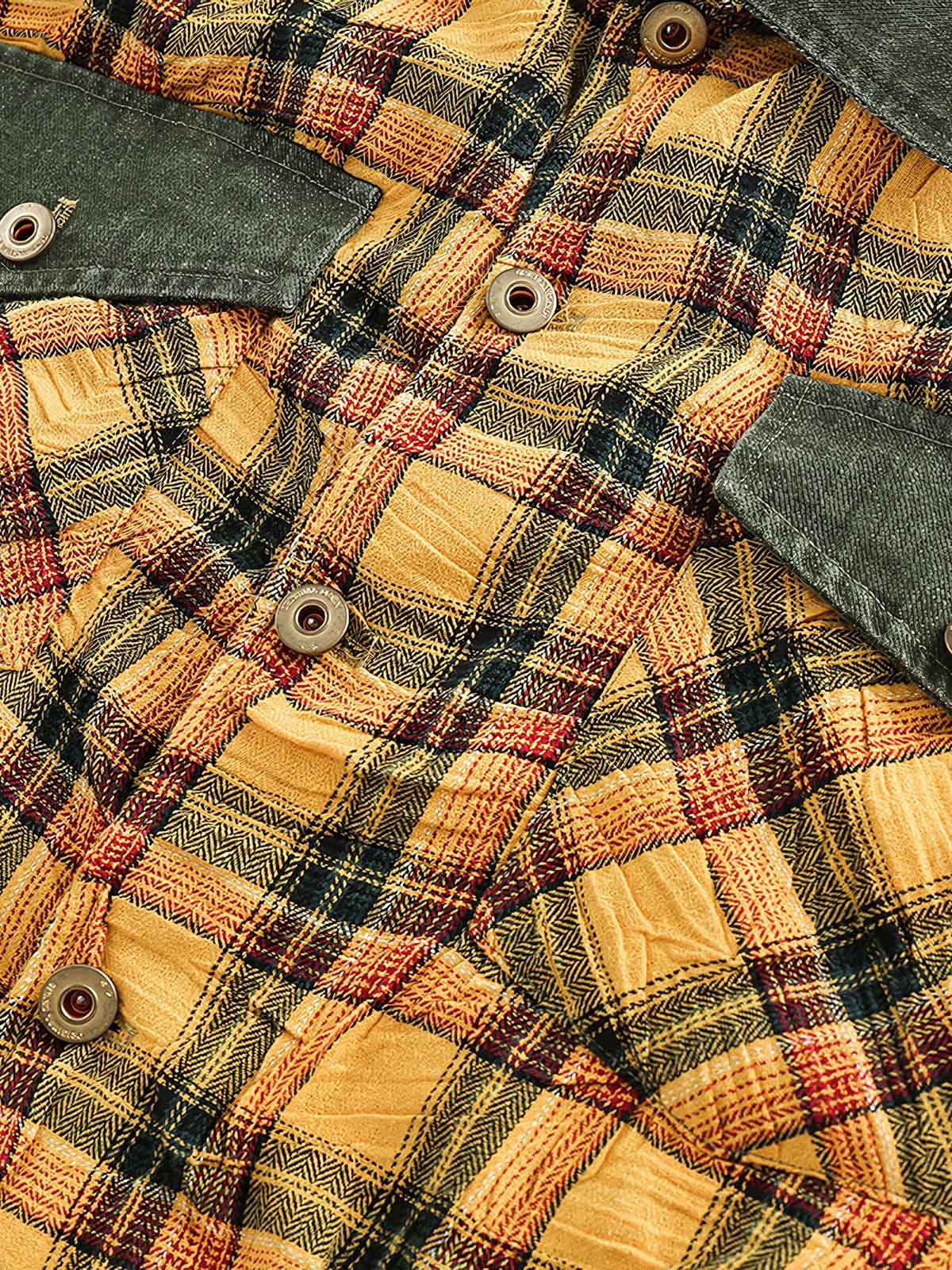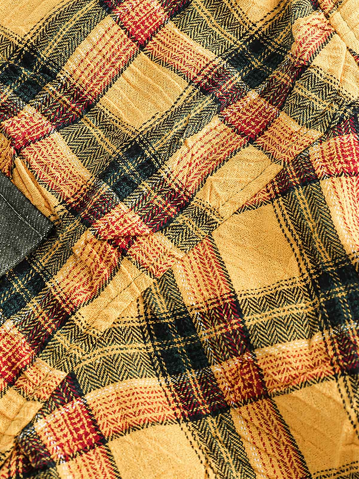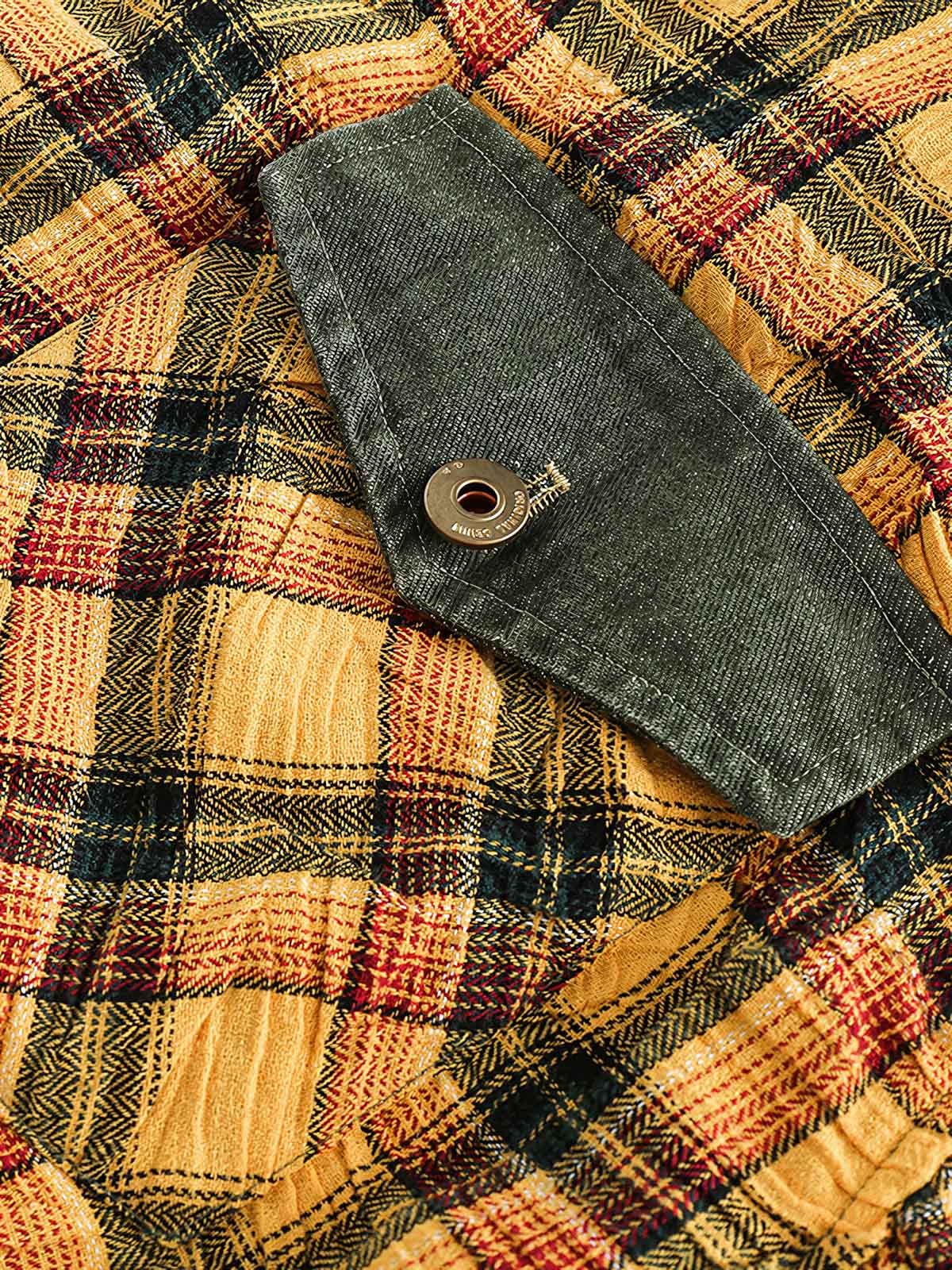 柔らかくて耐久性のあるチェック生地を使用しており、コントラストカラーの襟と袖口のパッチワークデザインが視覚効果を高めています。実用的なフロントポケットとサイドポケットは装飾と機能を兼ね備え、小物の持ち運びに便利です。全体の色合いとデザインのディテールが、レトロなワークウェアスタイルの特別な魅力を表現しています。