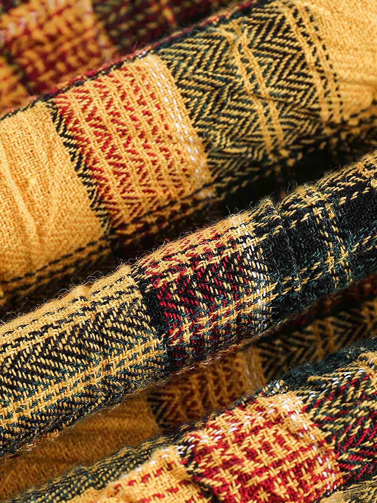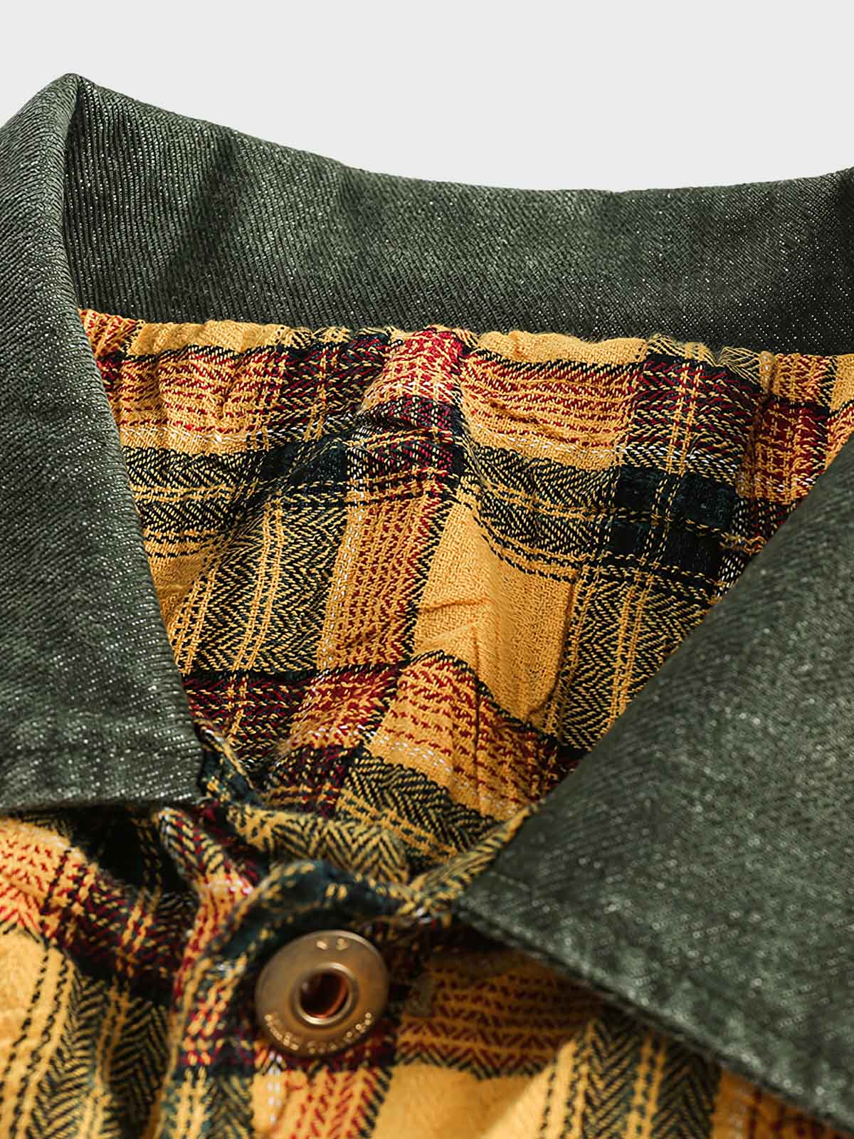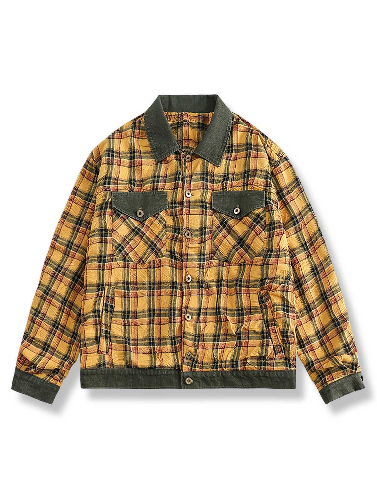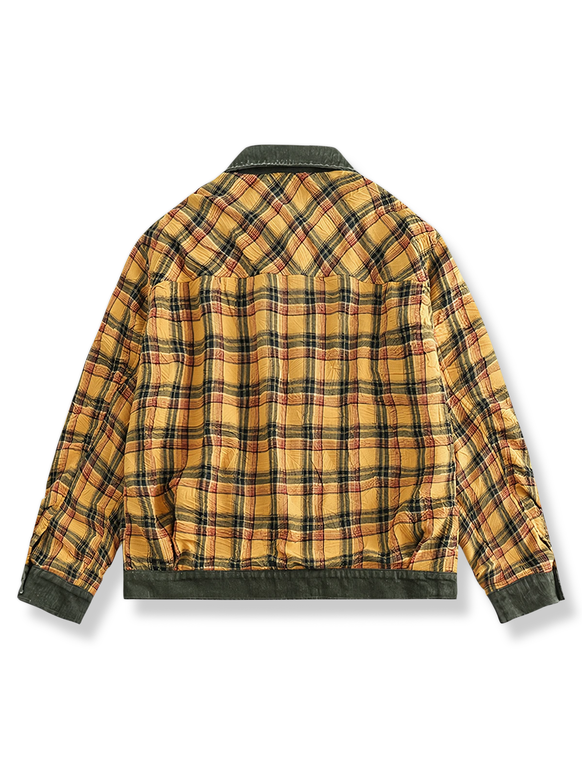 柔らかくて耐久性のあるチェック生地を使用しており、コントラストカラーの襟と袖口のパッチワークデザインが視覚効果を高めています。実用的なフロントポケットとサイドポケットは装飾と機能を兼ね備え、小物の持ち運びに便利です。全体の色合いとデザインのディテールが、レトロなワークウェアスタイルの特別な魅力を表現しています。