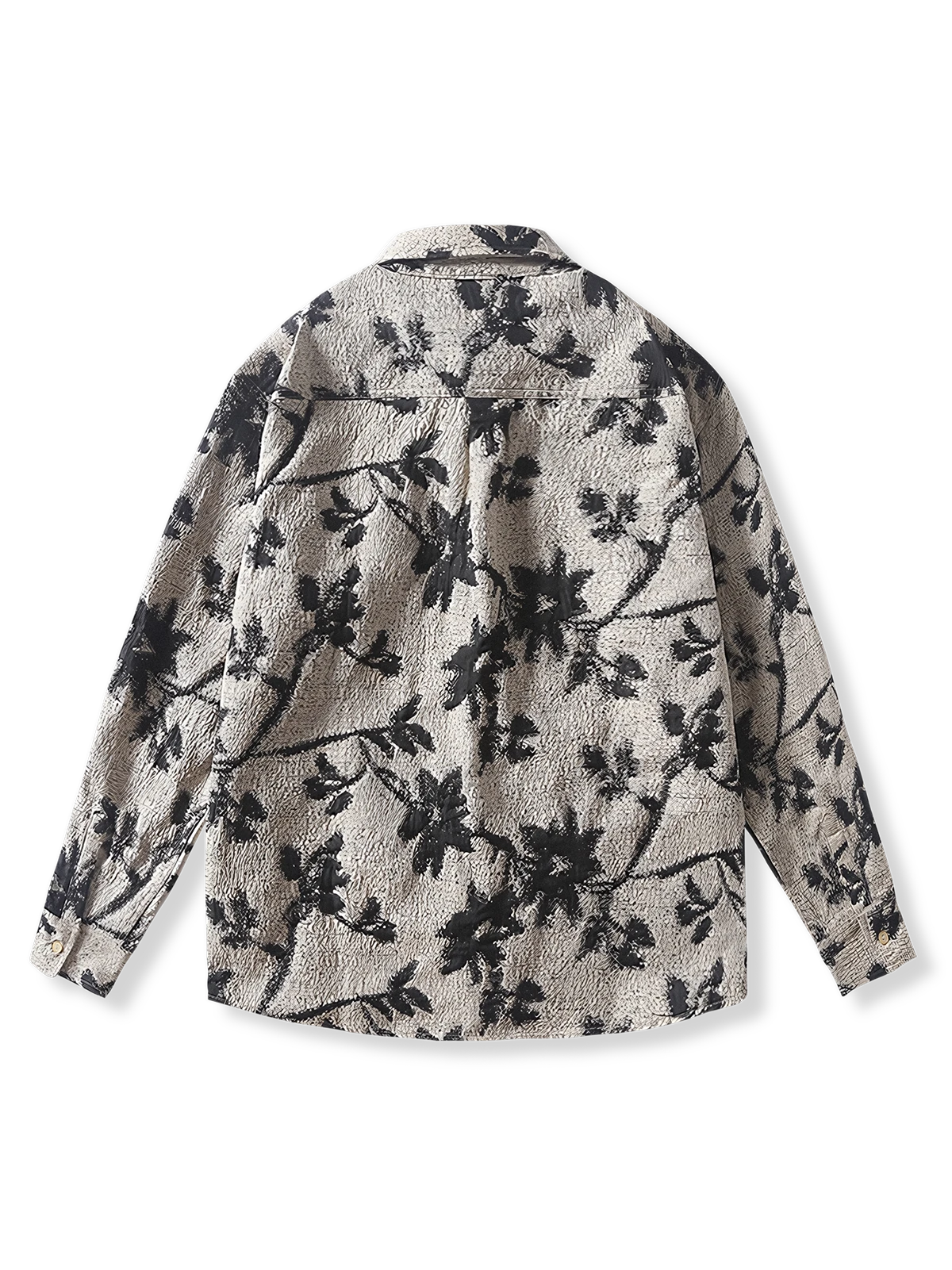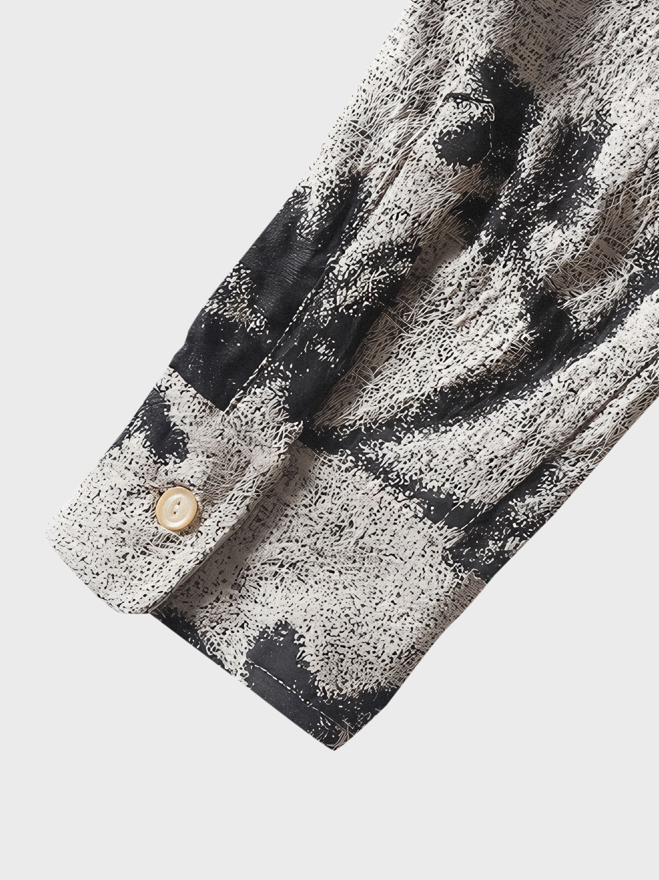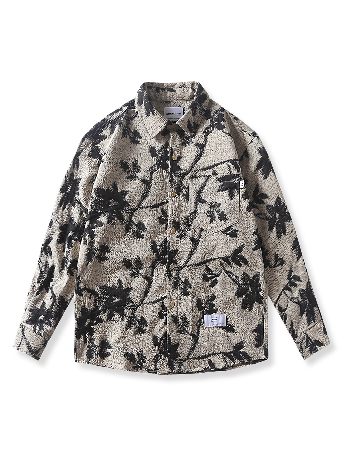 水墨風の図案が特徴の、ゆったり型のシャツが登場しました。あっさりとした水墨画風の迫力ある植物柄が目を引き、フロントから背面にかけてシブく描かれています。左胸にはポケットが付いており、小物を持ち運ぶのに便利なディテールも兼ね備えています。