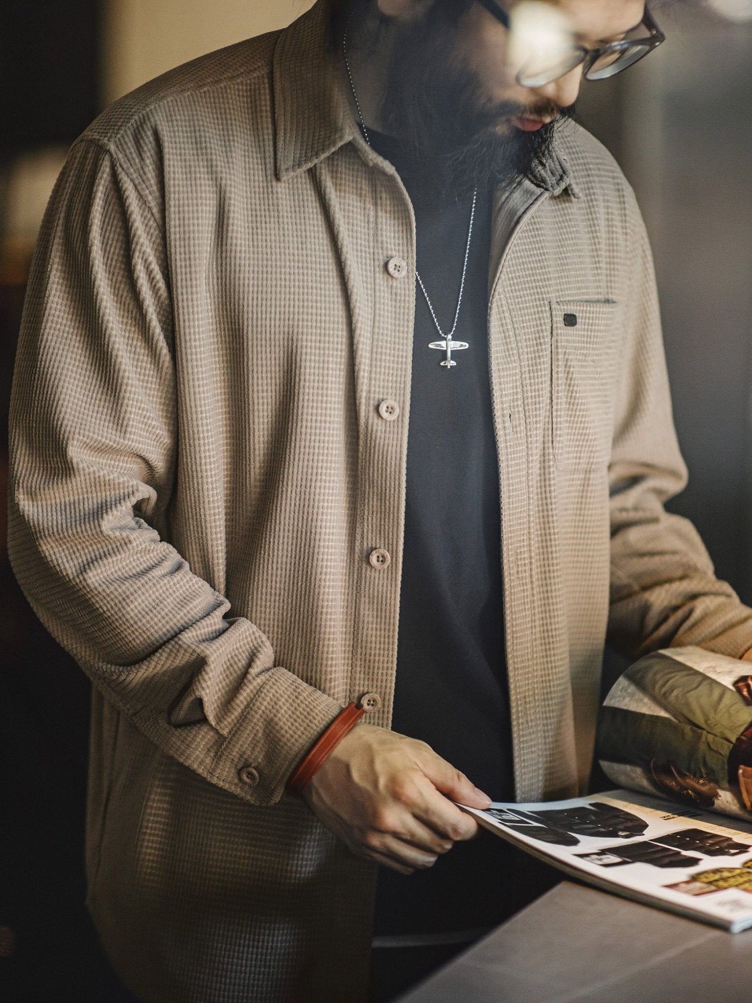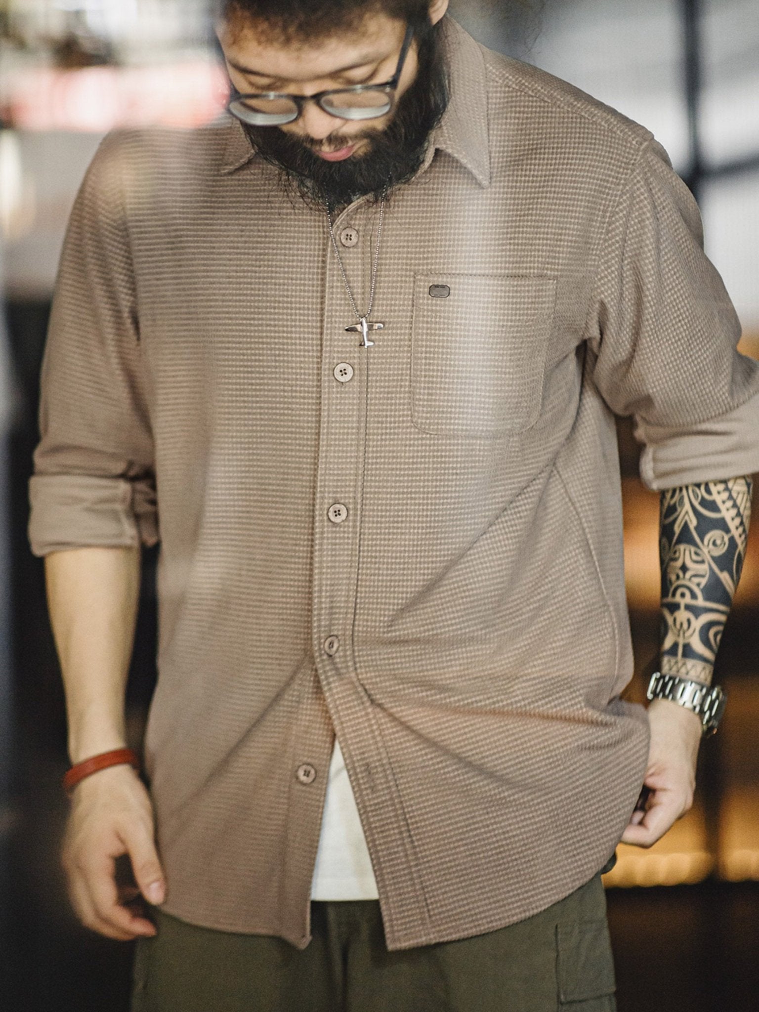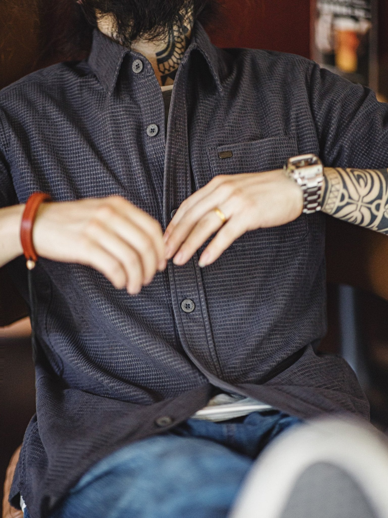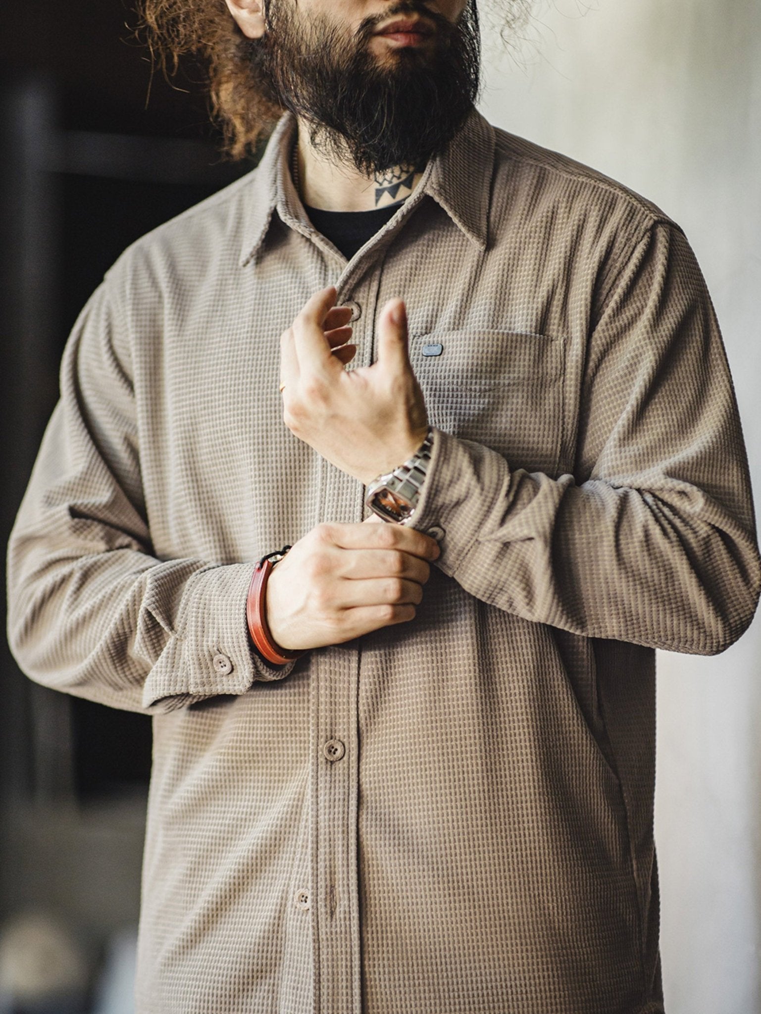 このシャツは、小さなブロック状の生地を使用し、3D効果を持たせています。多次元の編み込み技術によって規則正しい凹凸感とふわふわの質感が生まれ、そのディテールにはレトロな金属のポケットラベルがあります。さらに、ボタンのテクスチャも異なり、細部にこだわりが感じられ、ファッションと品位を引き立てています。