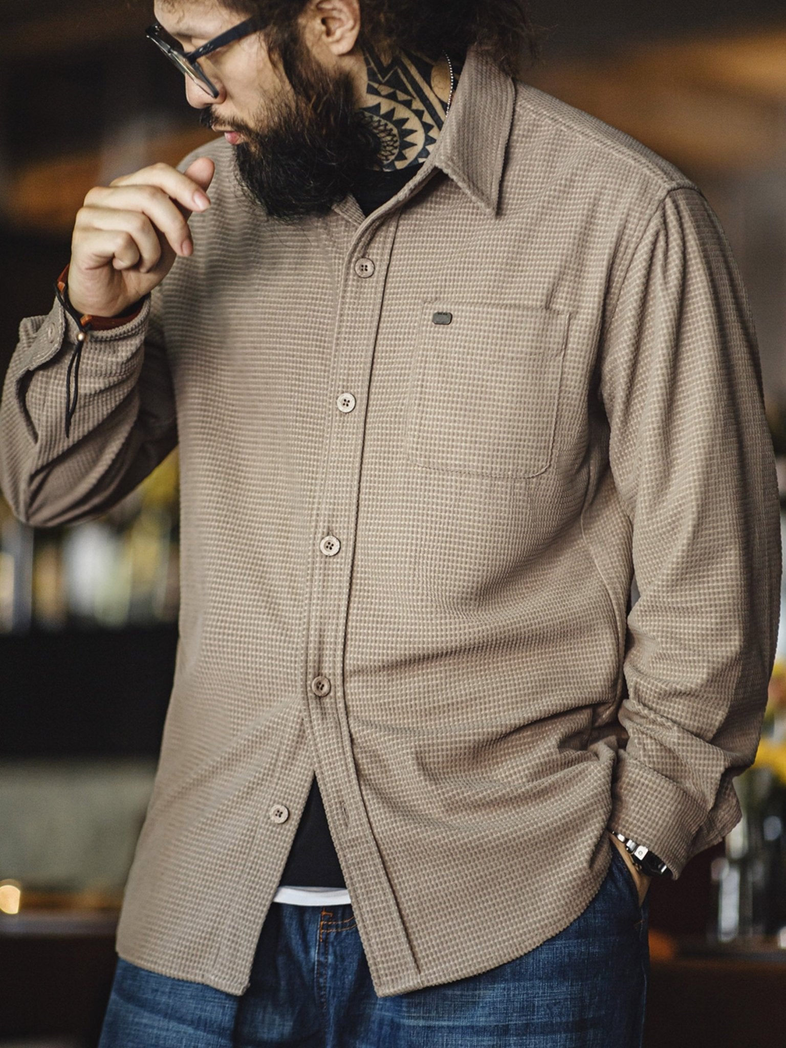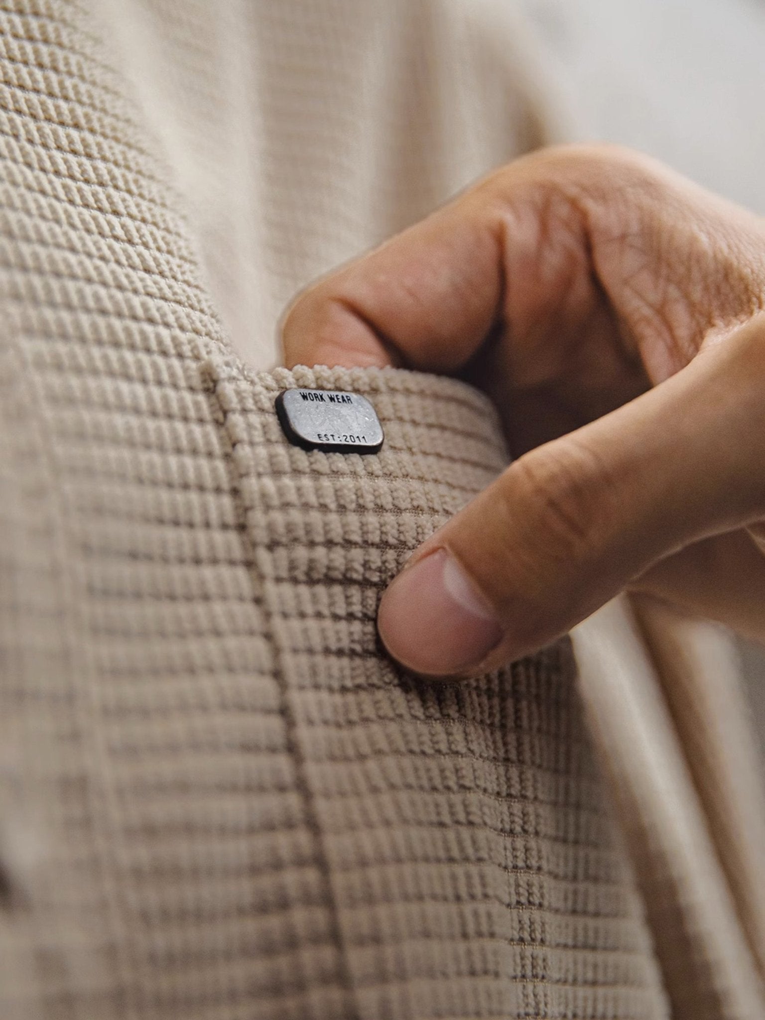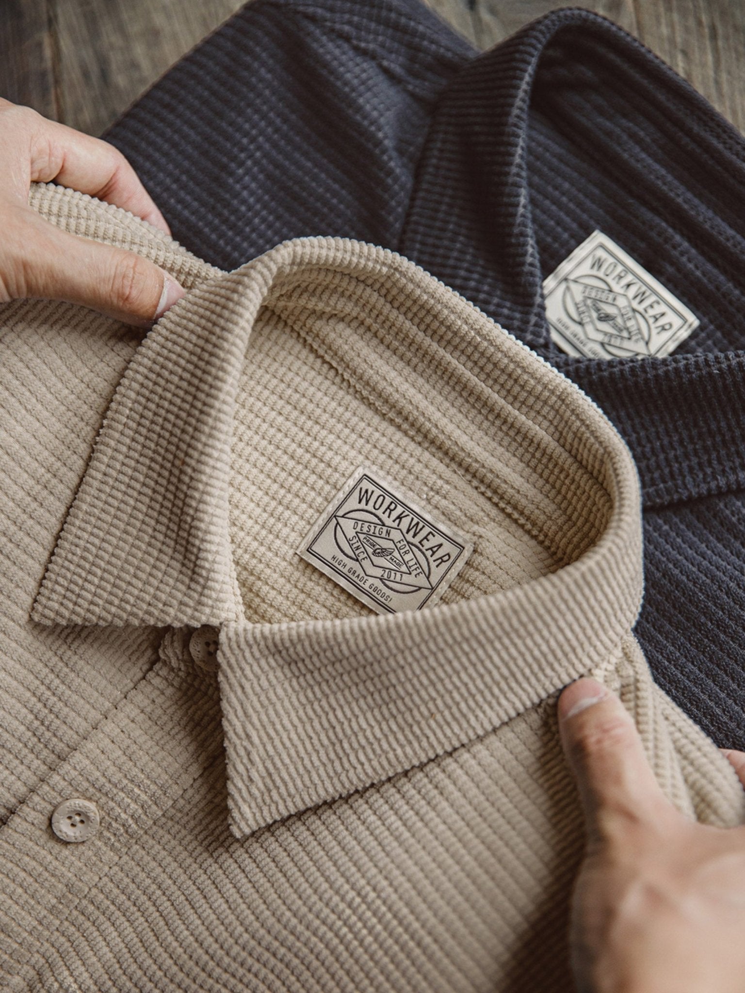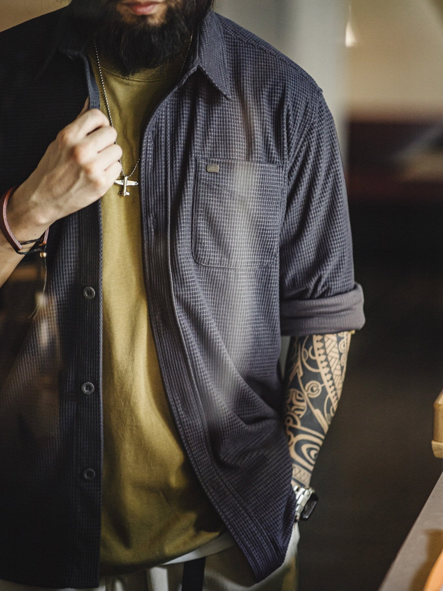 このシャツは、小さなブロック状の生地を使用し、3D効果を持たせています。多次元の編み込み技術によって規則正しい凹凸感とふわふわの質感が生まれ、そのディテールにはレトロな金属のポケットラベルがあります。さらに、ボタンのテクスチャも異なり、細部にこだわりが感じられ、ファッションと品位を引き立てています。