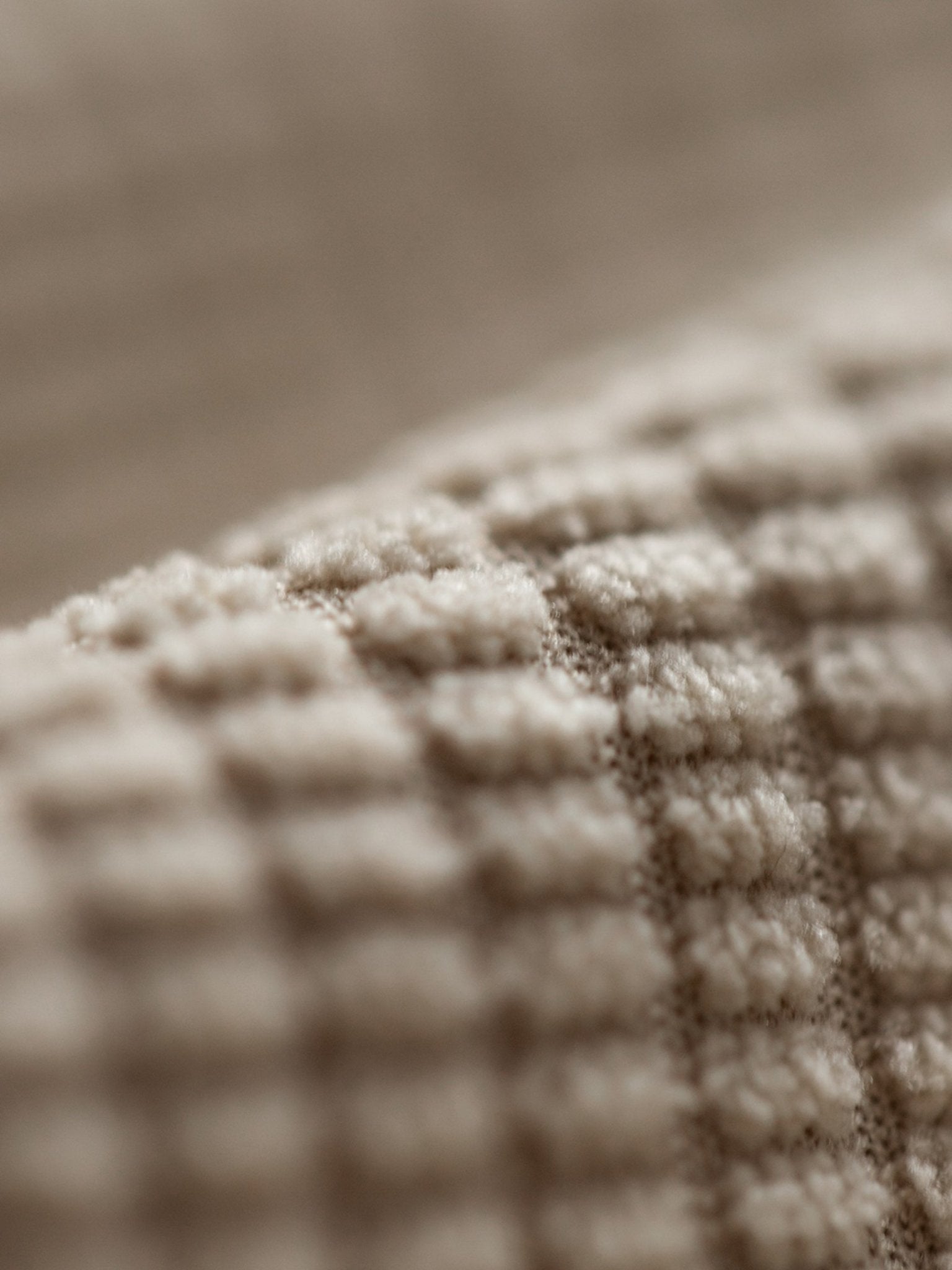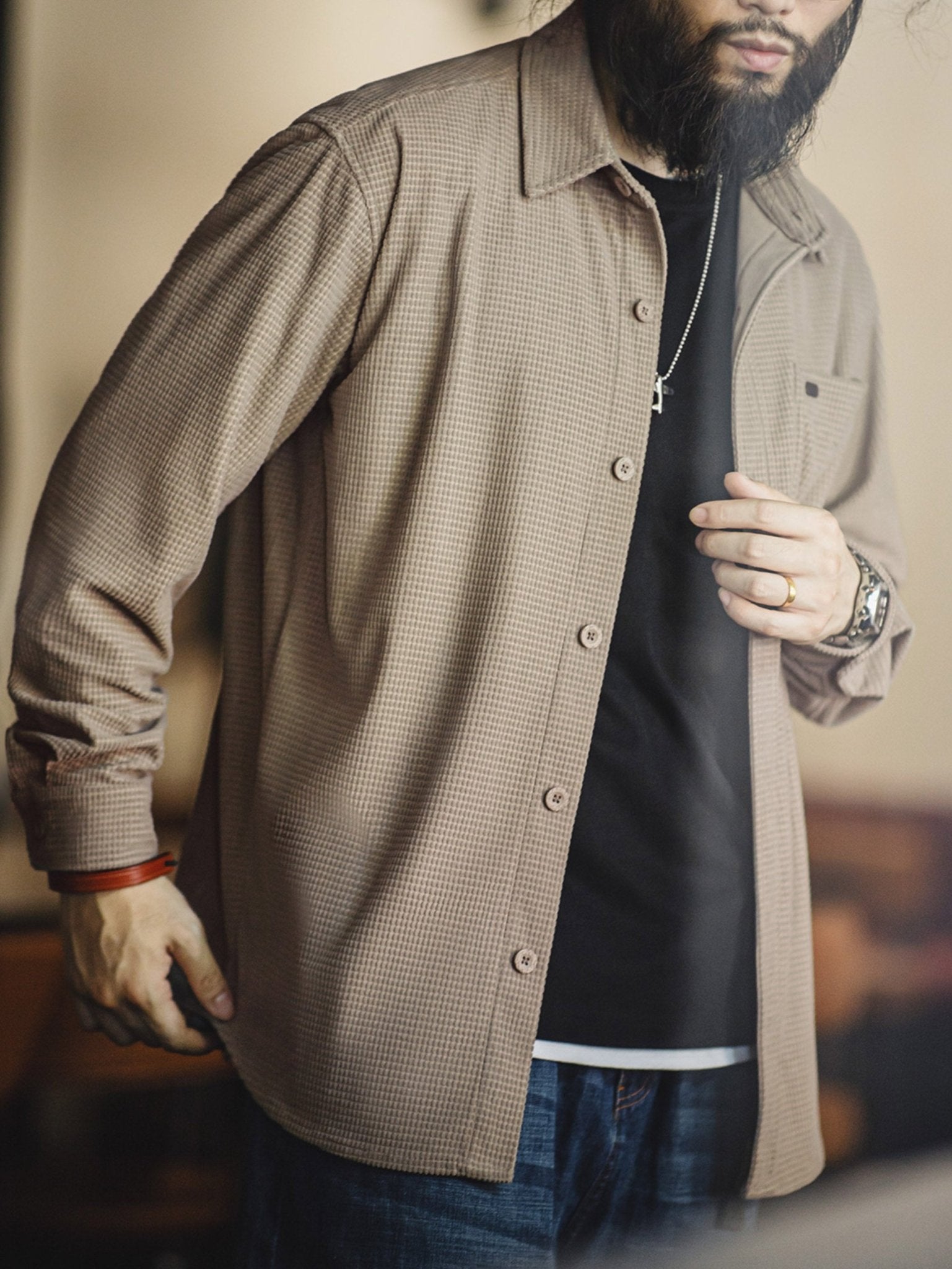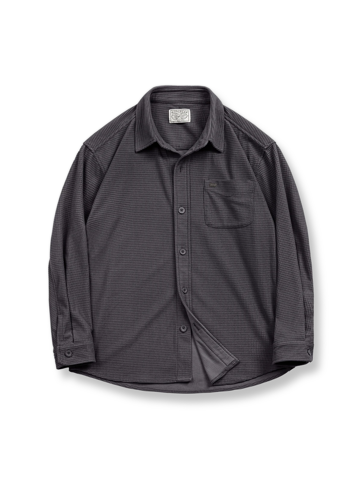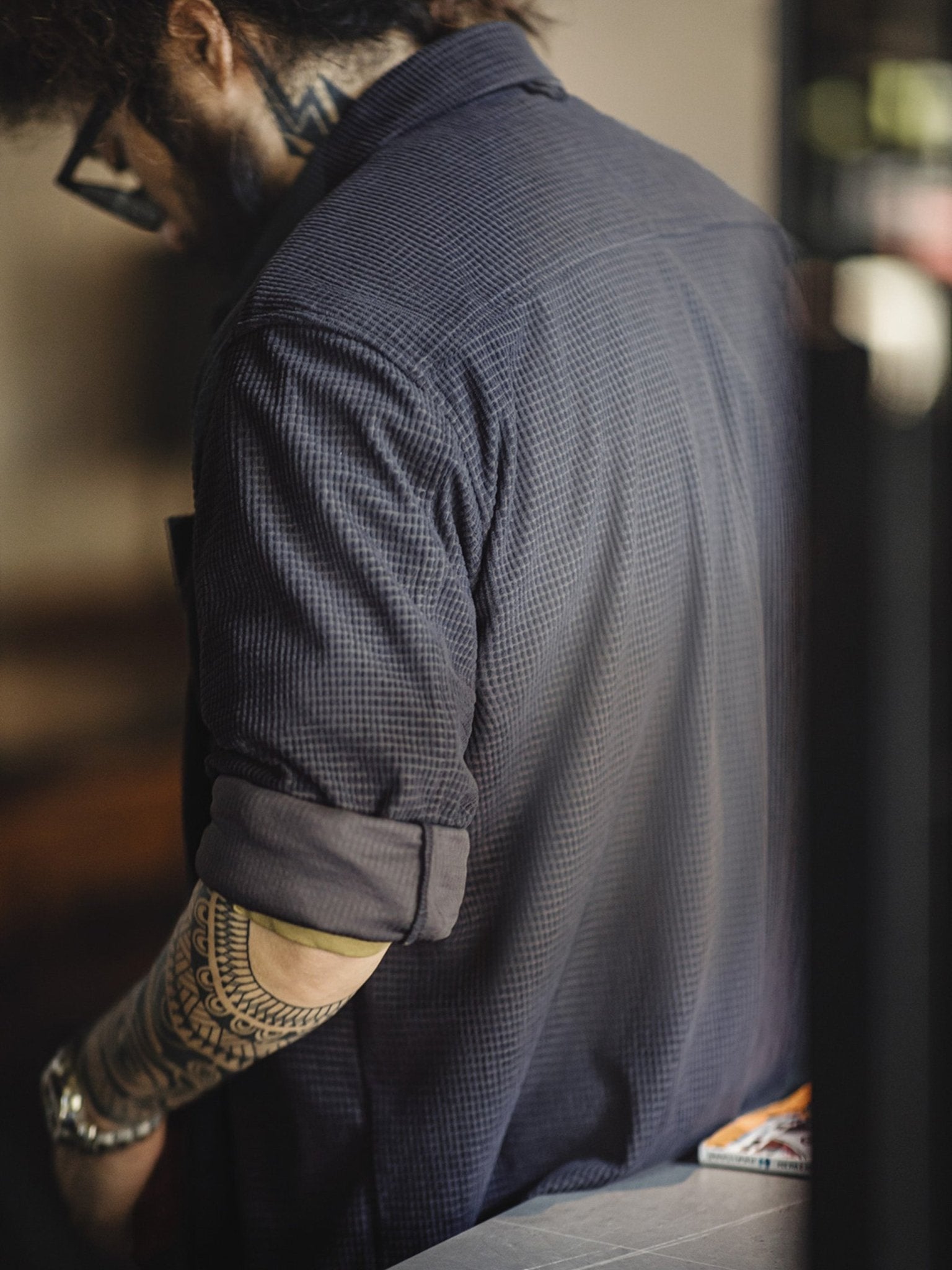 このシャツは、小さなブロック状の生地を使用し、3D効果を持たせています。多次元の編み込み技術によって規則正しい凹凸感とふわふわの質感が生まれ、そのディテールにはレトロな金属のポケットラベルがあります。さらに、ボタンのテクスチャも異なり、細部にこだわりが感じられ、ファッションと品位を引き立てています。