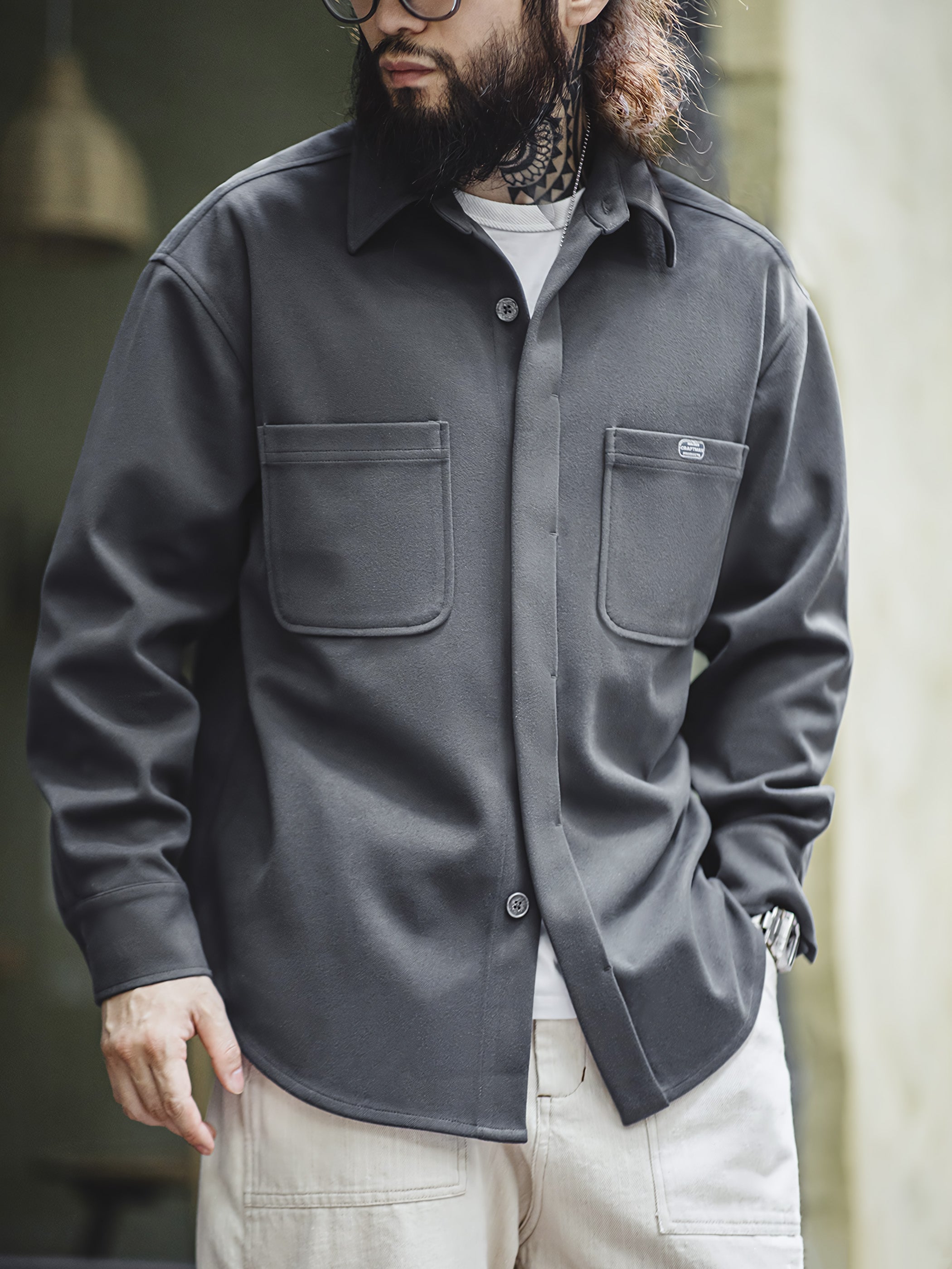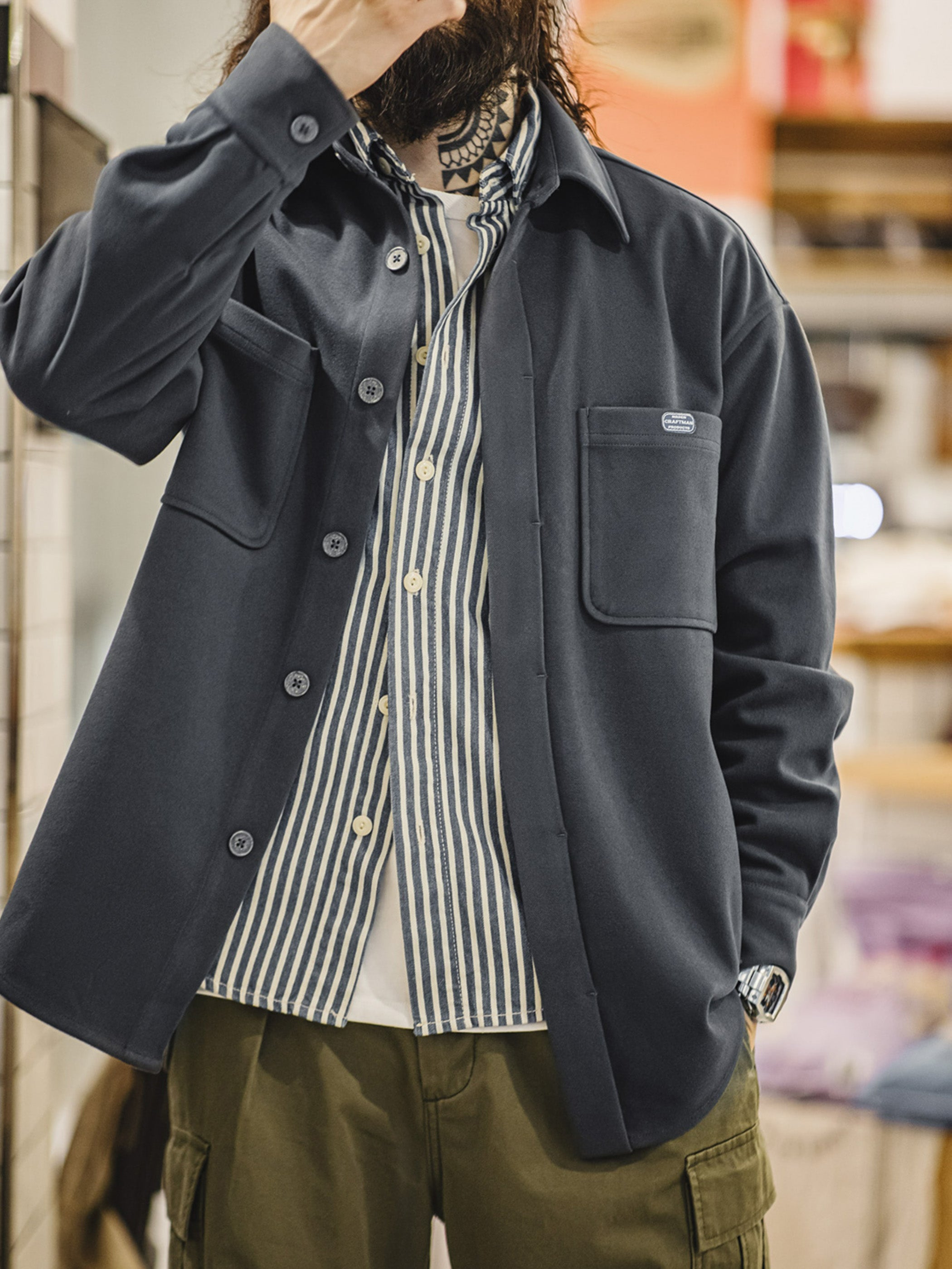 ゆったりとしたシルエットは、着るだけで程よいリラックス感を演出します。オーバーシャツ特有のボリューム感により、着脱時に動きがあり、奥行きのあるコーディネートを楽しむことができます。