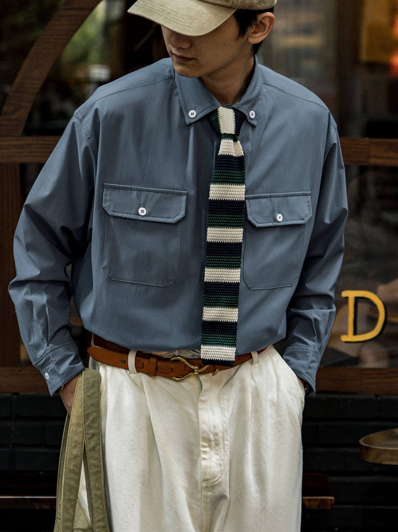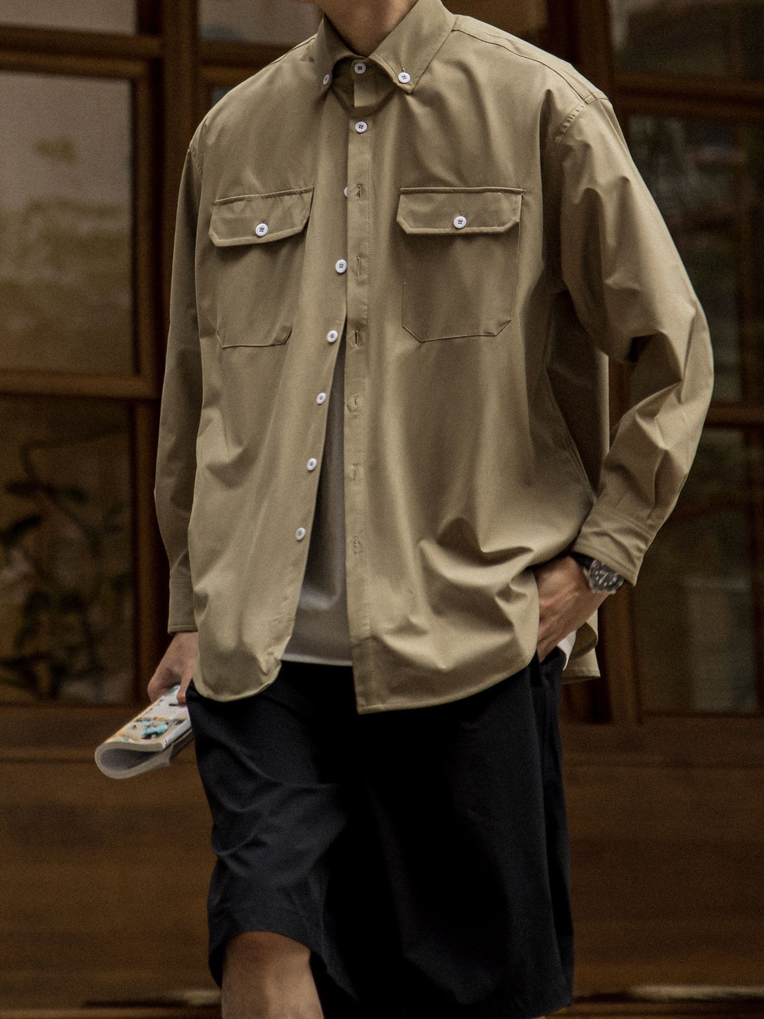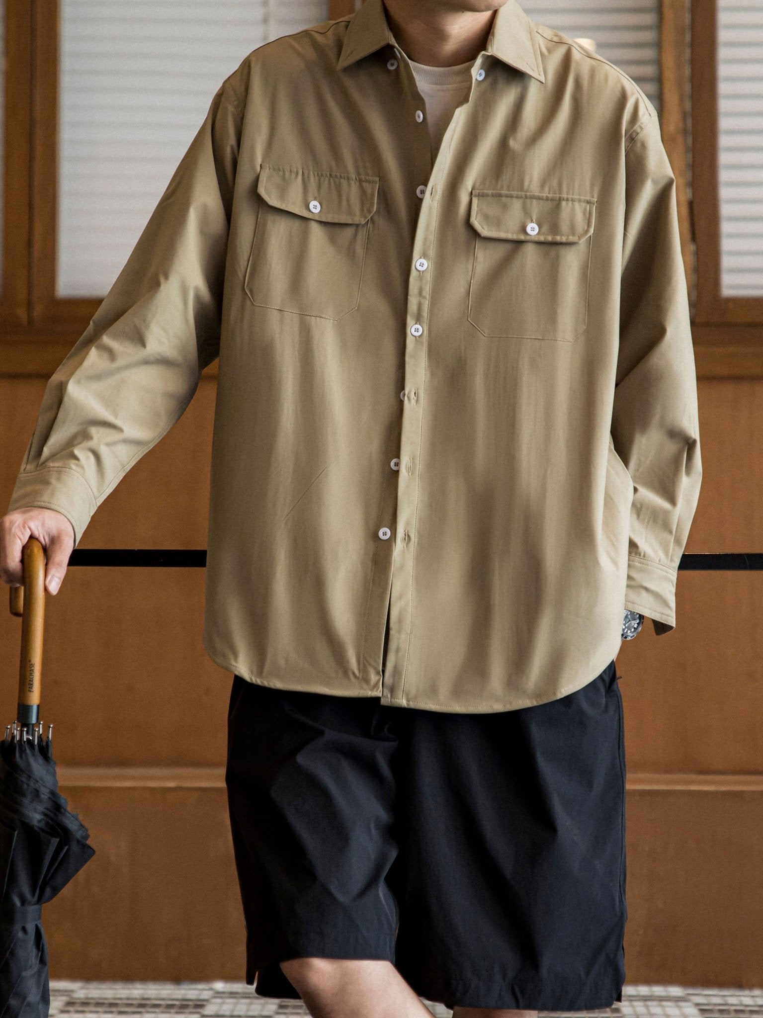 このシャツは、特殊なテフロン加工を施した生地を使用し、透気性を損なうことなく防水、防油、防汚の「三防特性」を実現しています。シンプルで実用的なデザインに、二つのポケットが施されています。