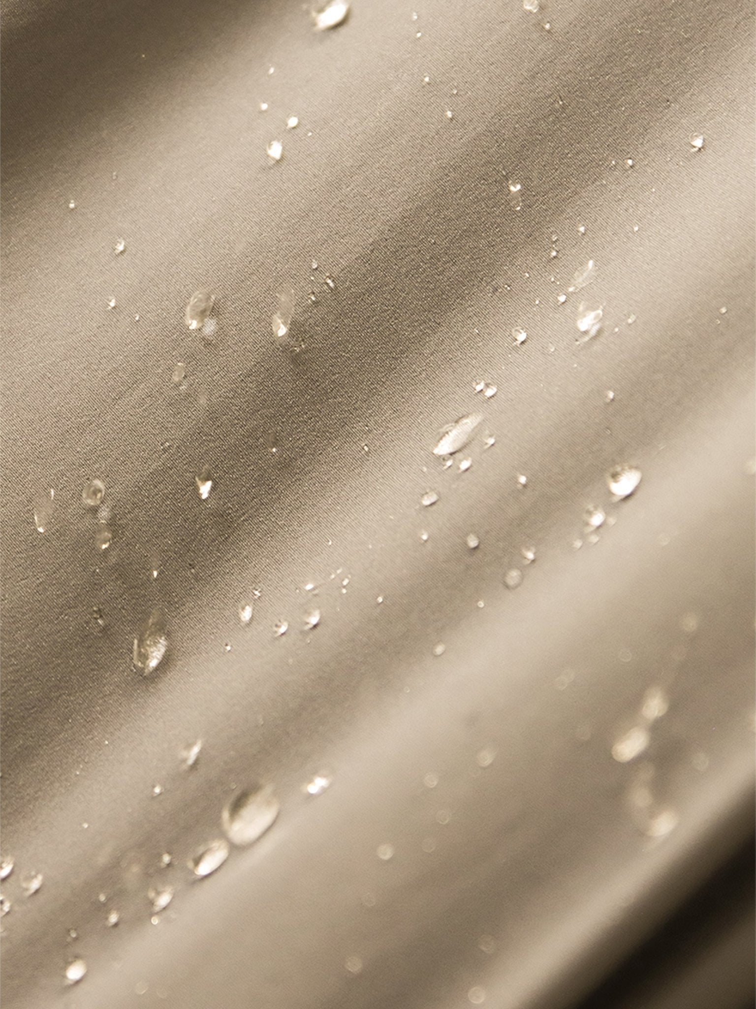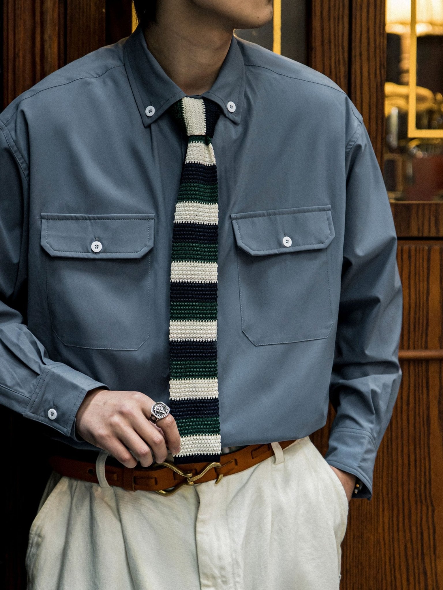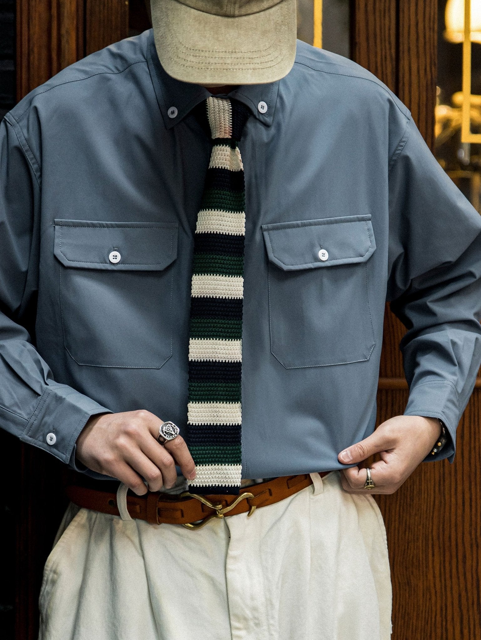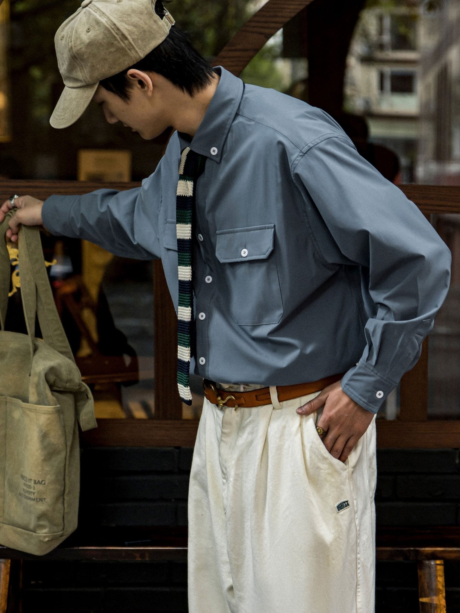 このシャツは、特殊なテフロン加工を施した生地を使用し、透気性を損なうことなく防水、防油、防汚の「三防特性」を実現しています。シンプルで実用的なデザインに、二つのポケットが施されています。
