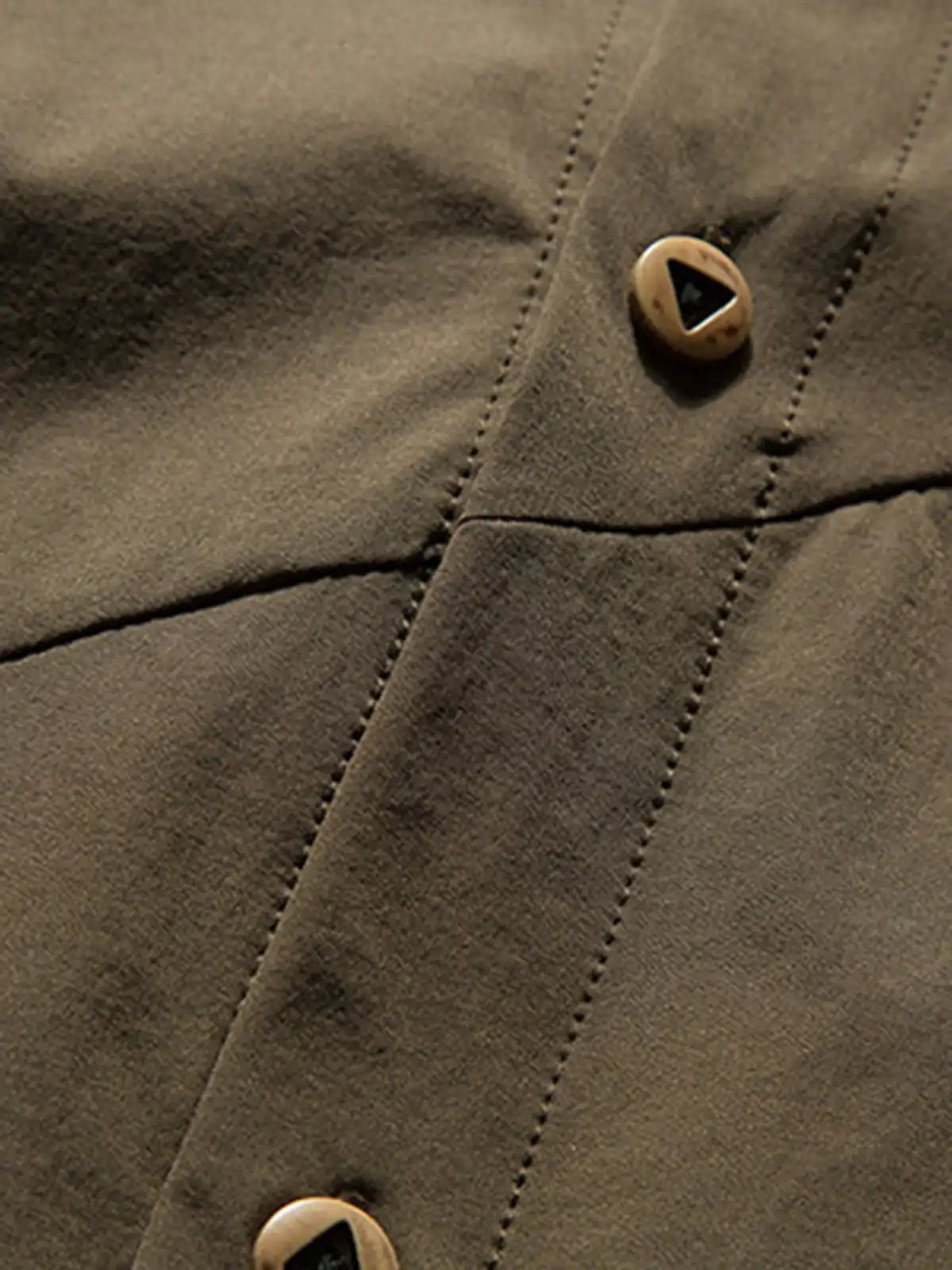 複数パネルのパッチワーク風デザインと隠しジップポケットが特徴の、ゆったりシルエットのコットンシャツ。