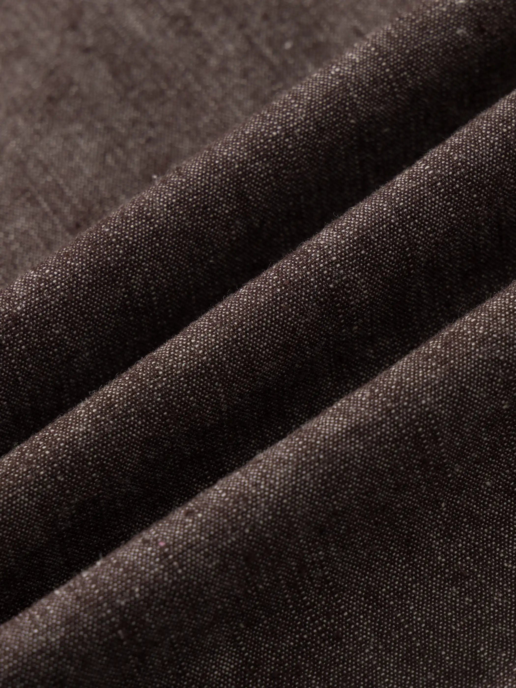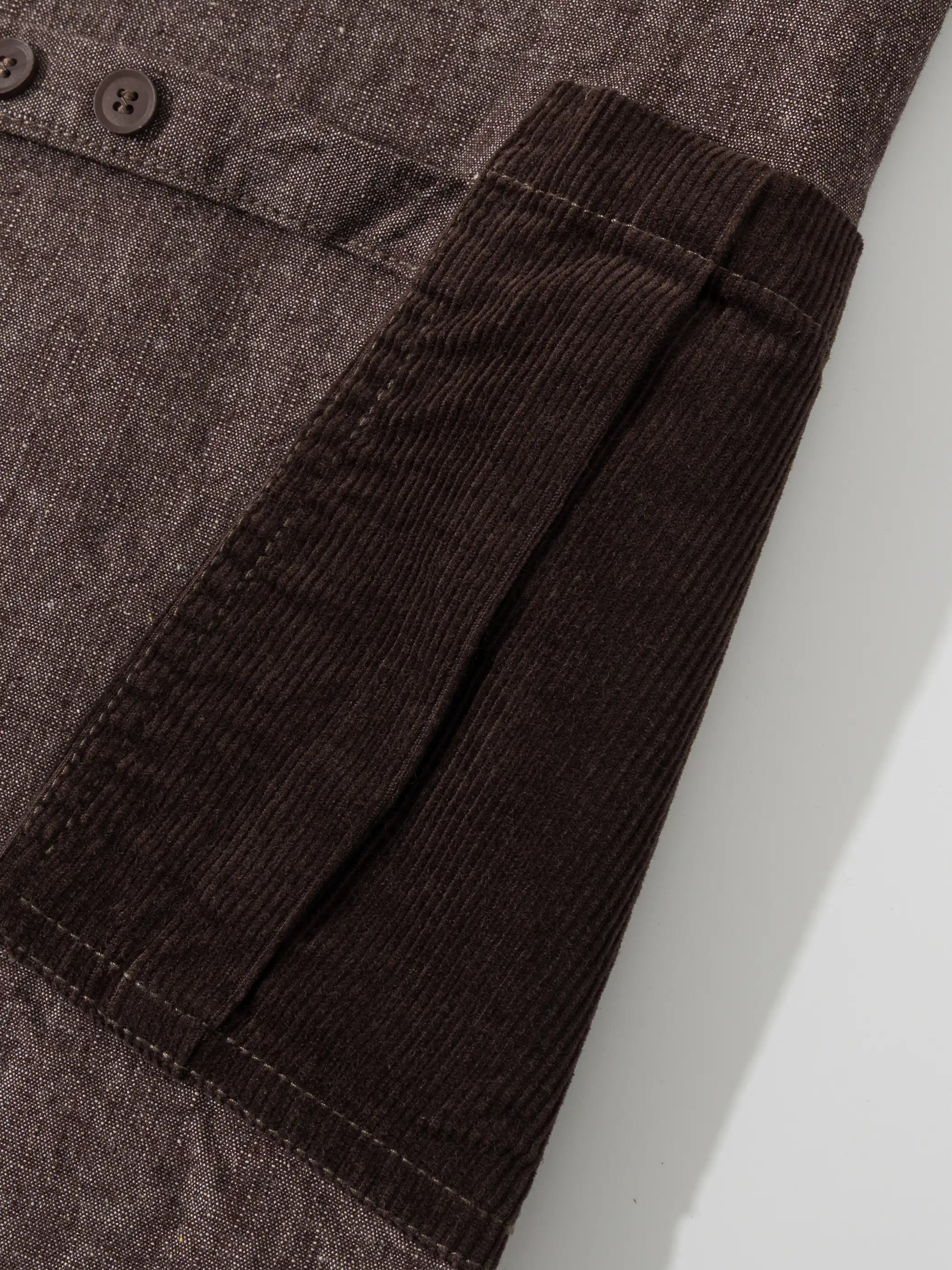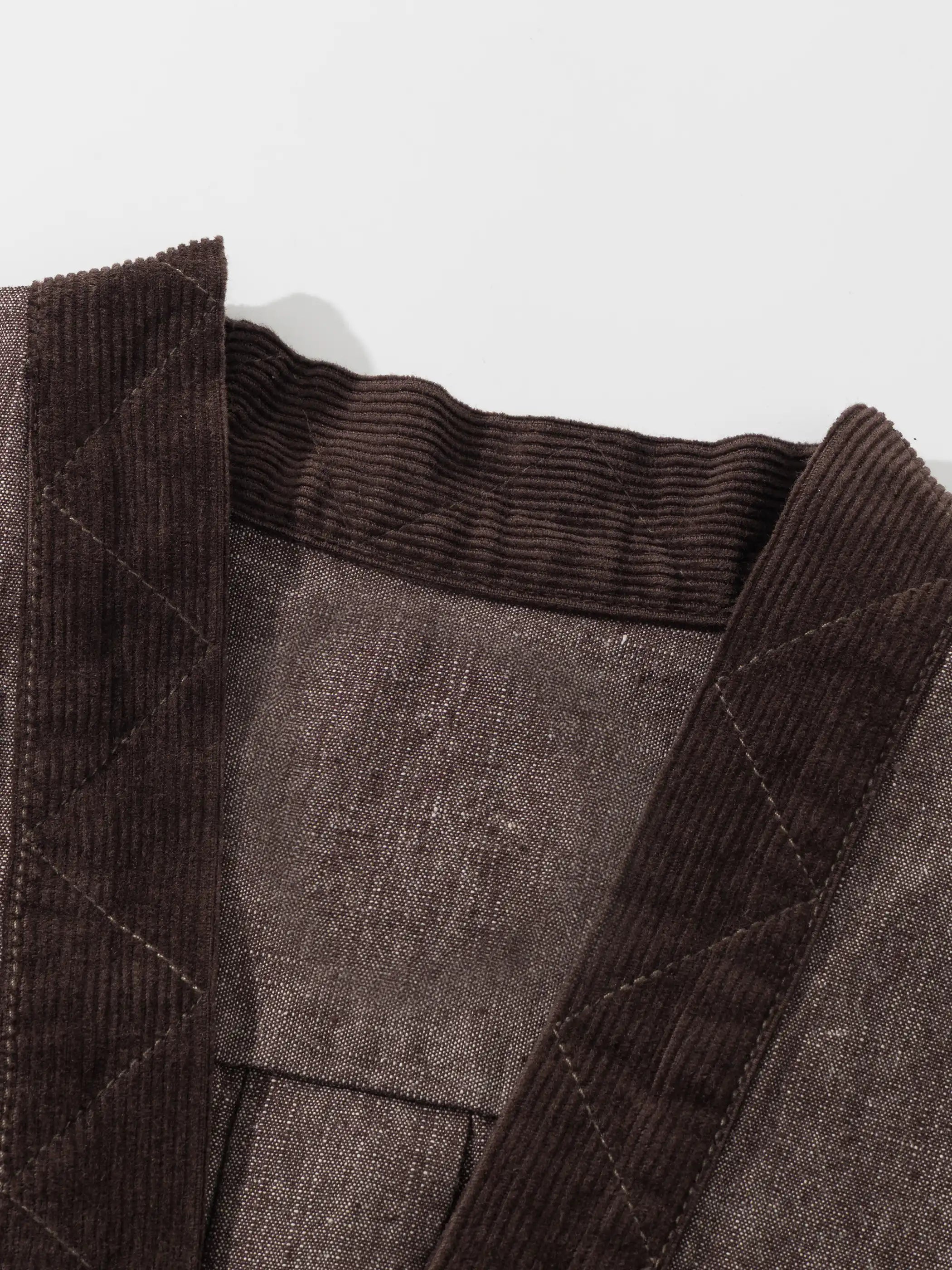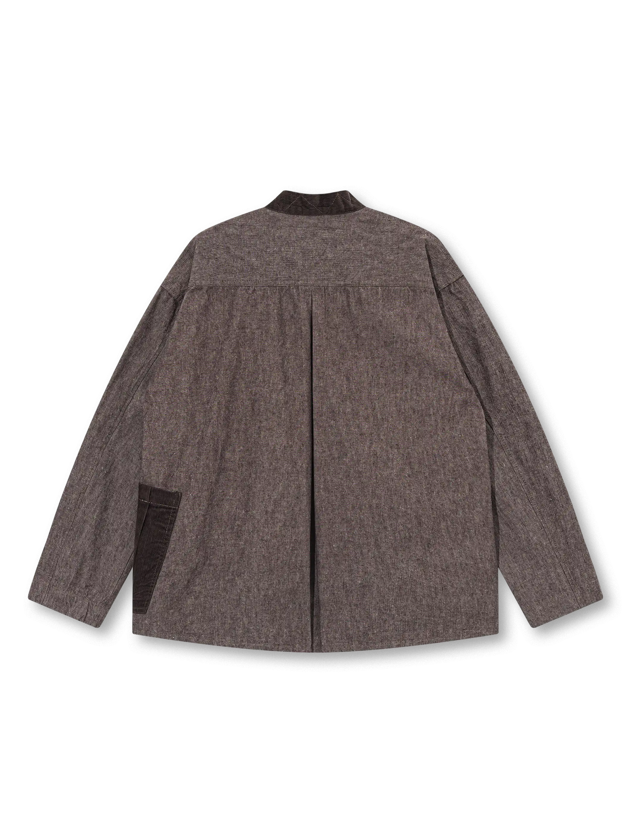 日本の野良着とビンテージのチョアコートを思わせるパッチワークポケットが随所に配され、裾にかけてゆるやかに広がるシルエットは重ね着を前提に設計。ゆったりした身幅と上品なノーカラーで、ミリタリーテイストとモダンストリートの狭間を行き来します。コーディネートはシンプルな白Tシャツにデニムを合わせるだけで完成。着込むほどに柔らかく表情を増す90%コットン×10%ポリエステルの中厚生地は、ヴィンテージの風合いを長く楽しめます。