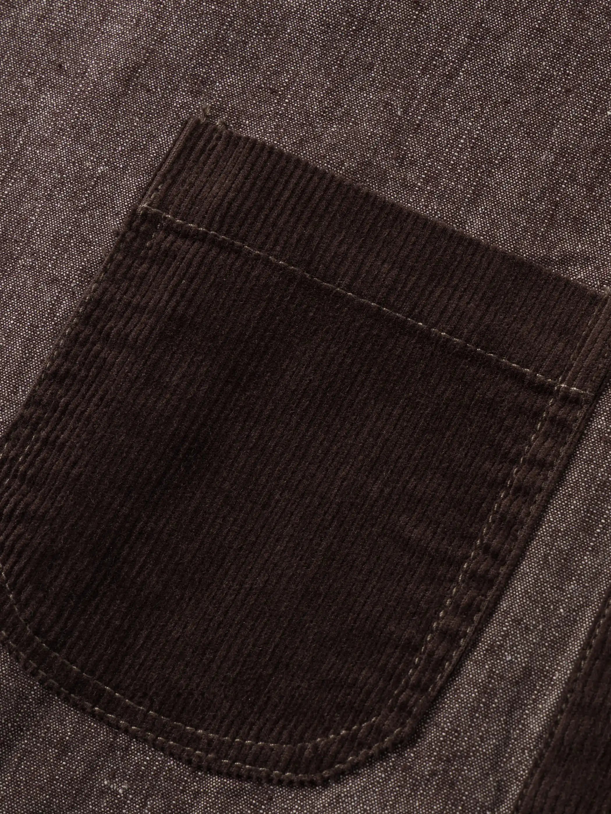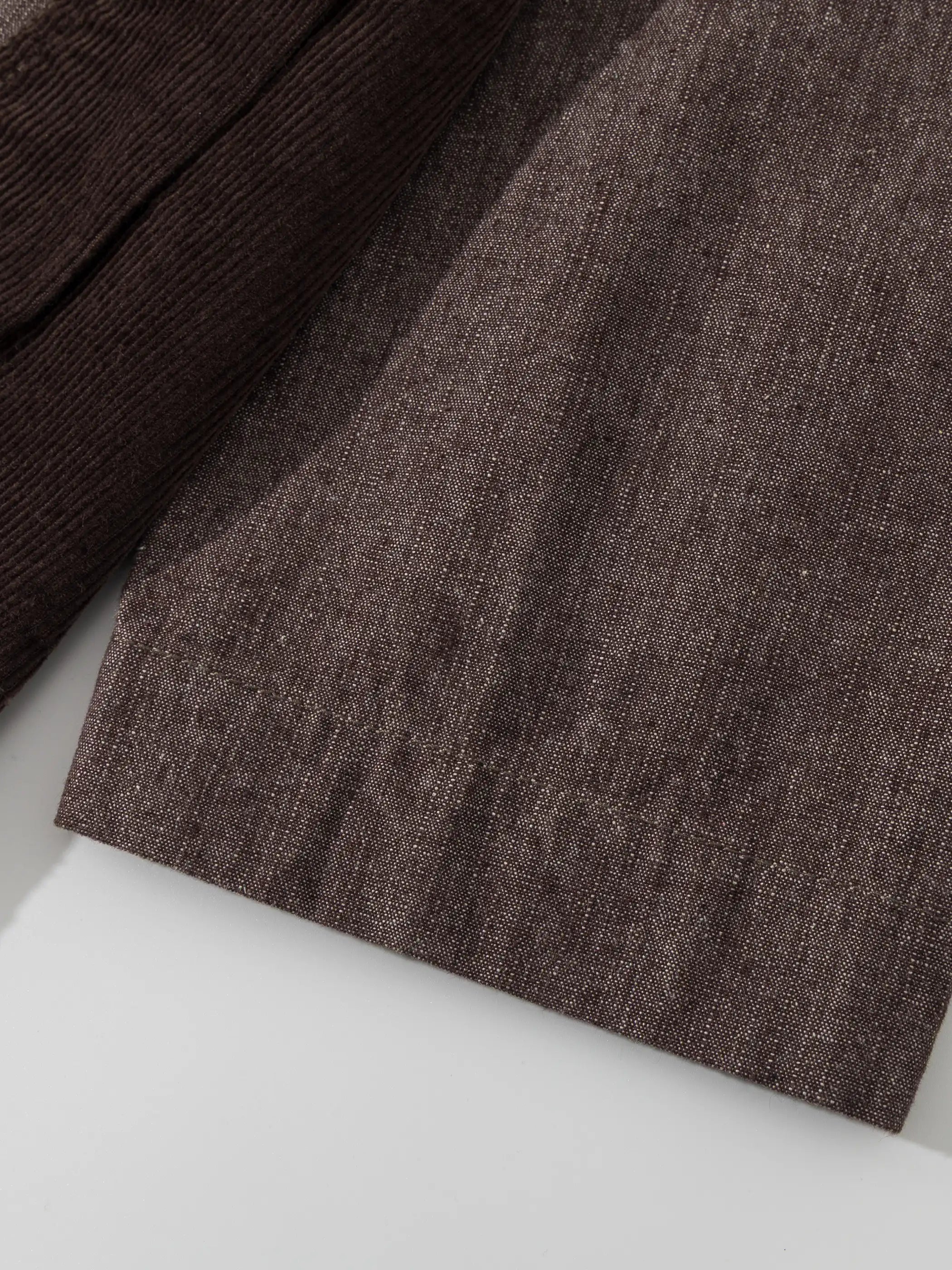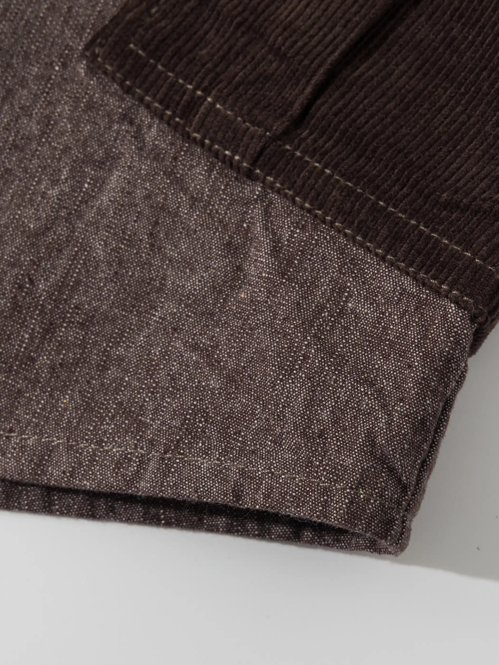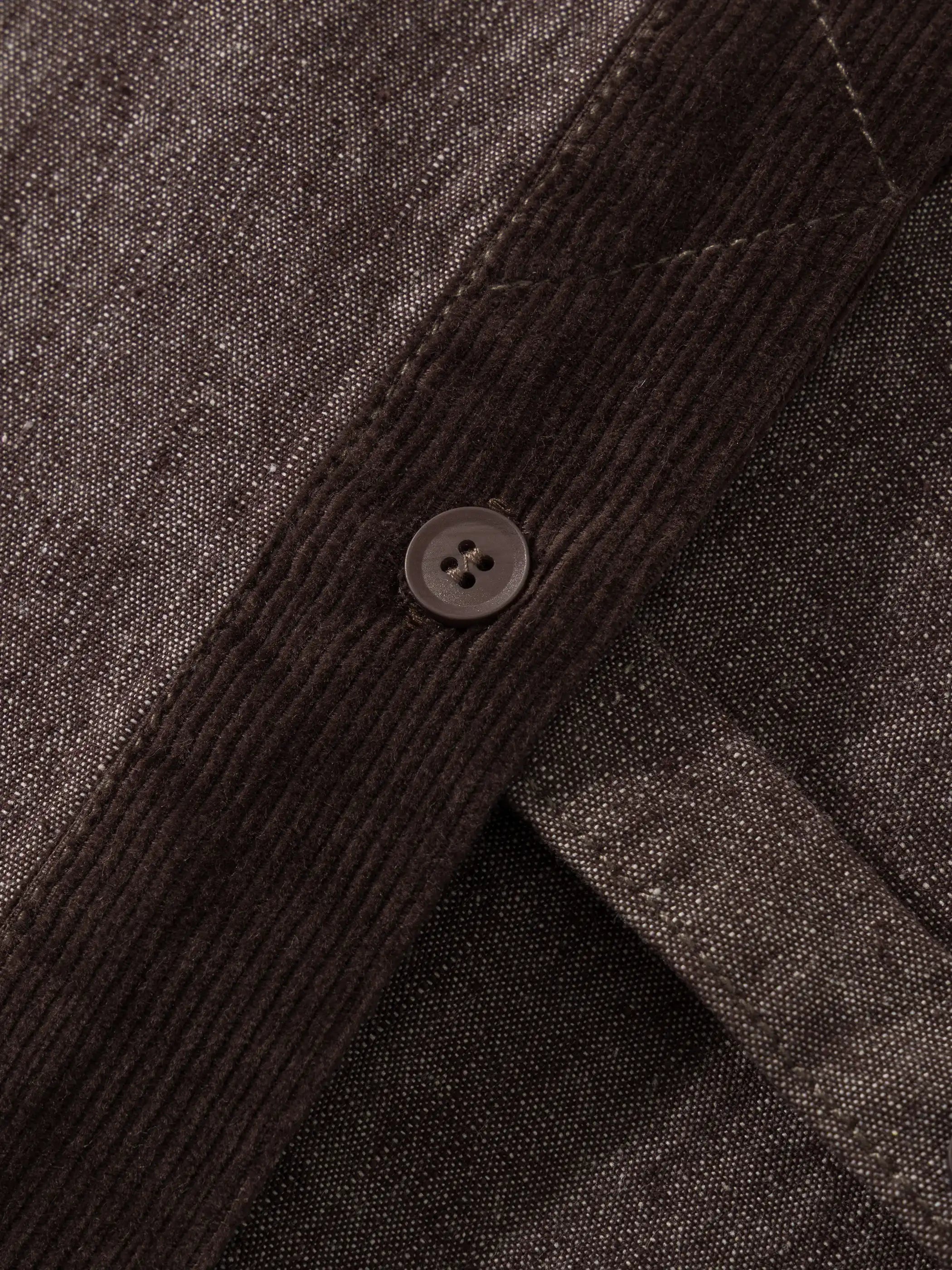 日本の野良着とビンテージのチョアコートを思わせるパッチワークポケットが随所に配され、裾にかけてゆるやかに広がるシルエットは重ね着を前提に設計。ゆったりした身幅と上品なノーカラーで、ミリタリーテイストとモダンストリートの狭間を行き来します。コーディネートはシンプルな白Tシャツにデニムを合わせるだけで完成。着込むほどに柔らかく表情を増す90%コットン×10%ポリエステルの中厚生地は、ヴィンテージの風合いを長く楽しめます。