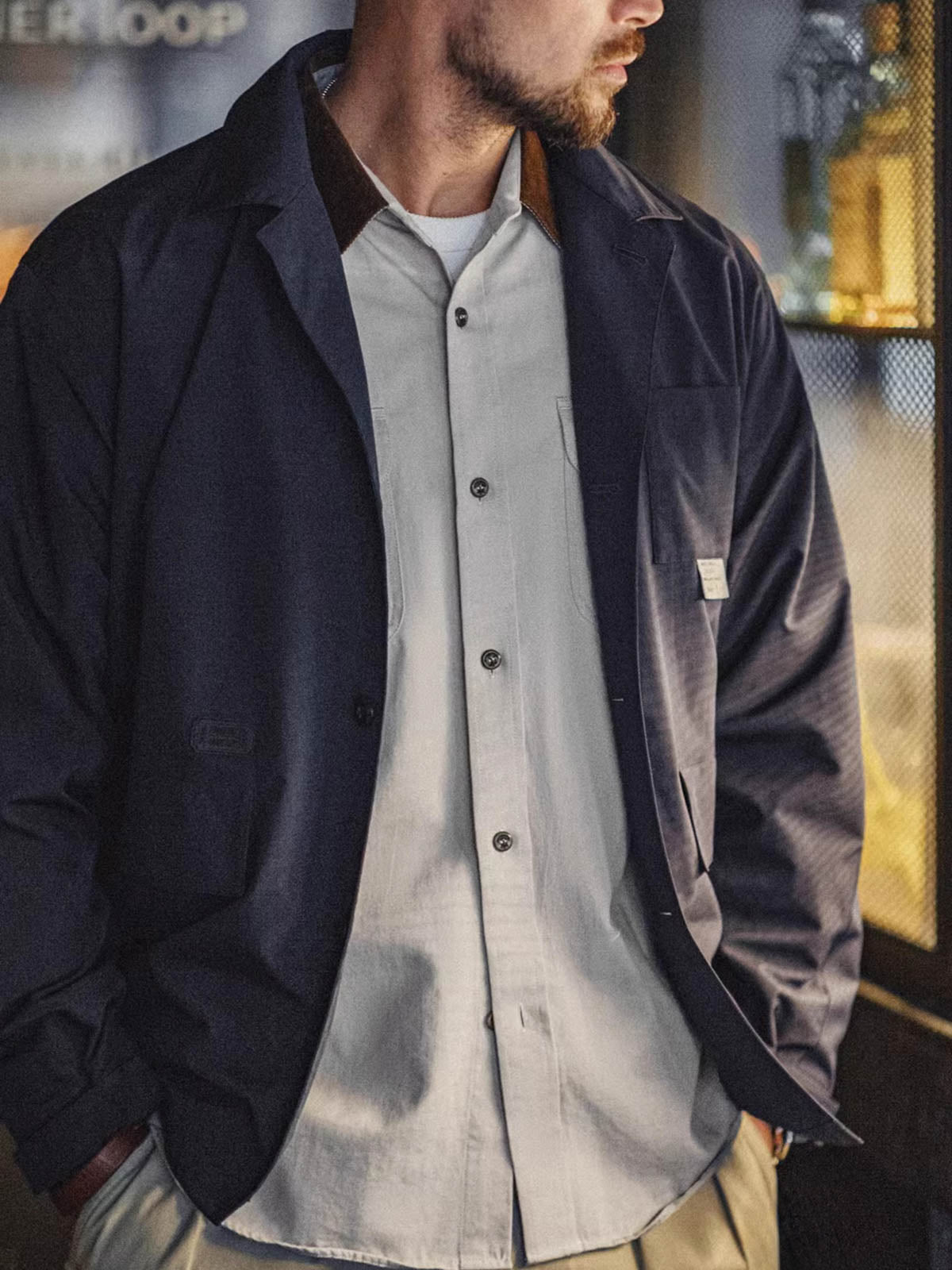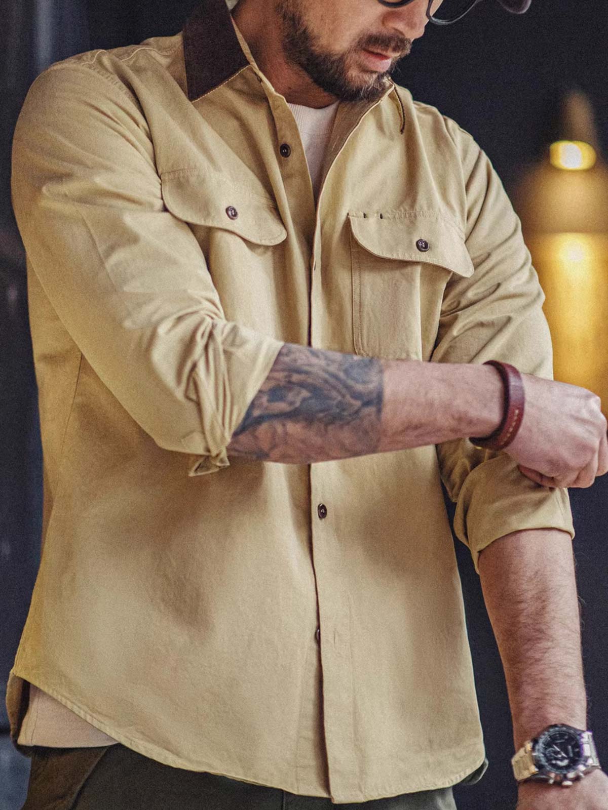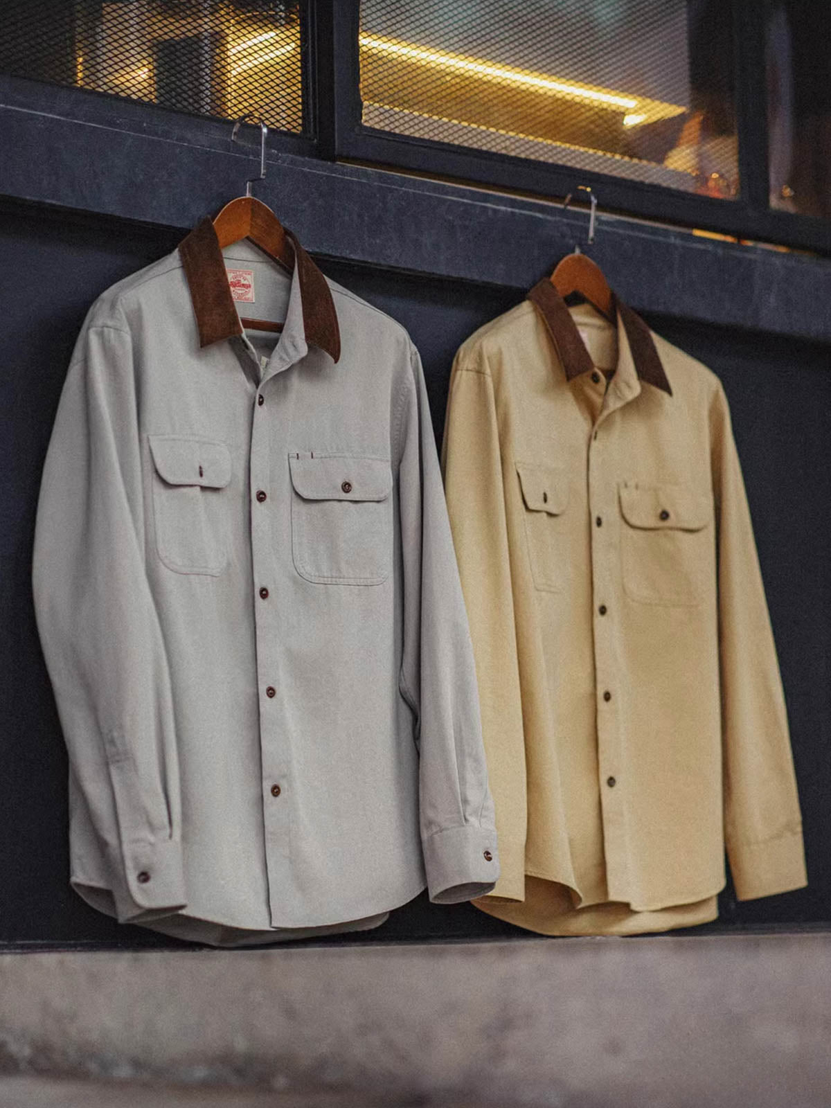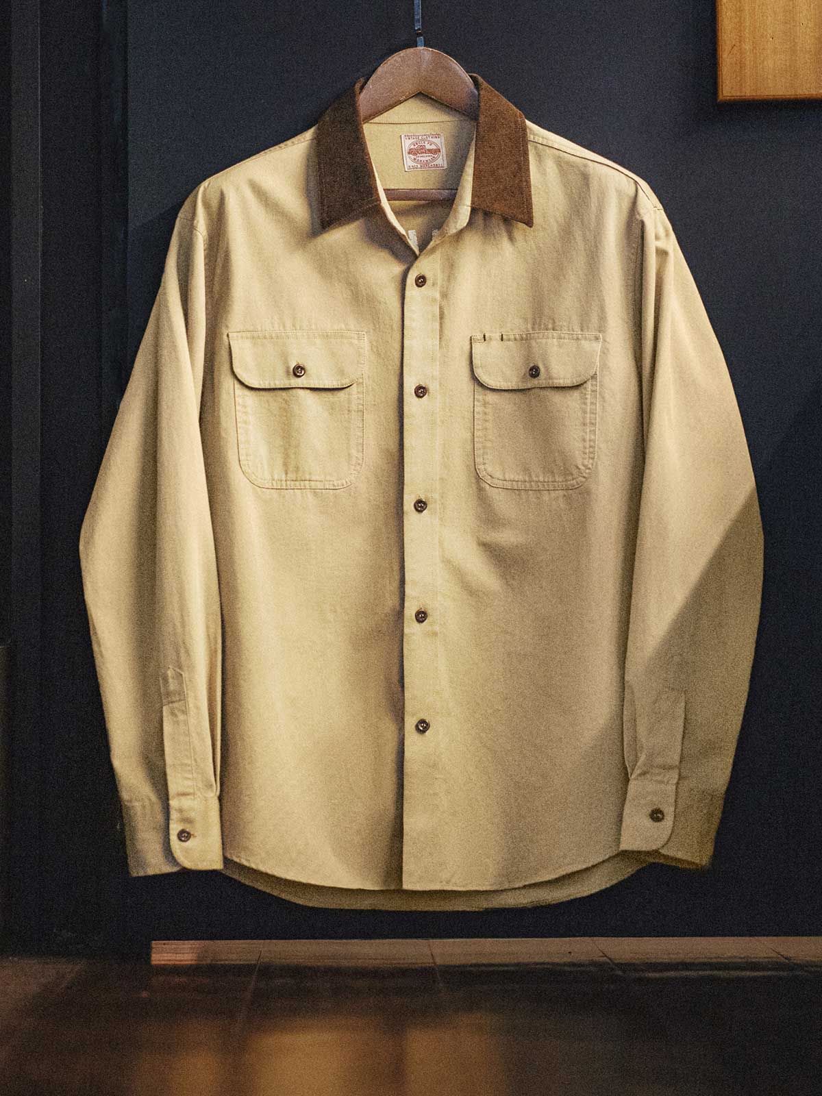 このシャツは、伝統的なワークウェアのデザインにモダンなタッチを加えたアイテムです。襟のデザインには、猟装ジャケットからインスパイアされたコーデュロイのコンビが施されており、クラシックなワークシャツのシルエットと融合されています。このようなデザインのミックスは、アイテムに独特のレトロな雰囲気を与えています。