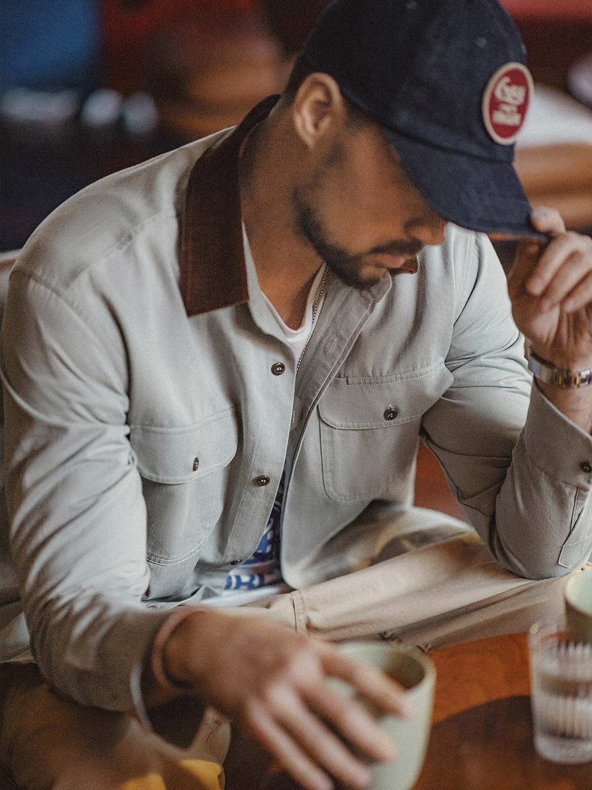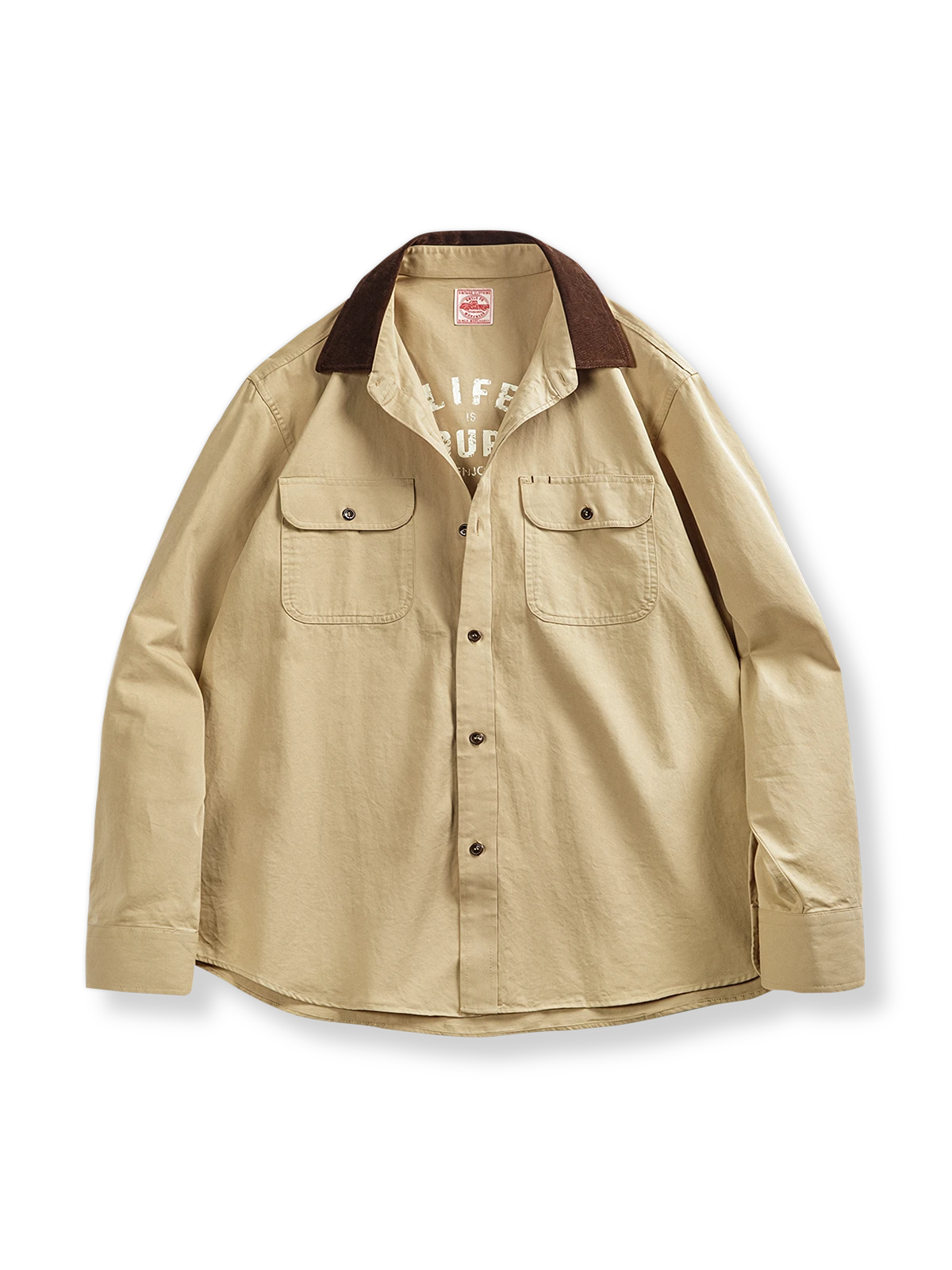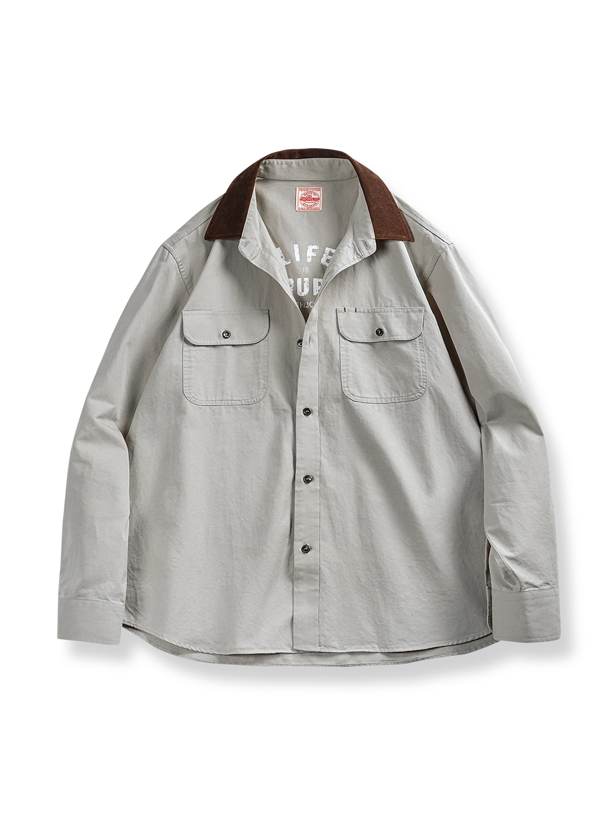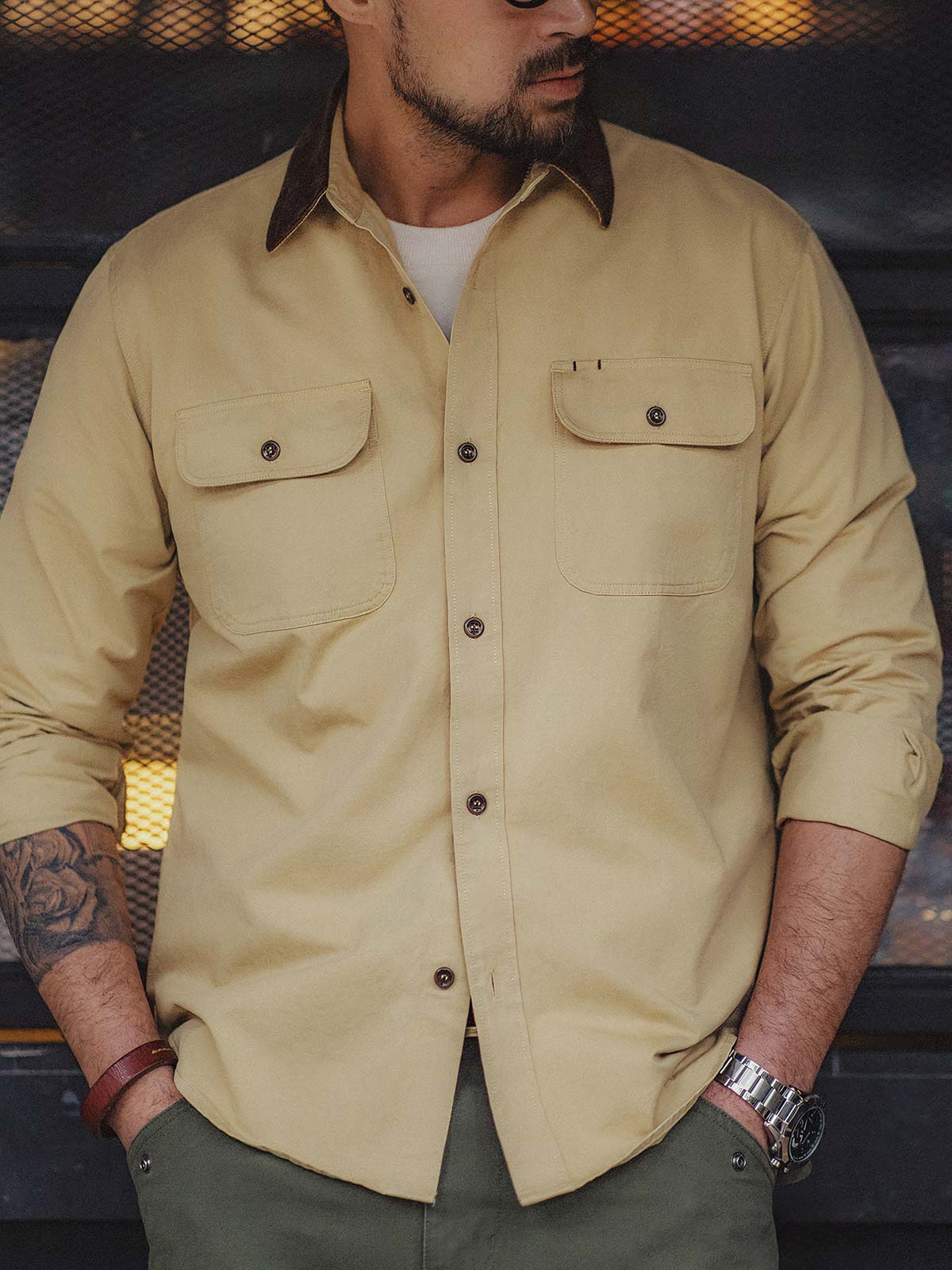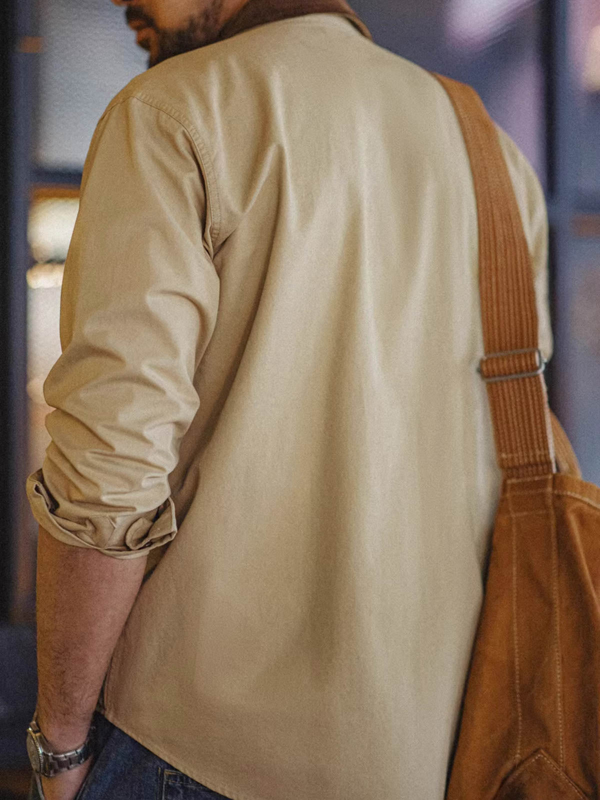このシャツは、伝統的なワークウェアのデザインにモダンなタッチを加えたアイテムです。襟のデザインには、猟装ジャケットからインスパイアされたコーデュロイのコンビが施されており、クラシックなワークシャツのシルエットと融合されています。このようなデザインのミックスは、アイテムに独特のレトロな雰囲気を与えています。