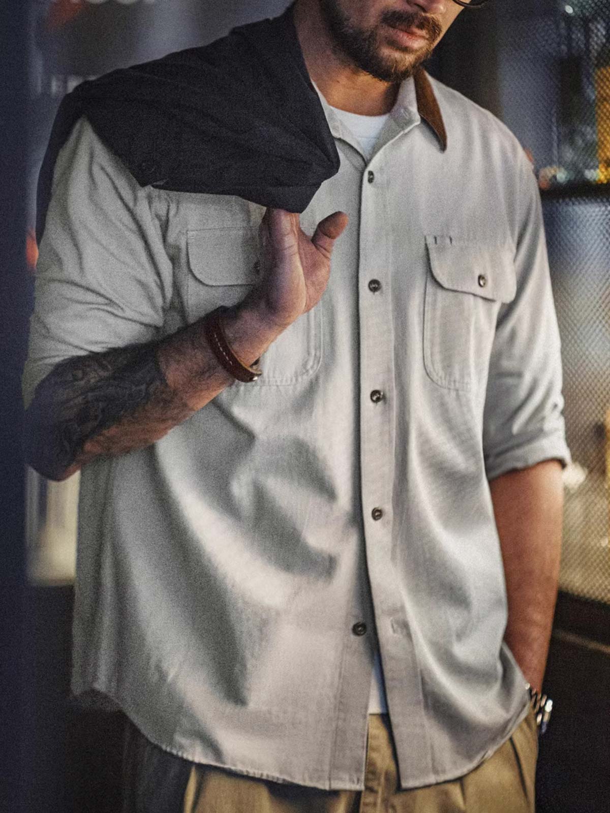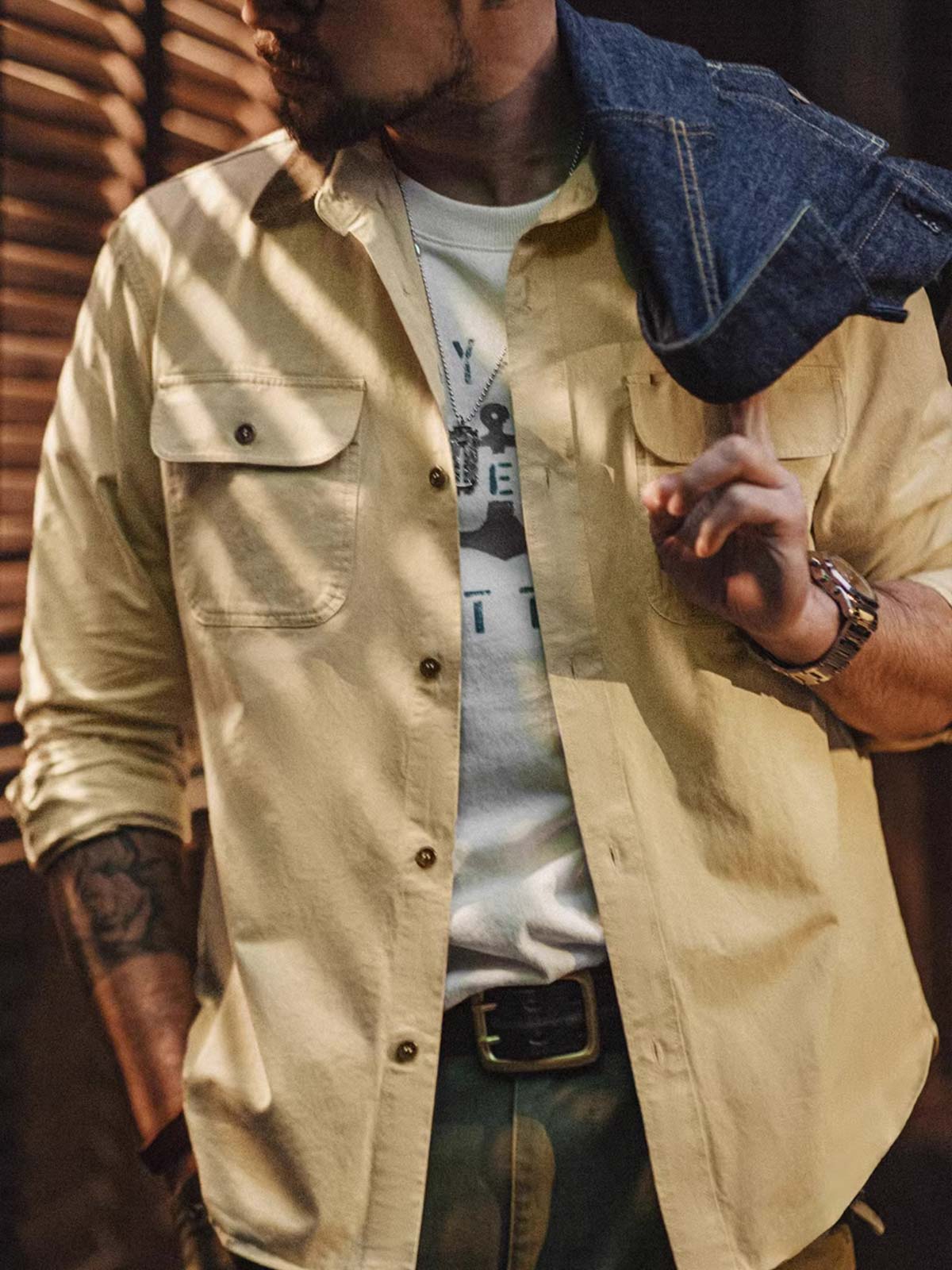 このワークシャツは、デニムジーンズやチノパンツと組み合わせることで、カジュアルながらも洗練された印象を作り出せます。また、スニーカーやブーツと合わせて、アウトドアシーンや都市生活の両方で活躍する汎用性の高いアイテムです。