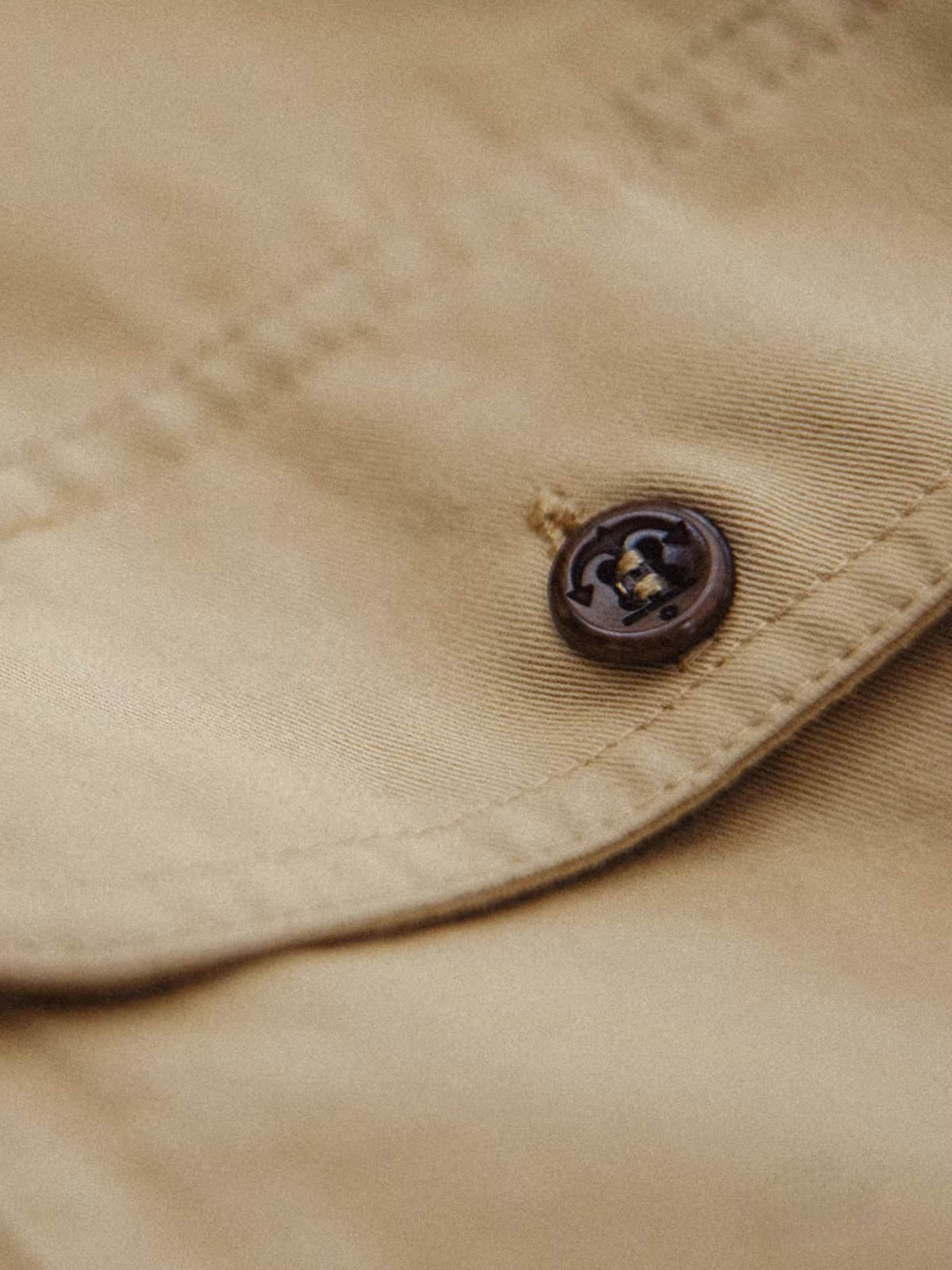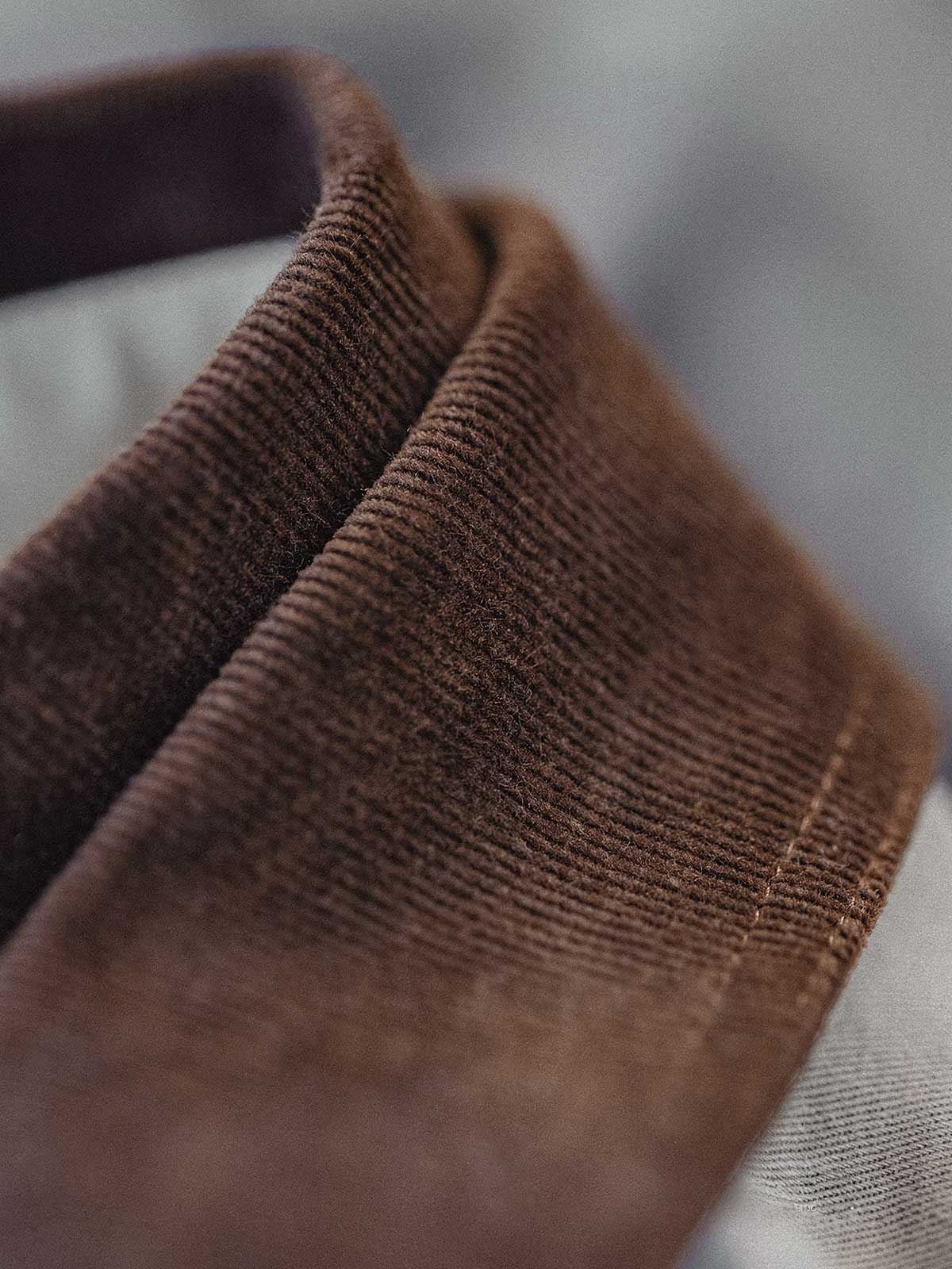 クラシックな2つのフラップポケットがフロントに配置されており、シンプルながらも実用的な収納スペースを提供しています。コーデュロイのカラーは温かみのある質感を加えるとともに、デザインのアクセントとして機能しています。
