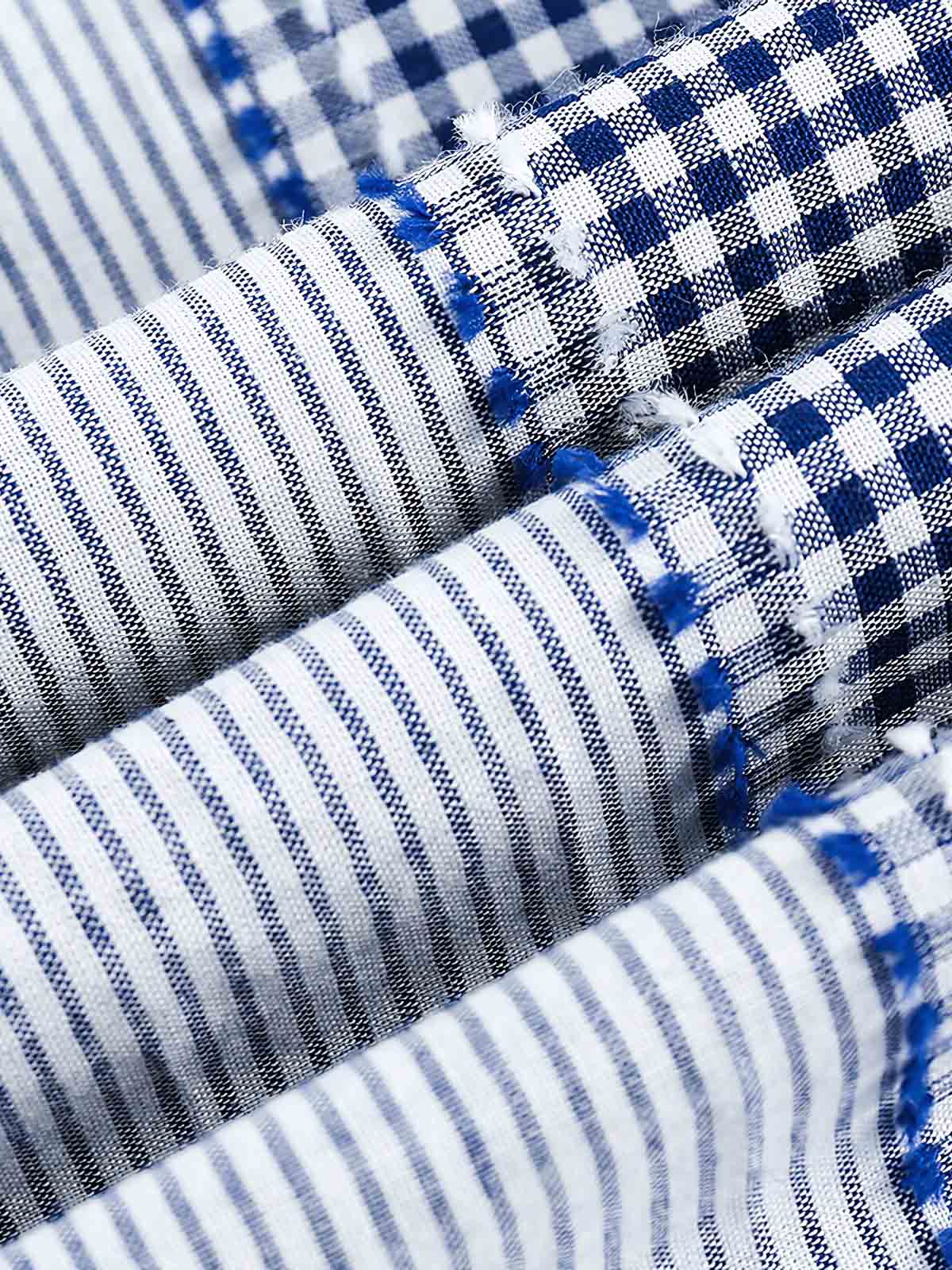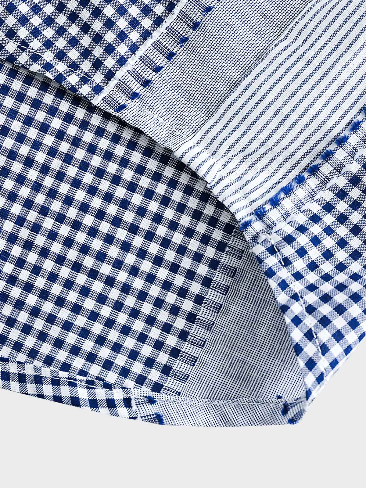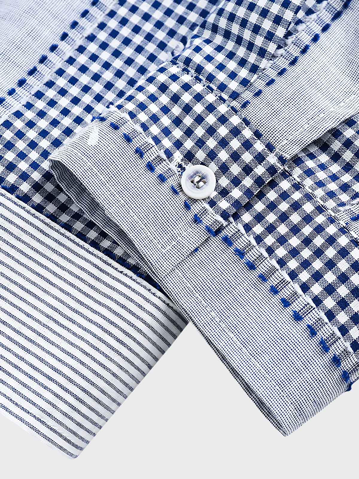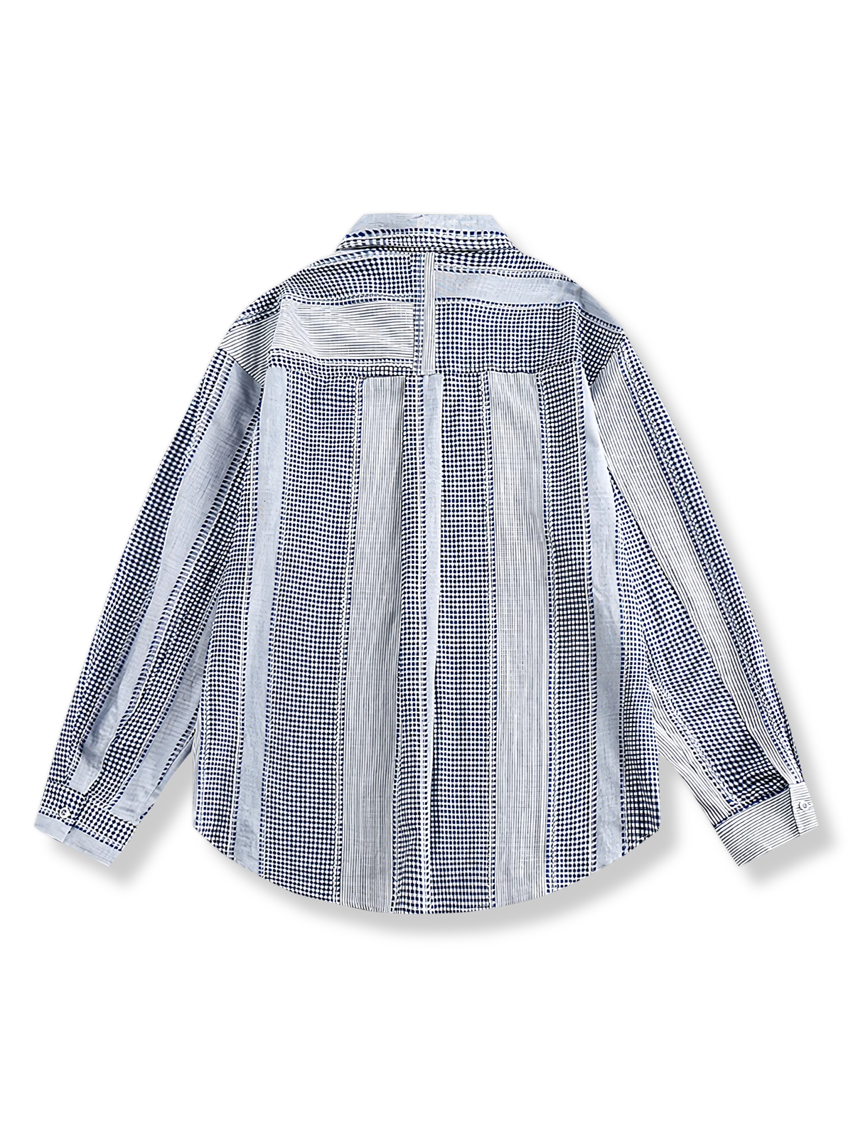 チェックシャツは西洋の服装史において重要な位置を占めており、特に19世紀のイギリスでは、紳士たちの日常着として象徴的な存在でした。カラーブロックのパッチワークデザインは、現代ファッションでよく見られる革新的な手法であり、伝統的な視覚的境界を打破しています。