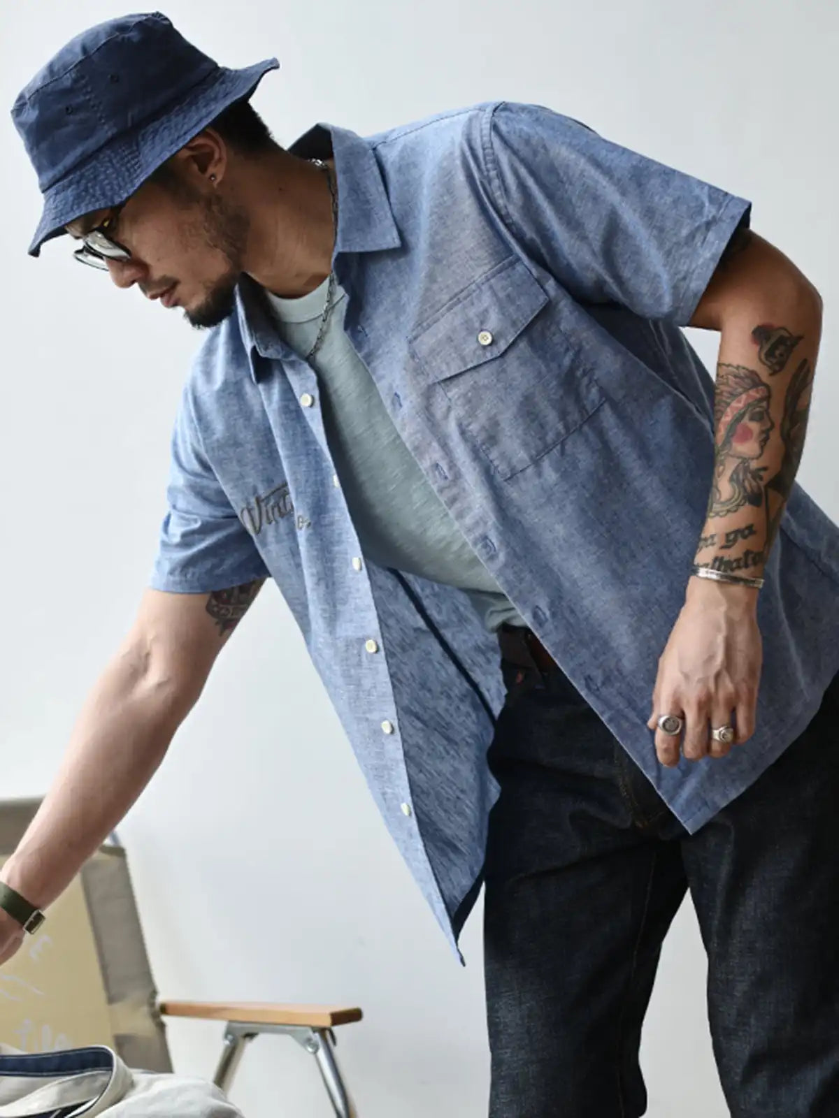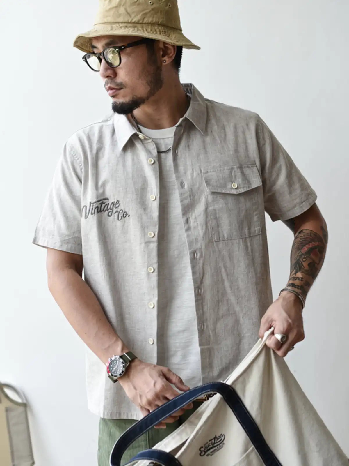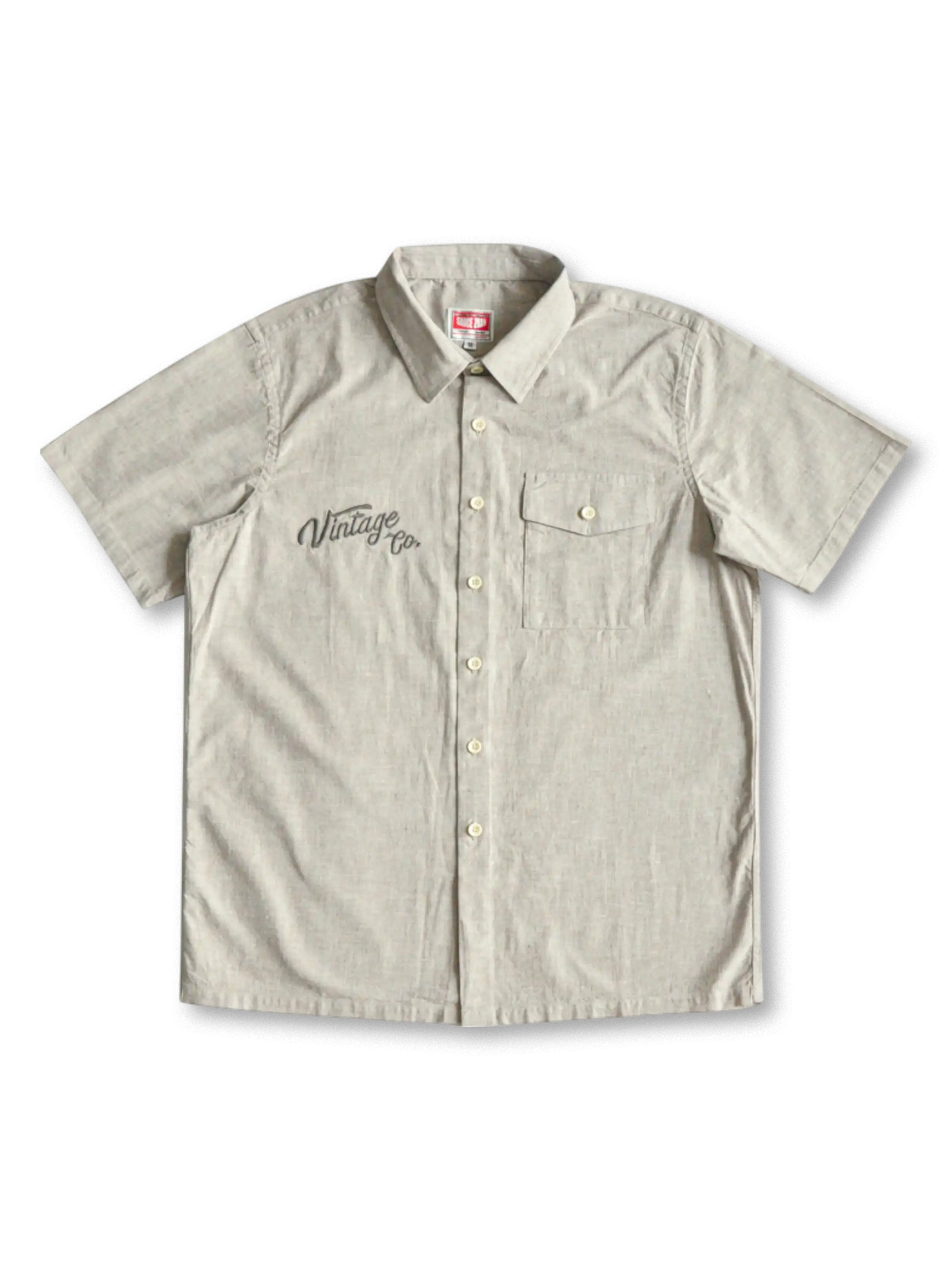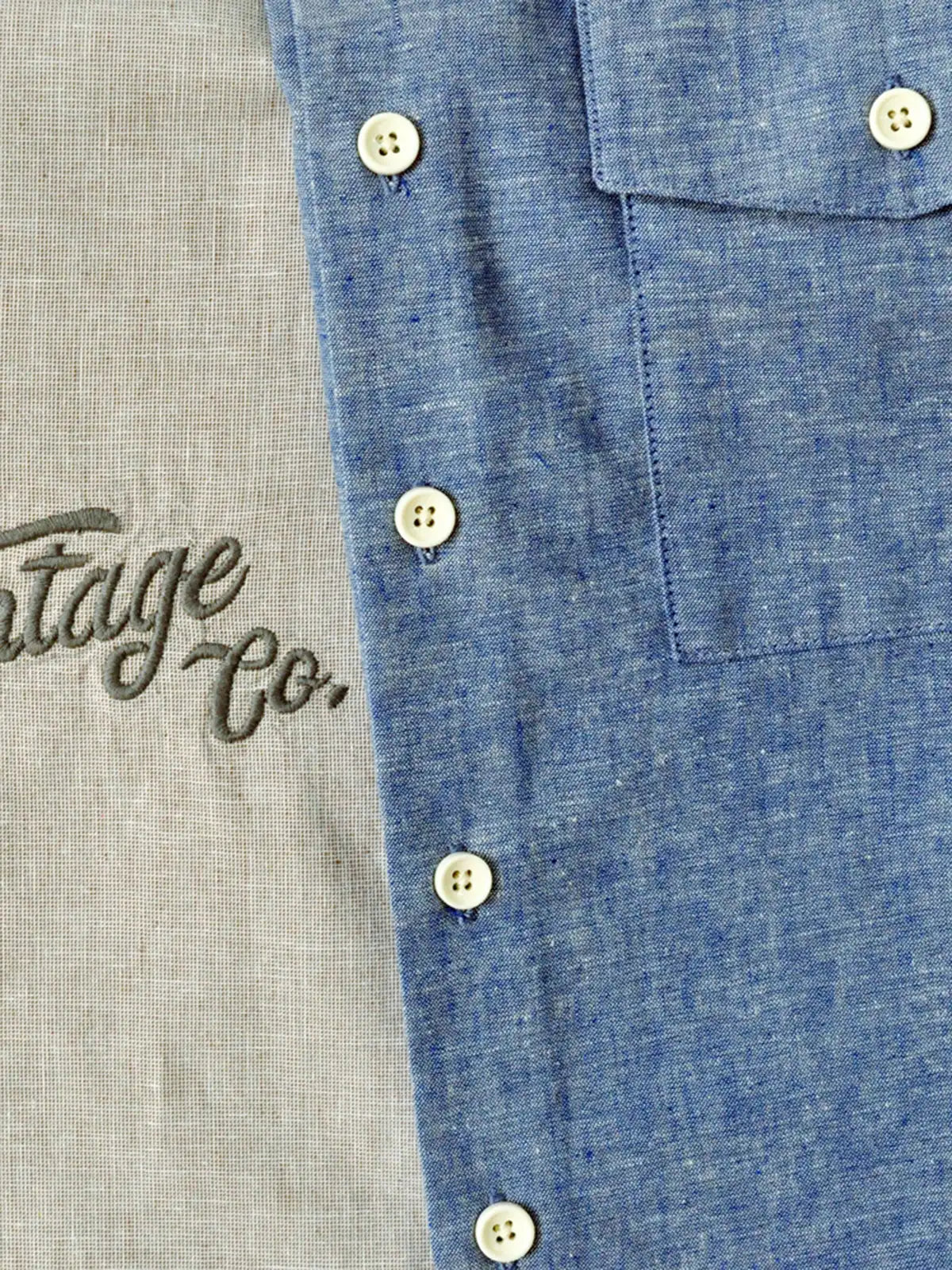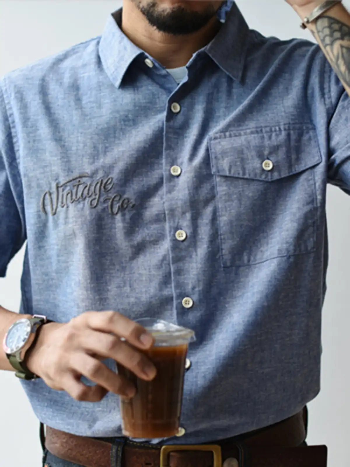 軽やかな薄手シャンブレー生地はスラブ糸の凹凸により肌離れがよく、真夏の通気性を確保。胸元には控えめな“Vintage Co.”刺繍をあしらい、1960年代のワークウェアを踏襲する直線的なカッティングがノスタルジックな佇まいを醸し出します。ボタンを開けて白Tと合わせれば、大人の夏通勤にふさわしい洗練されたスタイルが完成します。