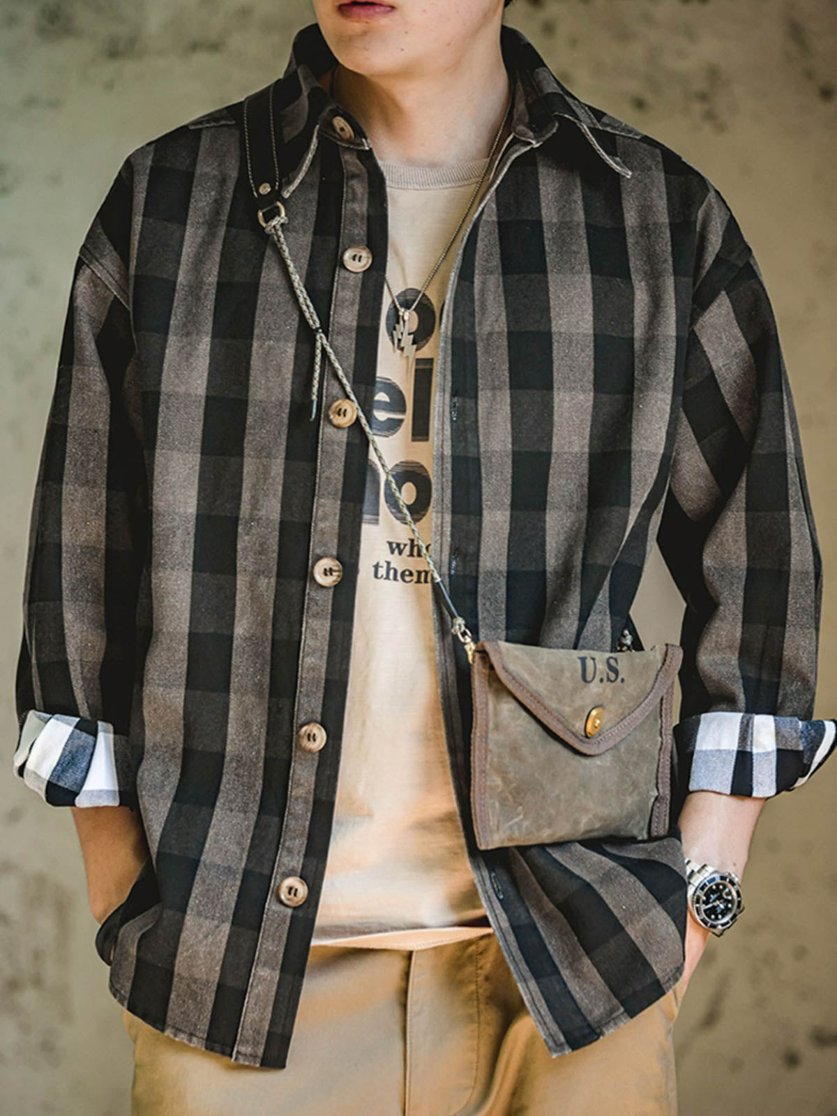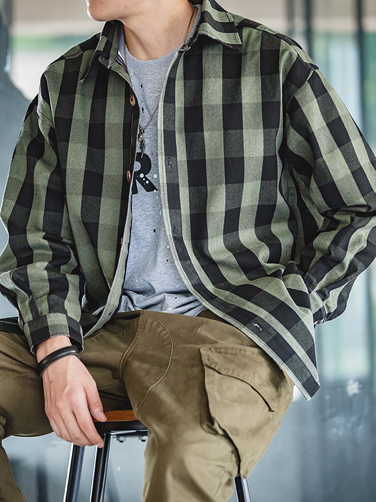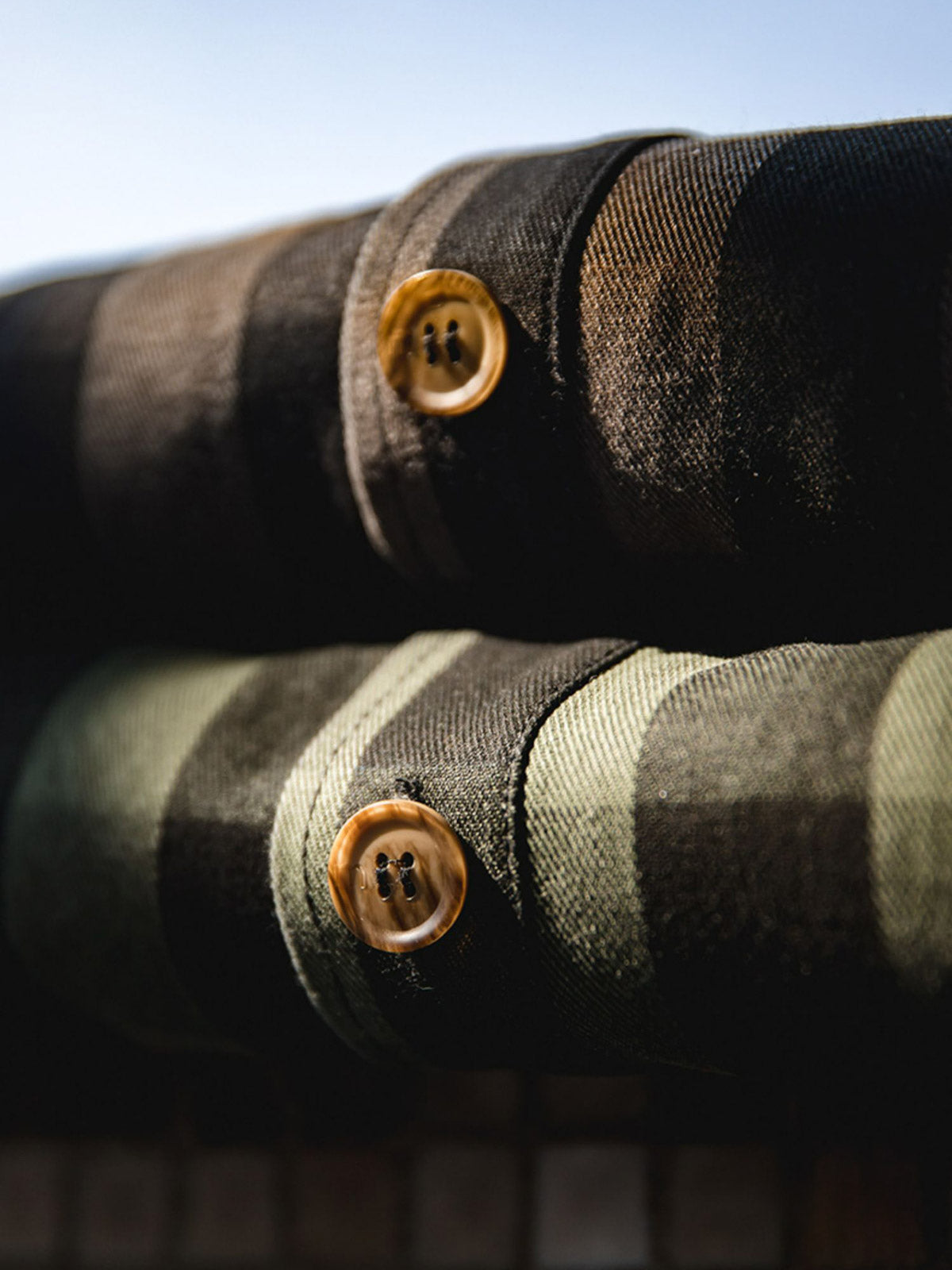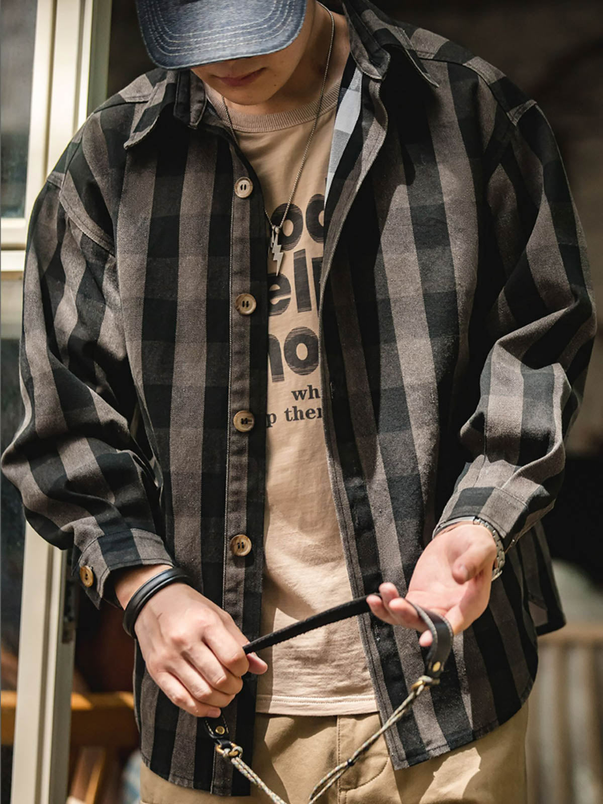 このシャツジャケットは、実用主義のワークウェア精神を体現しており、初期の労働者の作業服からインスピレーションを受けたデザインで、耐久性と機能性を強調しています。チェック柄の使用は、粗野と細部の対話を適切にバランスさせ、このワークウェアアウターにさりげないファッション感を与えています。