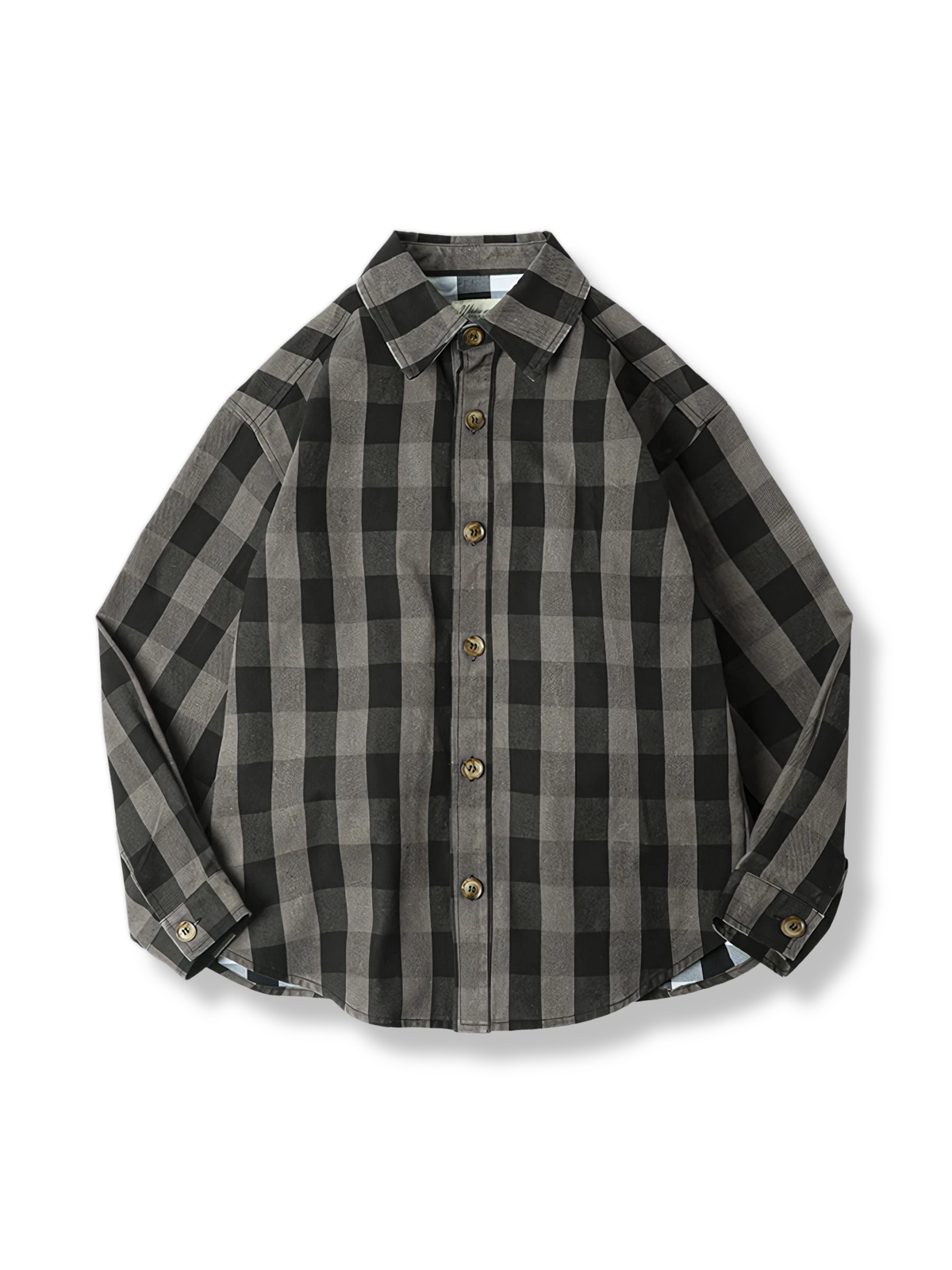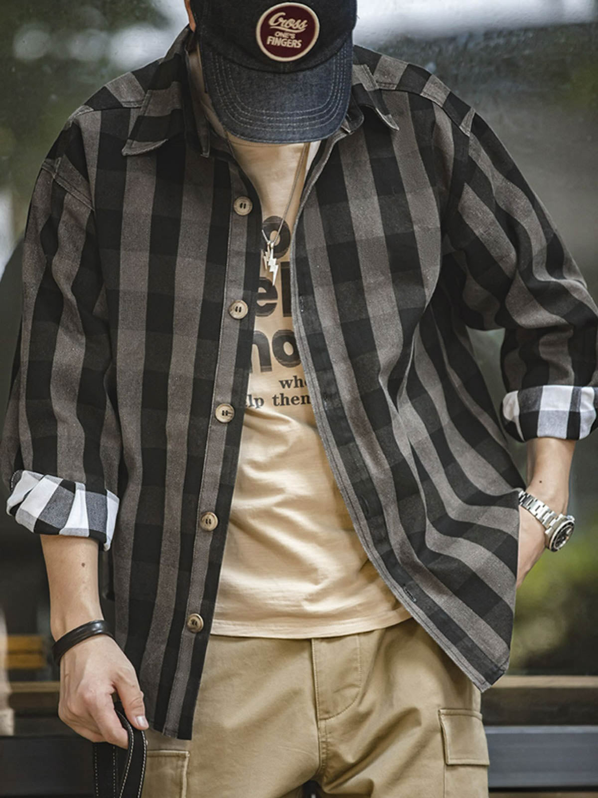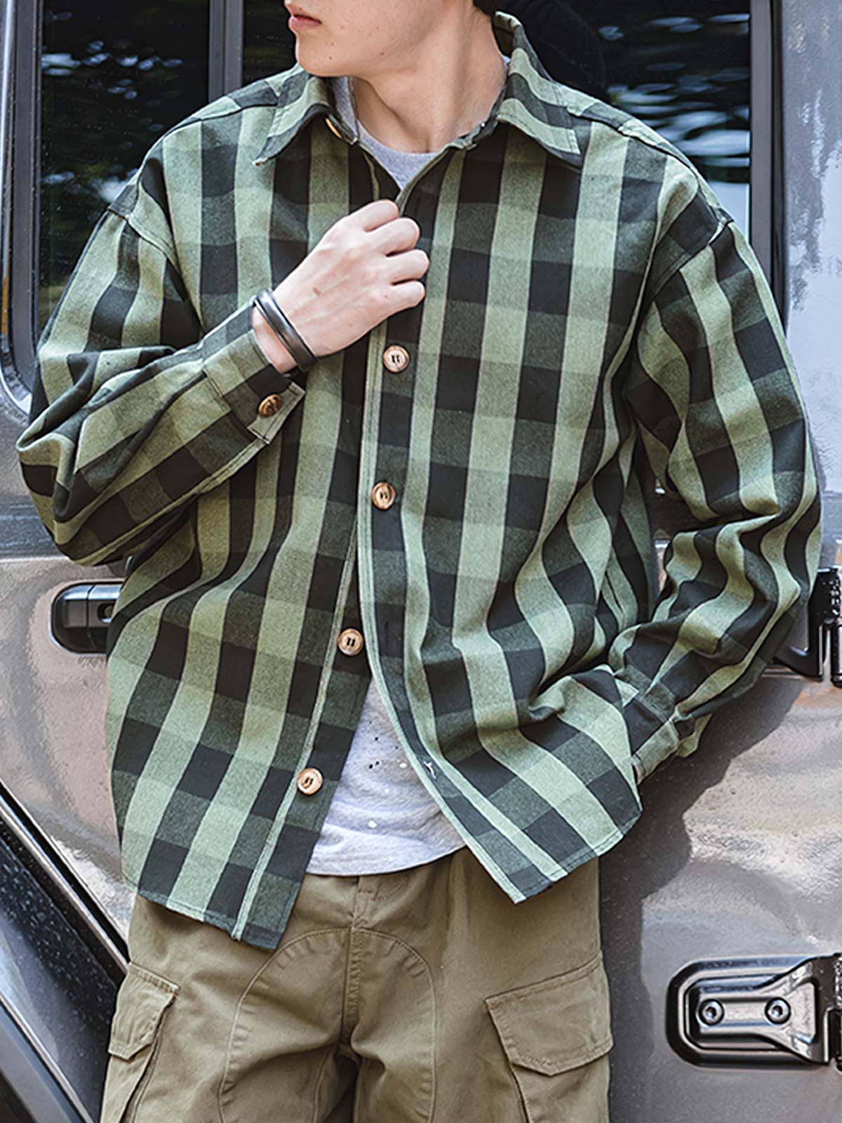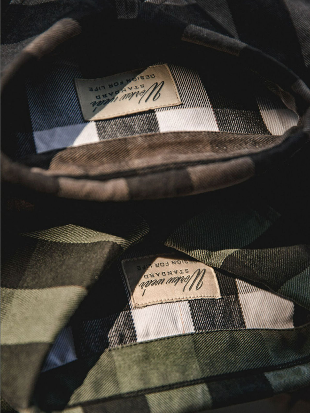 このシャツジャケットは、実用主義のワークウェア精神を体現しており、初期の労働者の作業服からインスピレーションを受けたデザインで、耐久性と機能性を強調しています。チェック柄の使用は、粗野と細部の対話を適切にバランスさせ、このワークウェアアウターにさりげないファッション感を与えています。