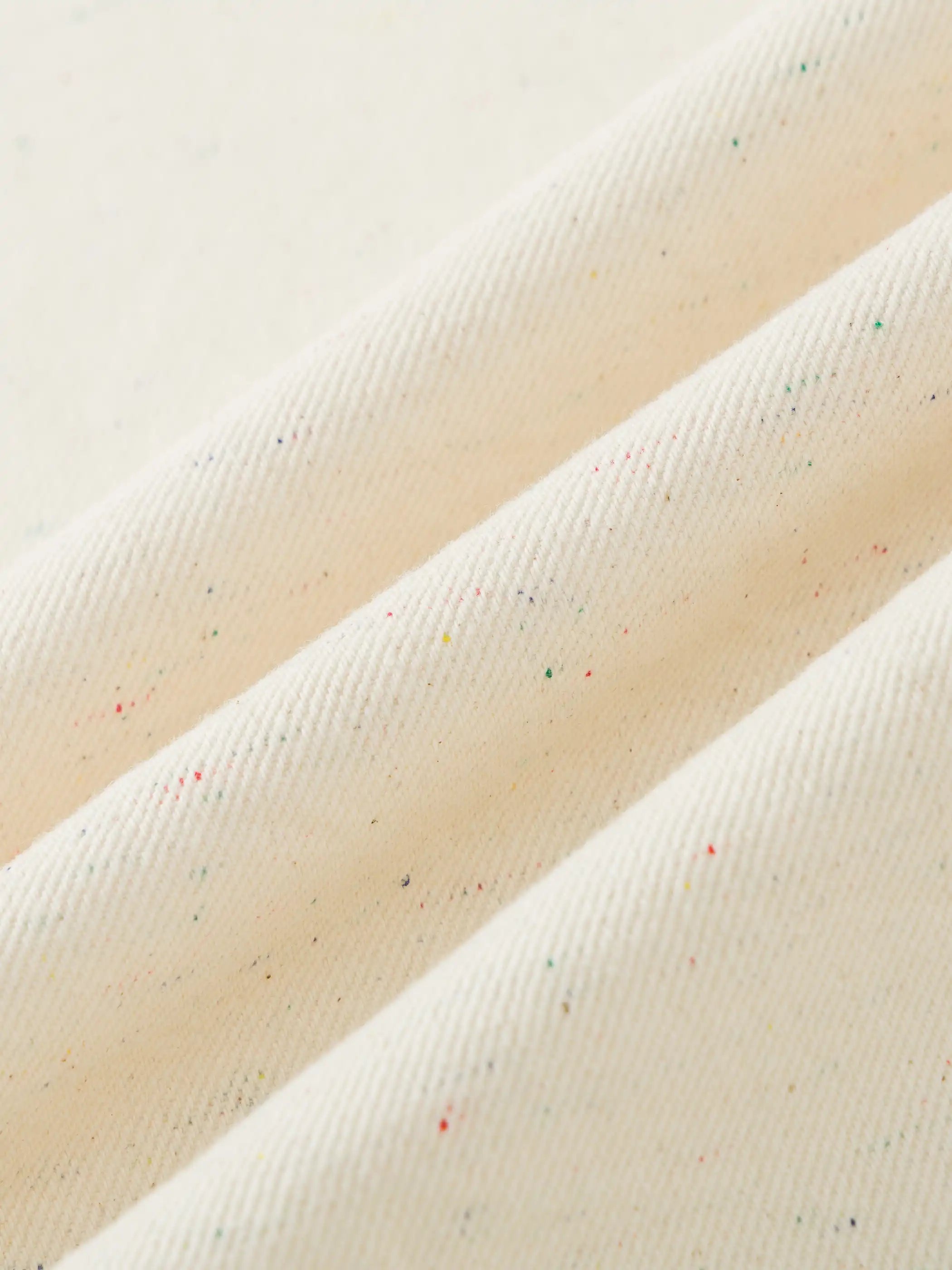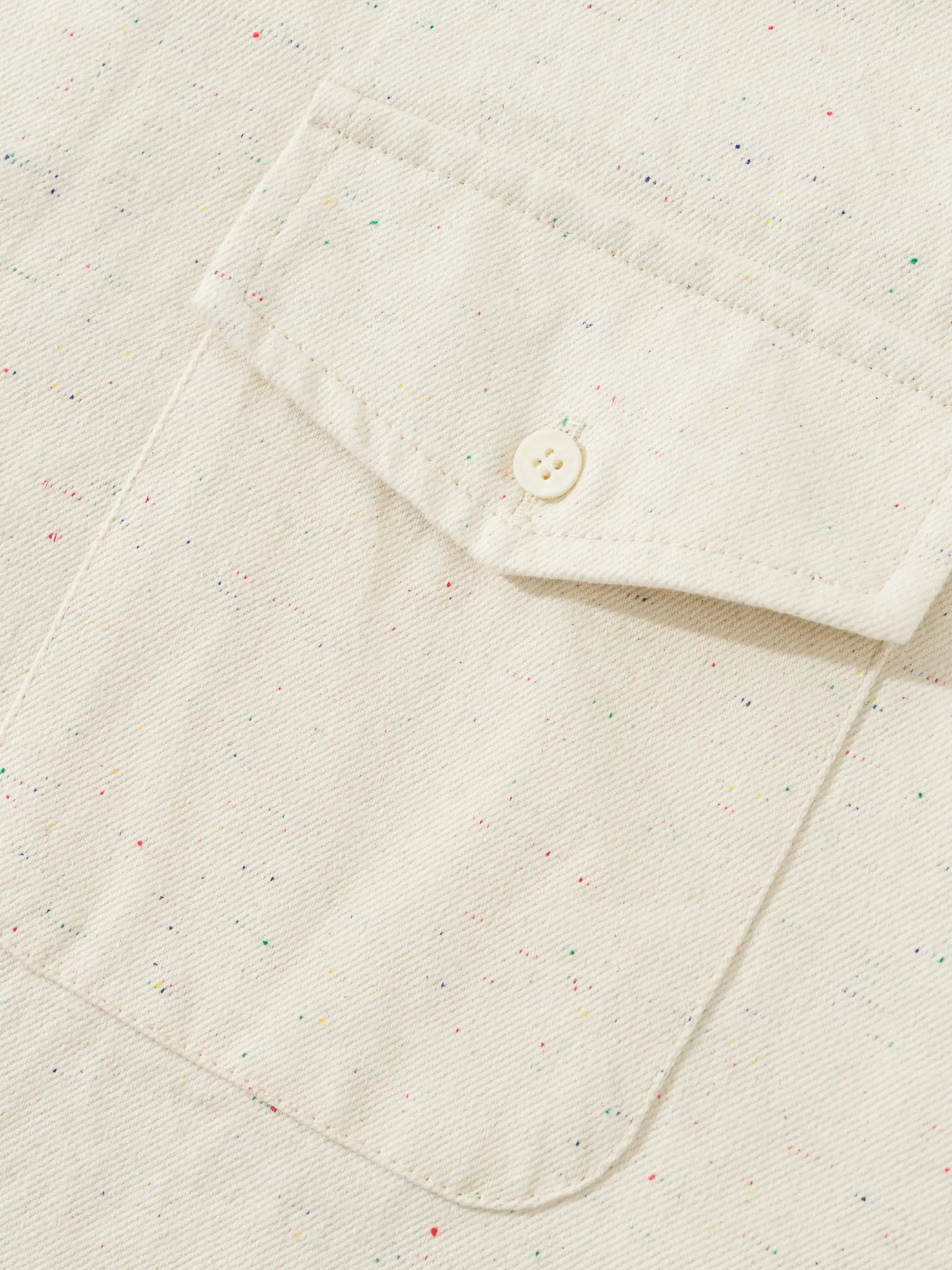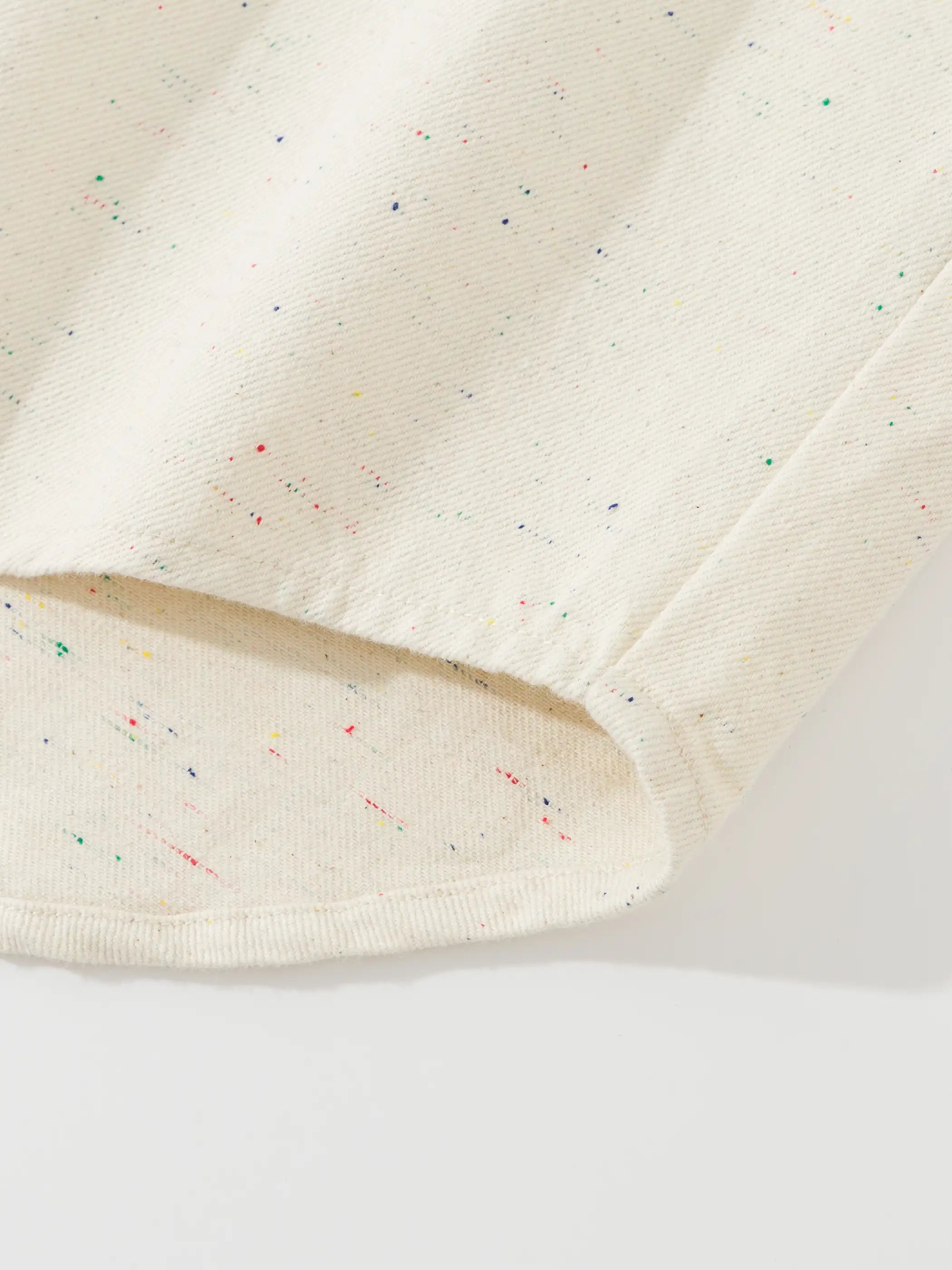 綾織りのコットンツイルに色糸をランダムに織り込んだスプラッシュスピークル生地を採用し、着込むほどに深まる表情を楽しめます。胸元のフラップポケットはミニマルながらも日常の小物をしっかりとホールドし、重めの酵素洗いによって生まれたソフトなタッチとくたっとした落ち感が、まるで古着を羽織るような心地よさを演出します。ワイドなボックスシルエットは肩の力を抜いたリラックススタイルにぴったりです。