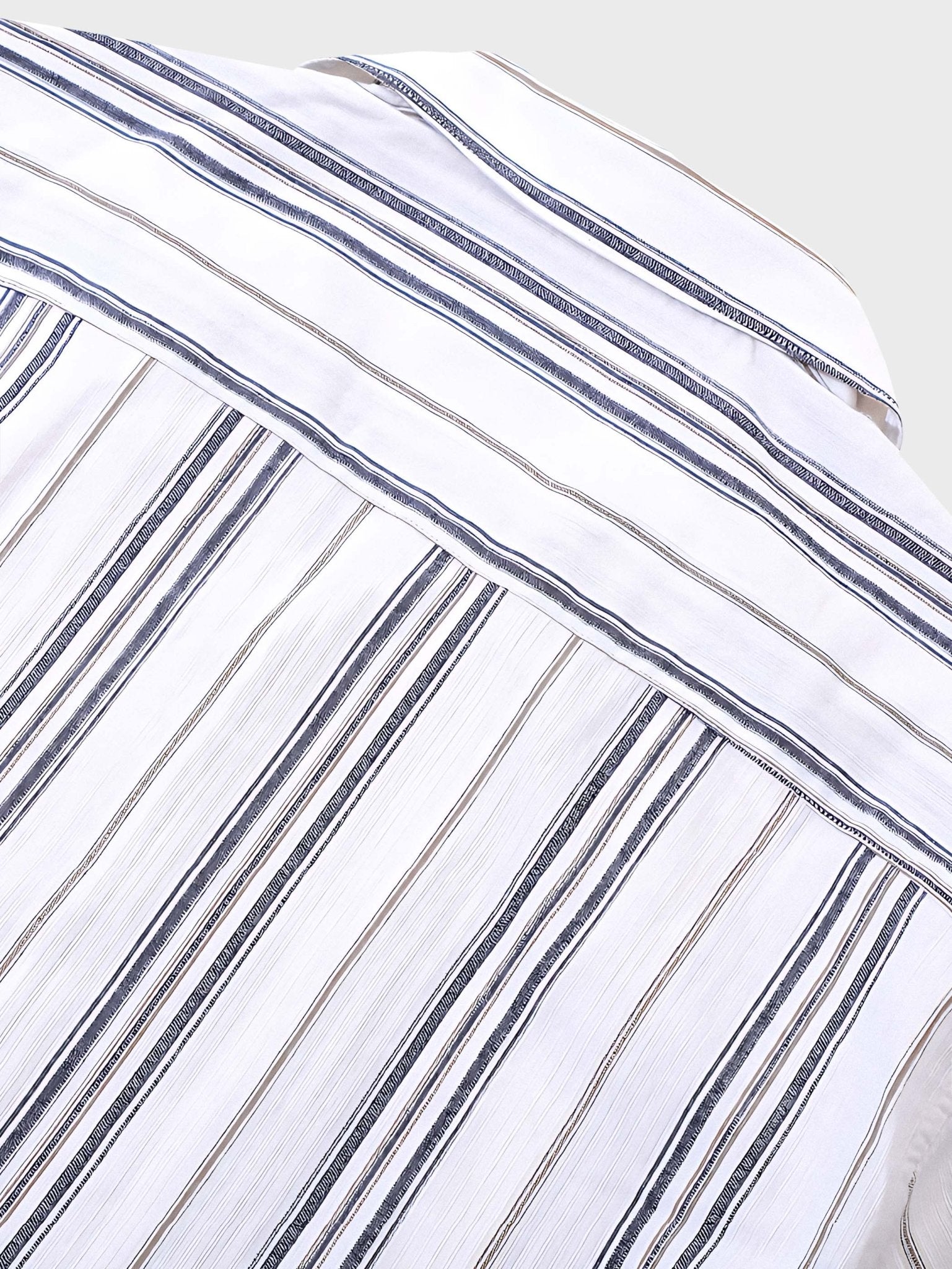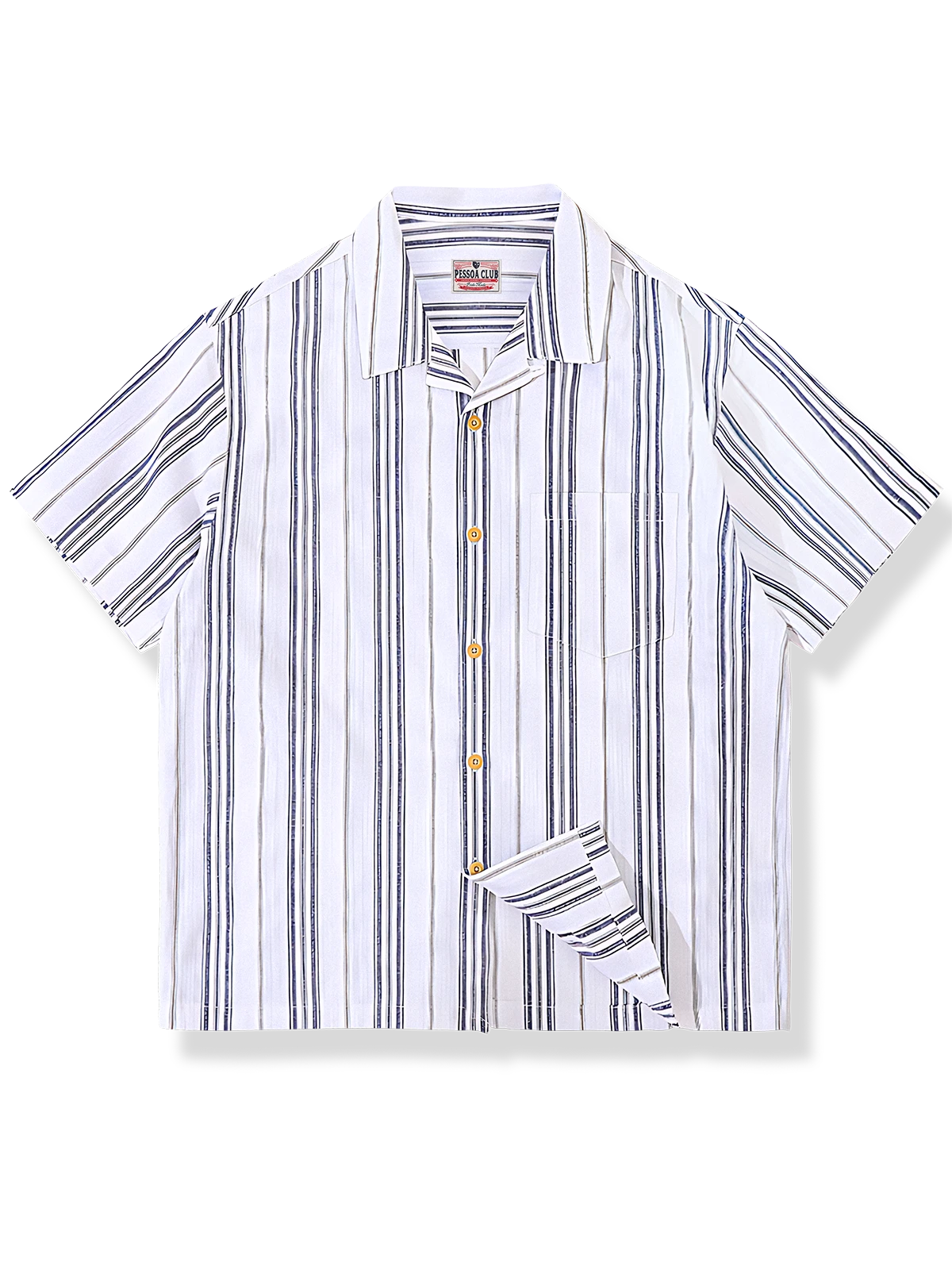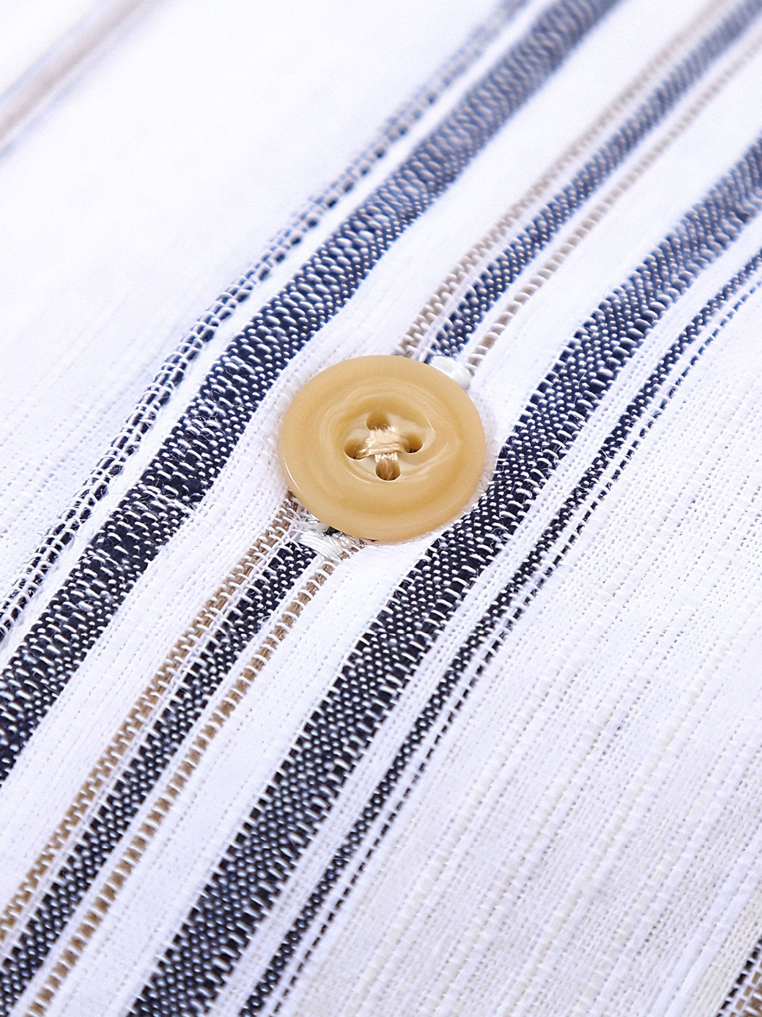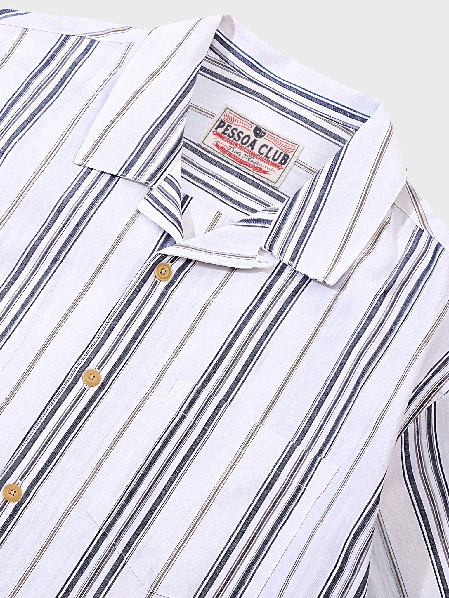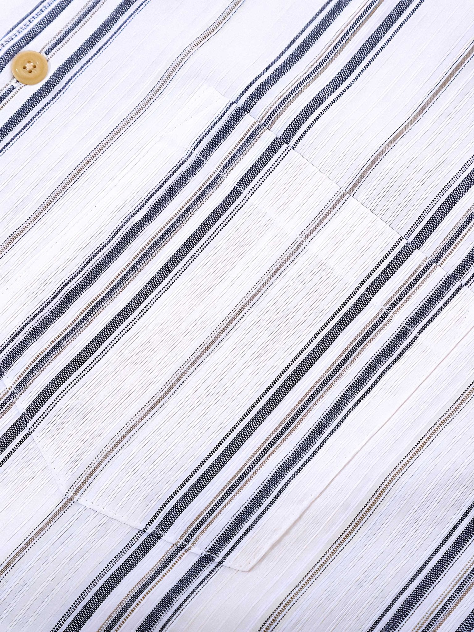このシャツは、カスタムメイドの三色織りコットン生地を使用しており、ホワイトの布地に濃紺とブラウンの交錯した効果があります。全体的に見ると質感があり、立体感に富んでいます。布地の色はどんなカジュアルパンツやショートパンツとも相性が良く、様々なスタイルを演出できます。。