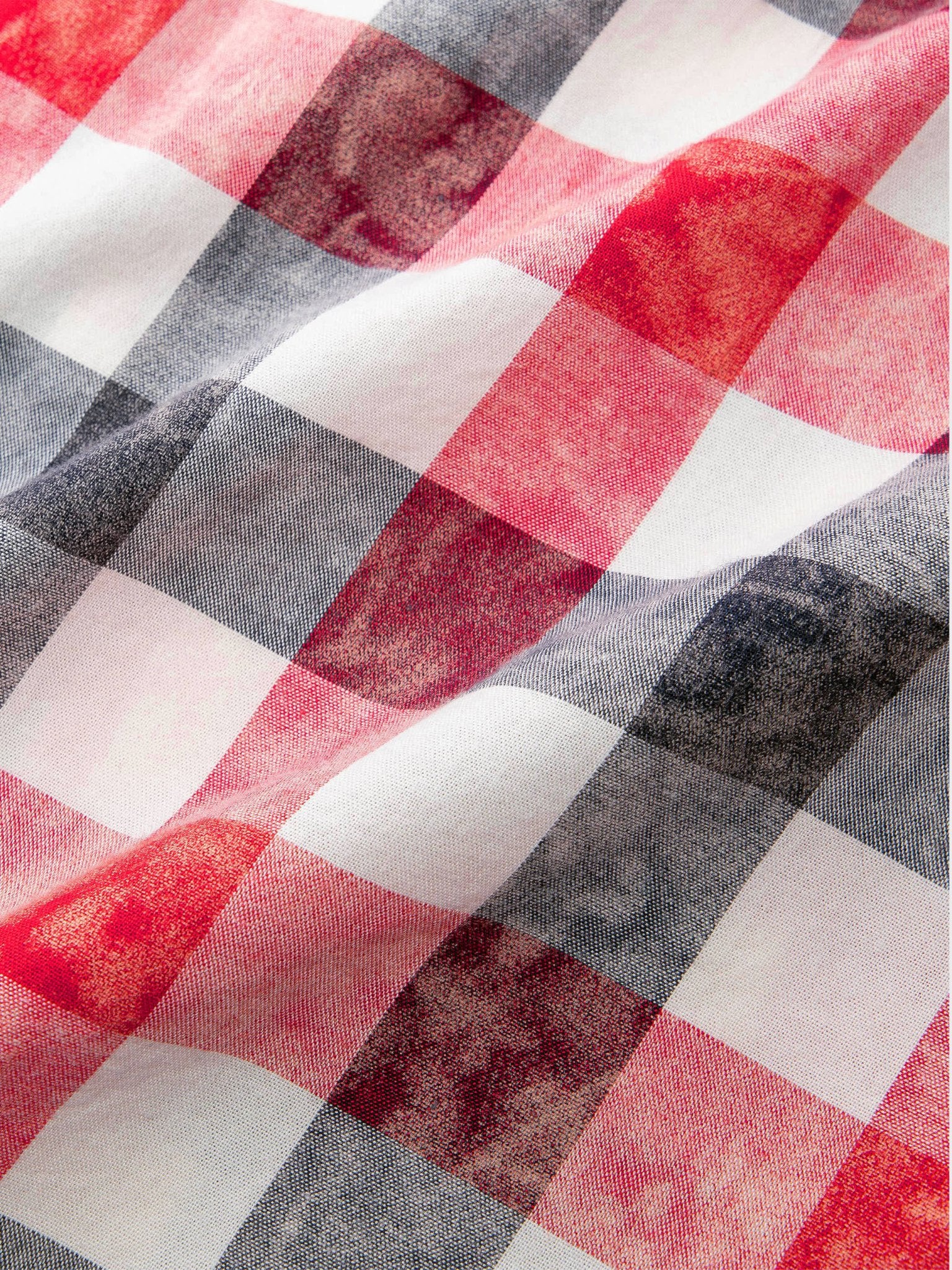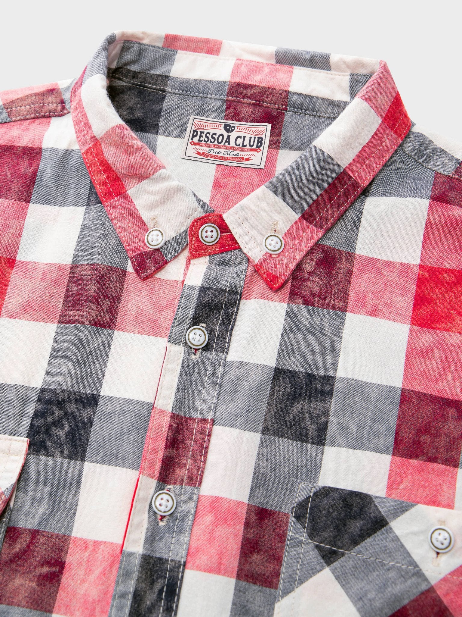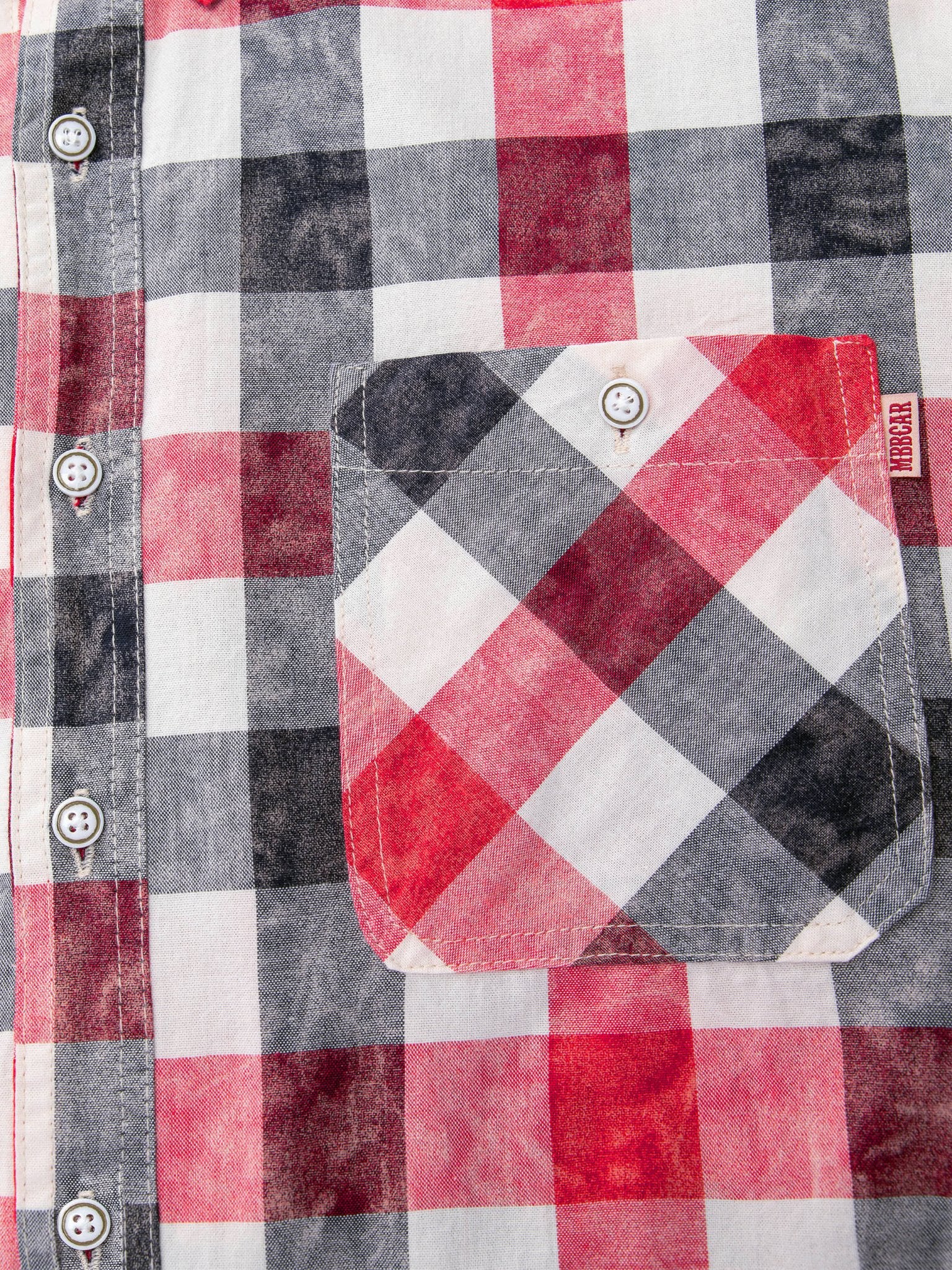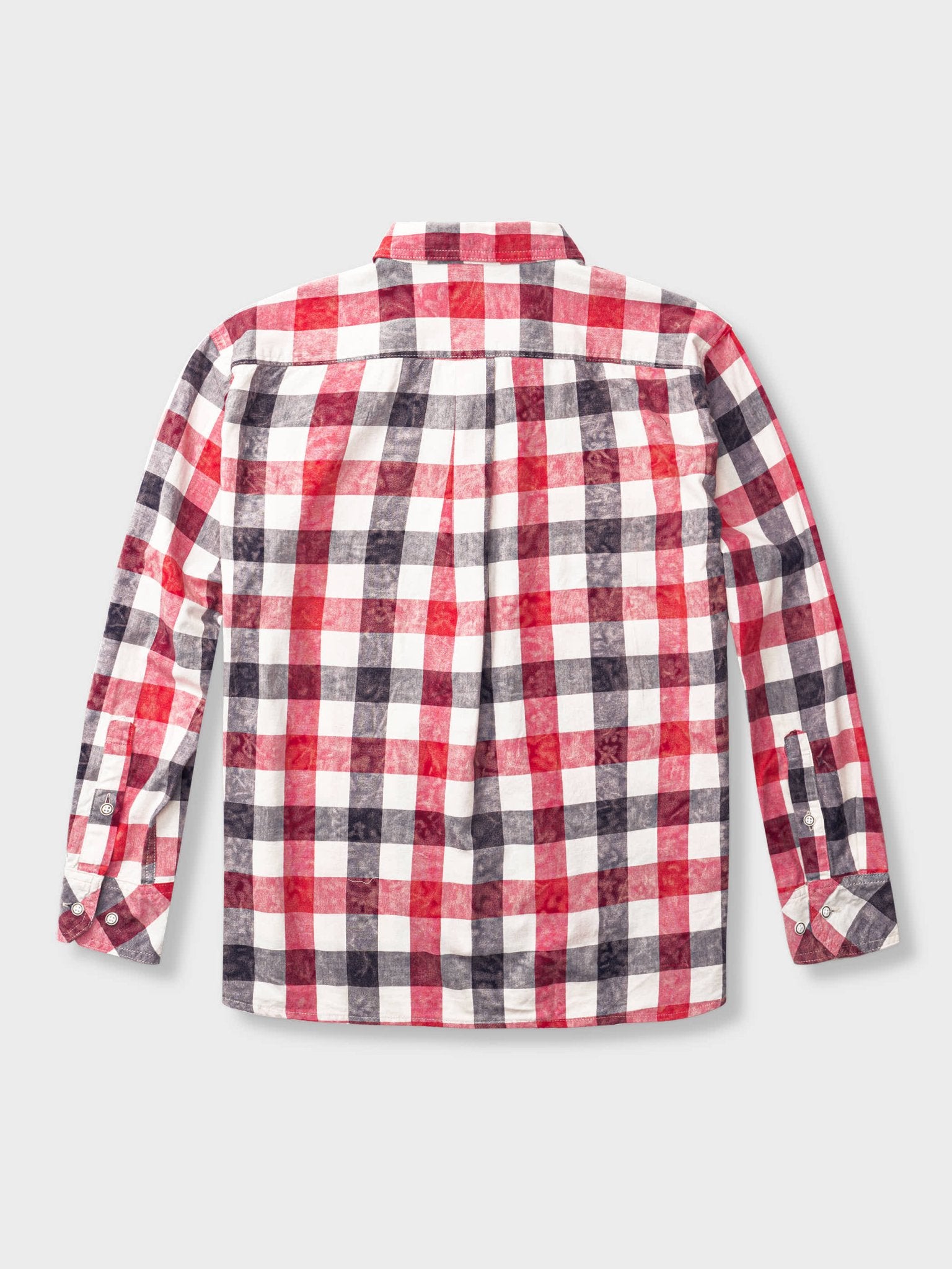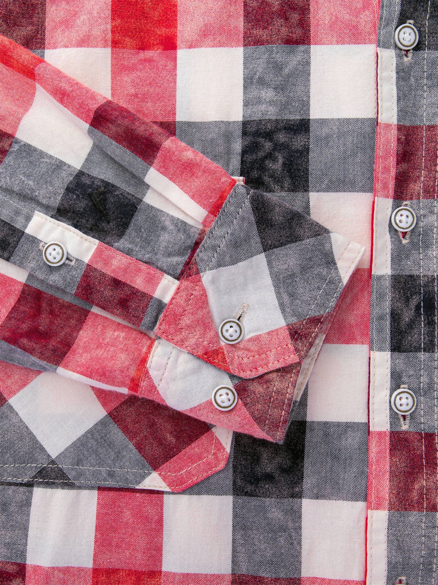 赤と灰色のチェック柄に、絞り染めの要素を加えたデザインは、クラシックなチェックシャツとは異なり、レトロなスタイルが際立っています。春先には、ニットやダウン、ジャケットなどの重めのアウターのインナーに着用することができます。個性的でスタイリッシュなシャツスタイルを演出することができます。