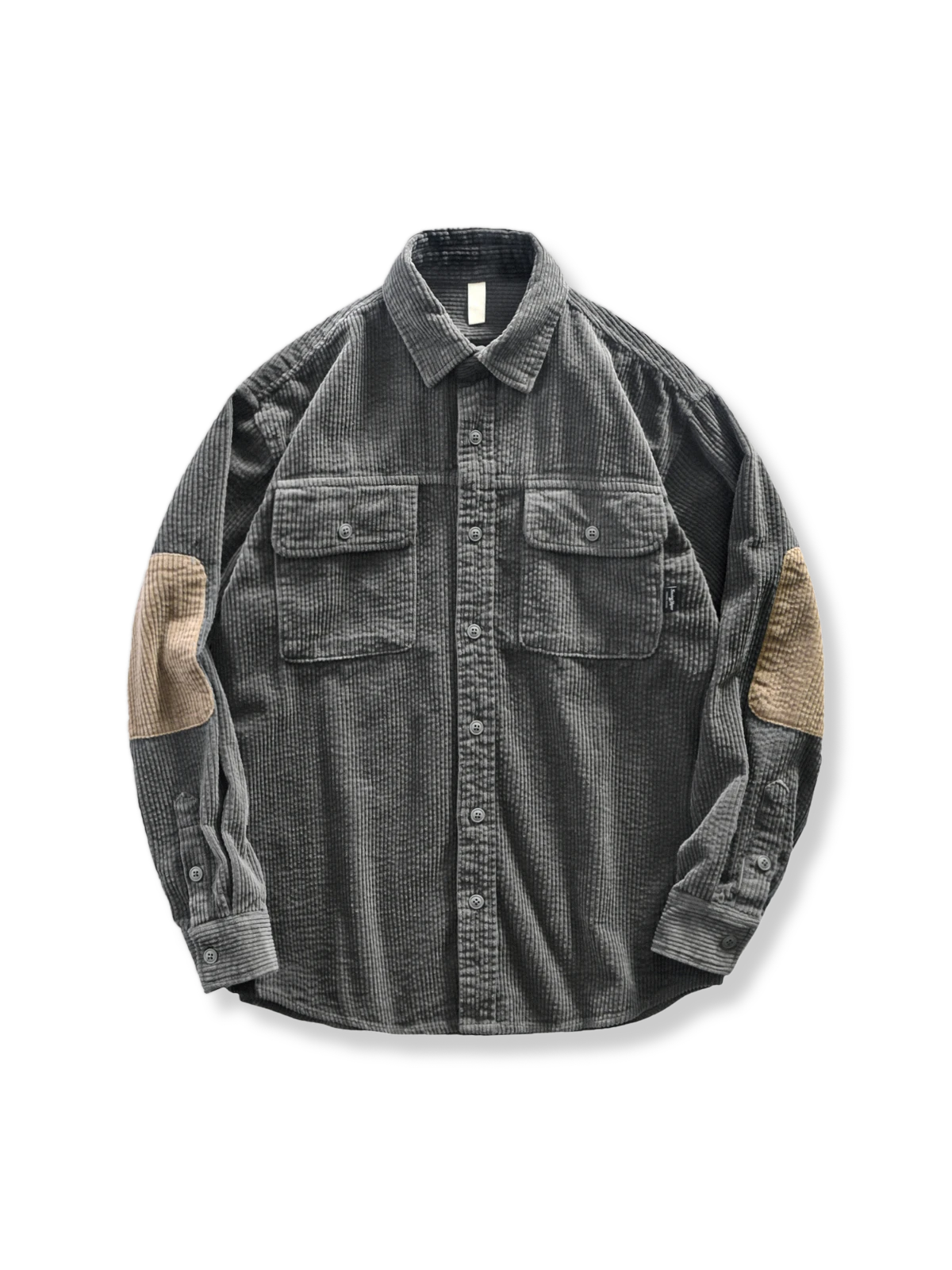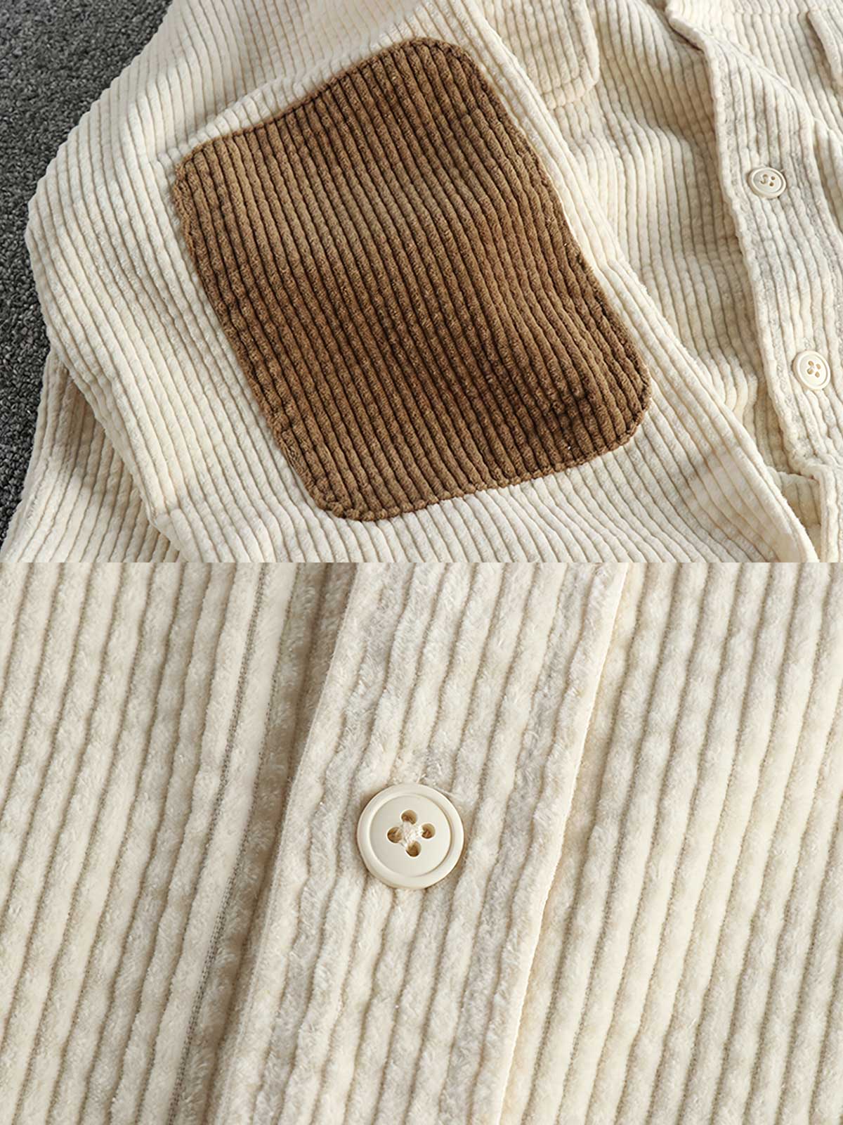 コーデュロイは19世紀の産業革命時代に起源を持つクラシックな生地で、作業着やカジュアルウェアによく使われ、耐摩耗性と快適さで人気があります。このアイテムのパッチワークデザインとエルボーパッチは、コーデュロイが歴史上ワークウェア素材としての伝統にオマージュを捧げるとともに、レトロ感と実用性を加えています。