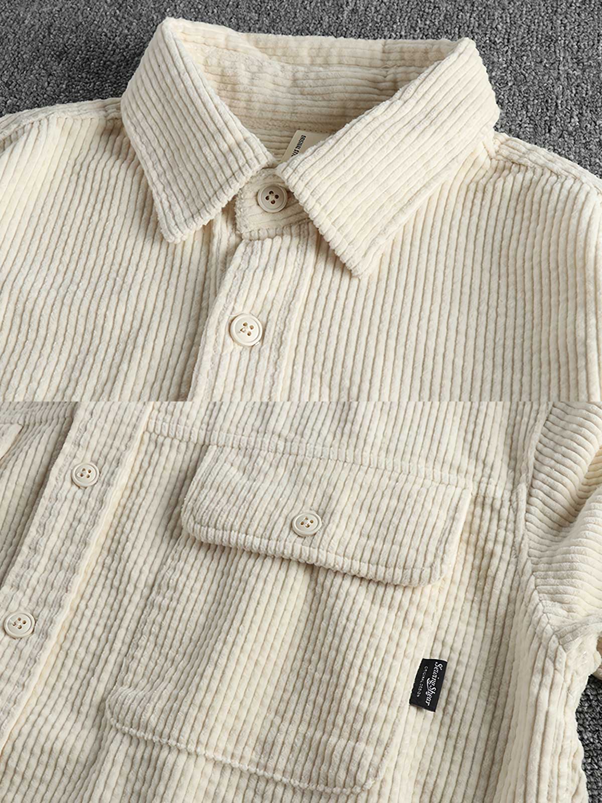 使用されているコーデュロイ生地は明瞭な縦のテクスチャを持ち、全体的な触感を豊かで快適にしています。テクスチャのディテールと質感は、衣服の保温性と耐久性を強化し、視覚的なレイヤード感を提供します。