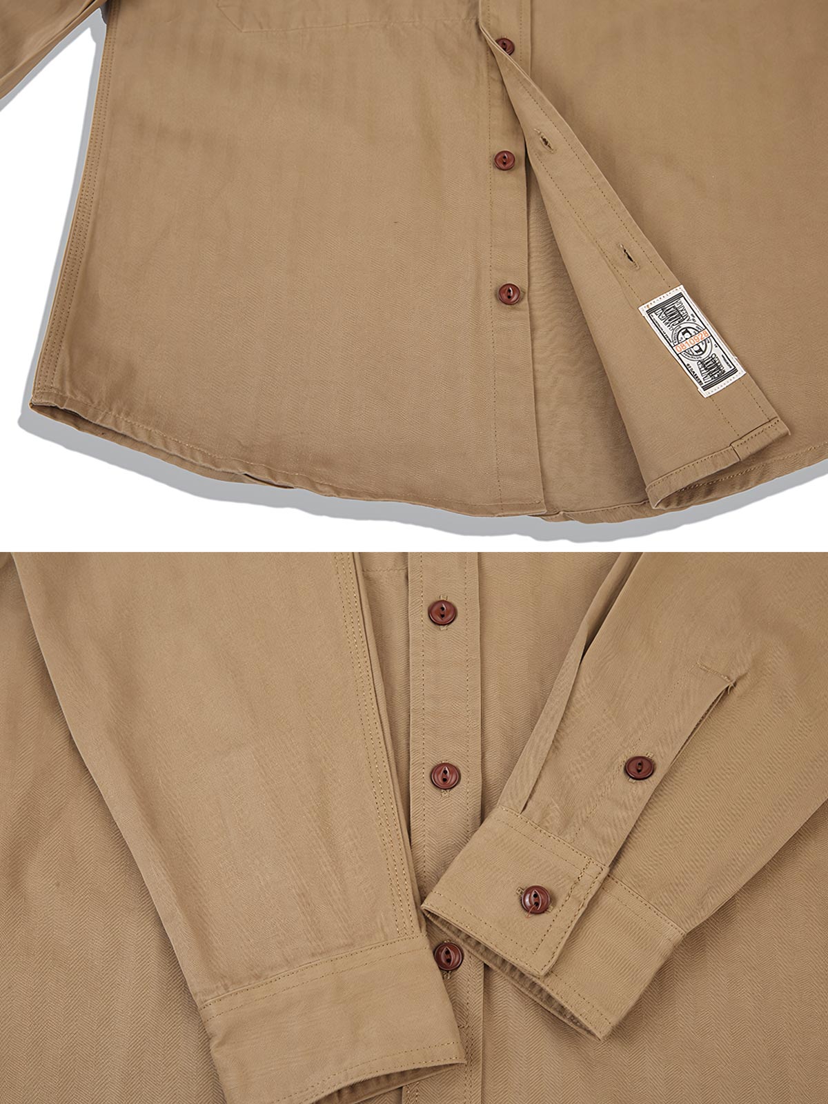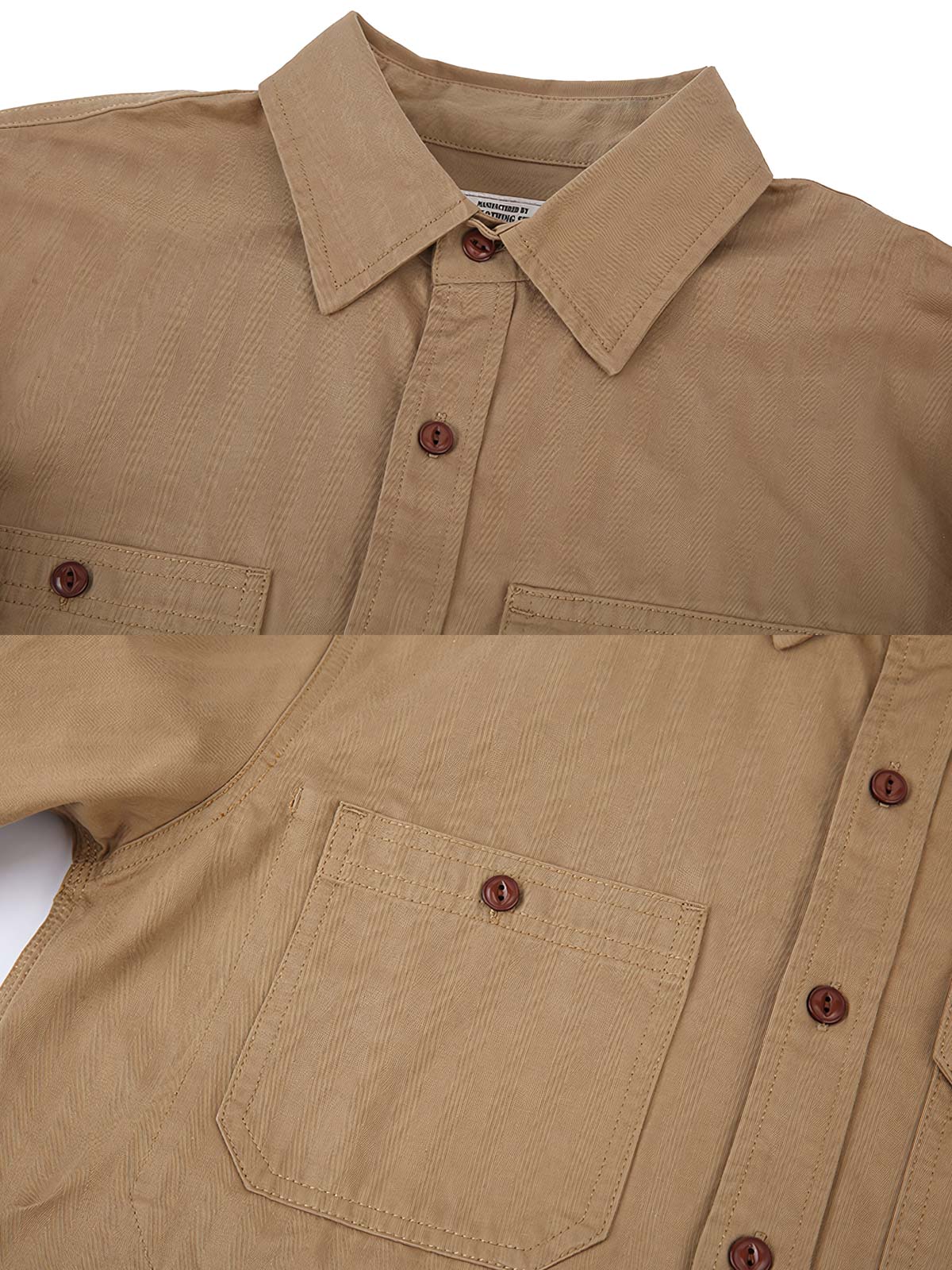 コットン素材を使用しており、この天然素材は肌に優しく通気性があり、多くの衣類に広く使われています。ワークシャツの特徴は、作業中に道具や小物を持ち運ぶための追加のポケットや、耐久性のあるボタン、強化された縫い目などが含まれ、服の耐久性と機能性を高めるためです。