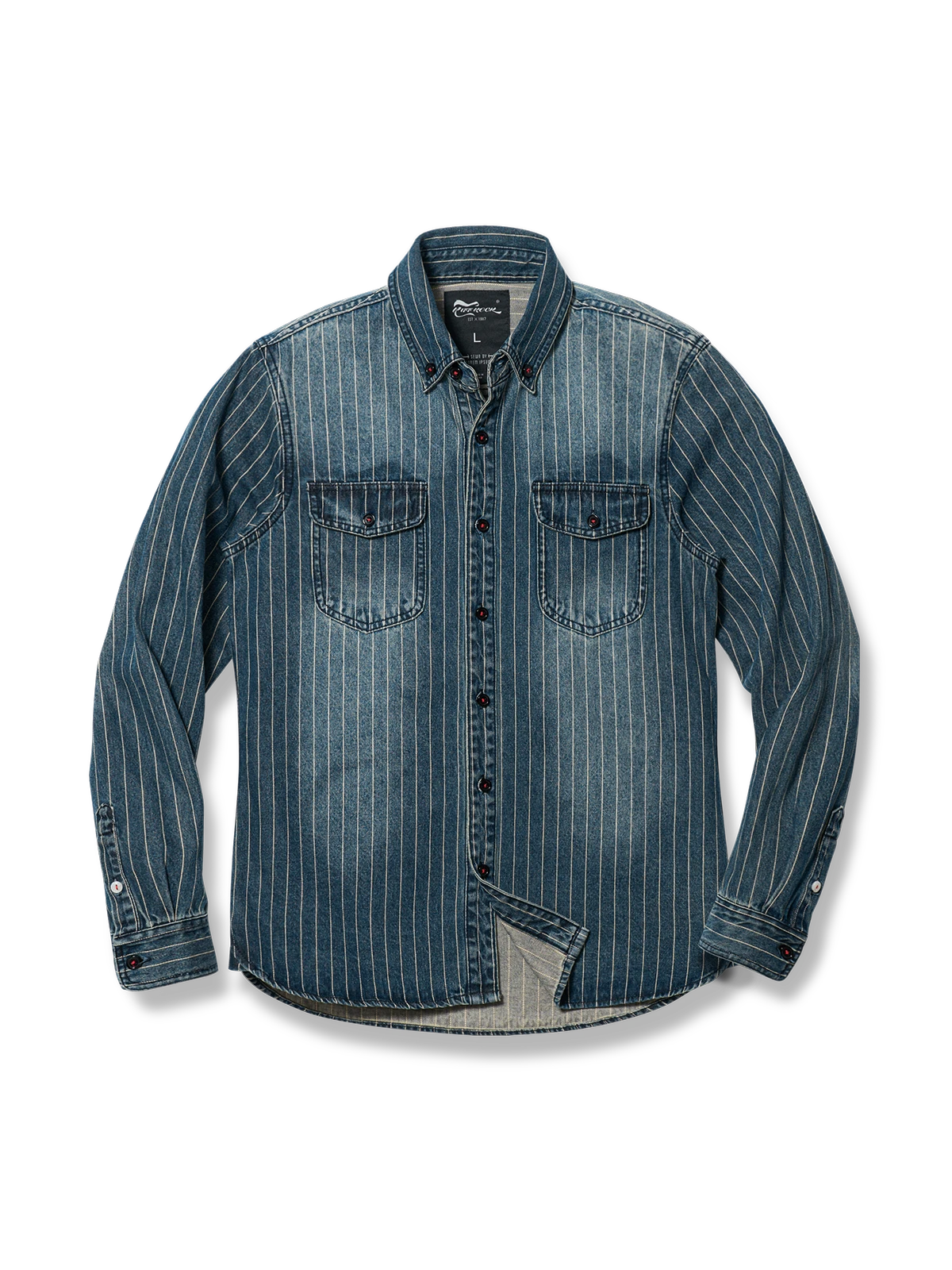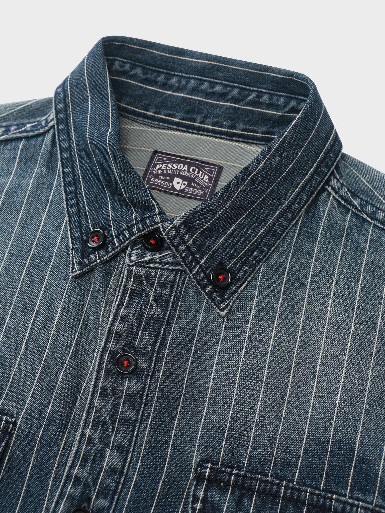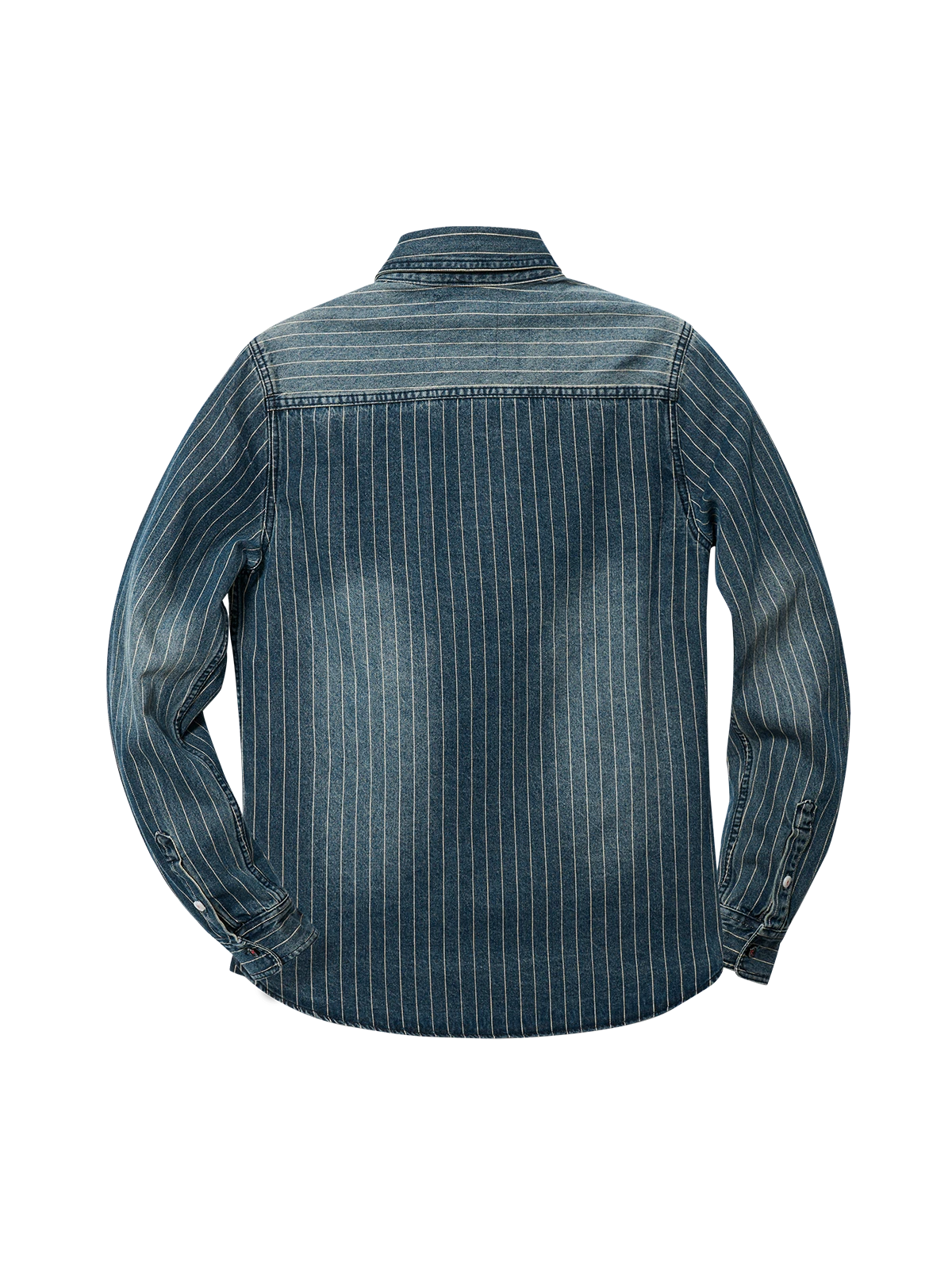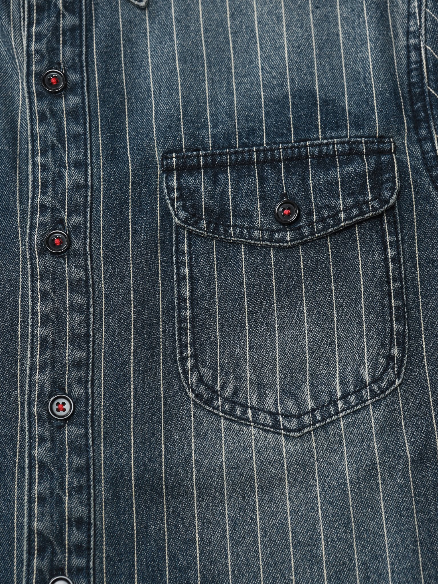 このデニムシャツは中古感のあるウォッシュ加工が施され、濃厚なレトロな雰囲気を演出しています。アメリカのクラシックなデザインに、日本風のデザイン要素が融合され、独特のスタイルを表現しています。さらに、シャツの柄にストライプデザインを採用し、より立体的な効果を表現しています。