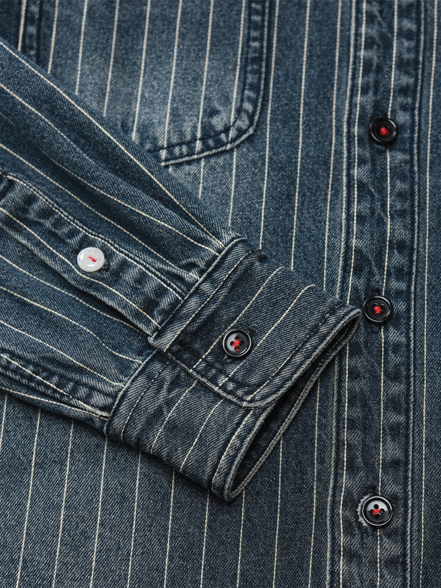 このデニムシャツは、ウォッシュ加工により質感を増しました。ストライプデザインを採用することで、全体的な立体感を出します。さらに、袖口とポケットにも非常に細やかなデザインが施され、デザイナーが心を込めてこだわりが、完璧な仕上がりを演出しています。