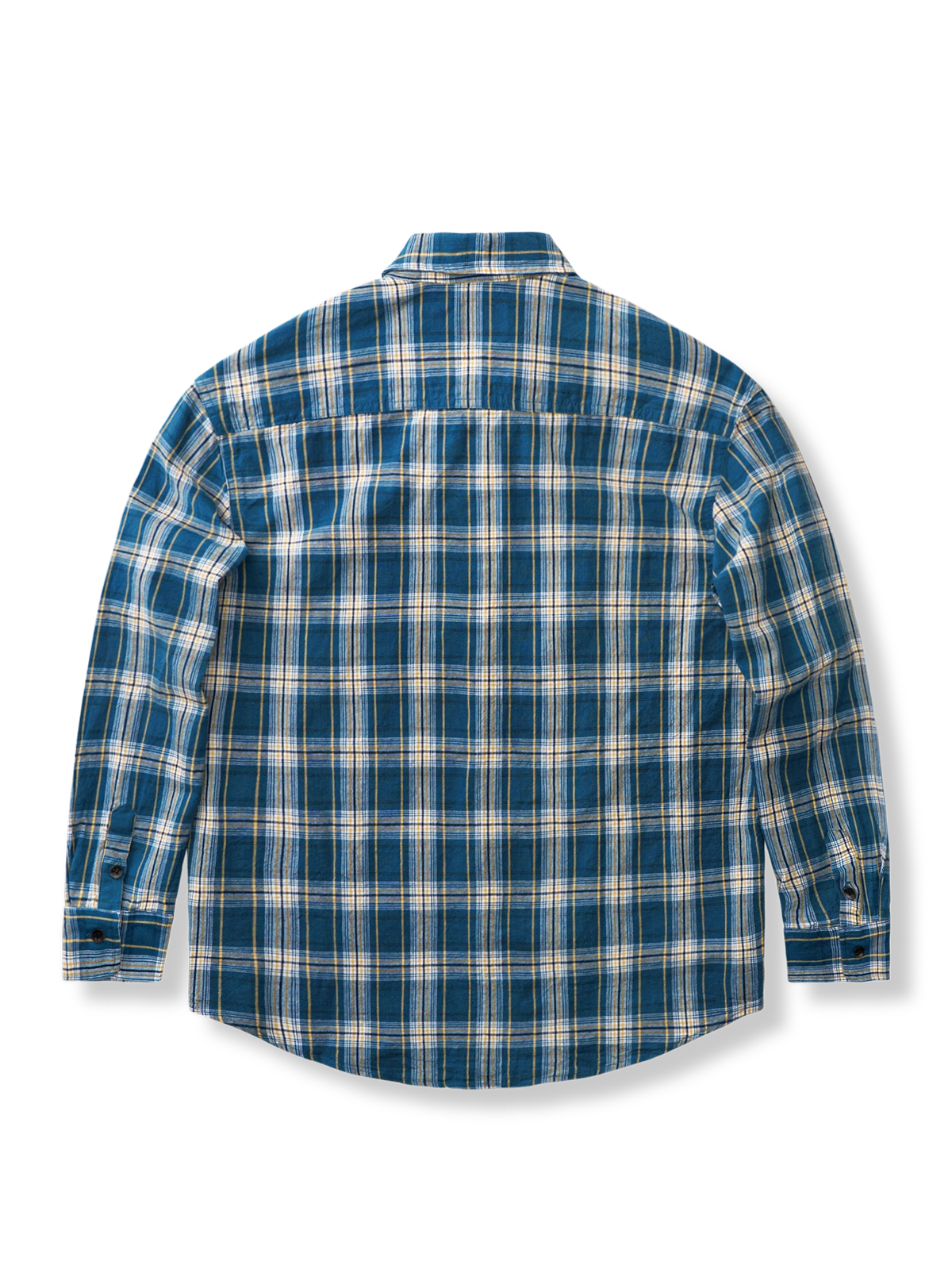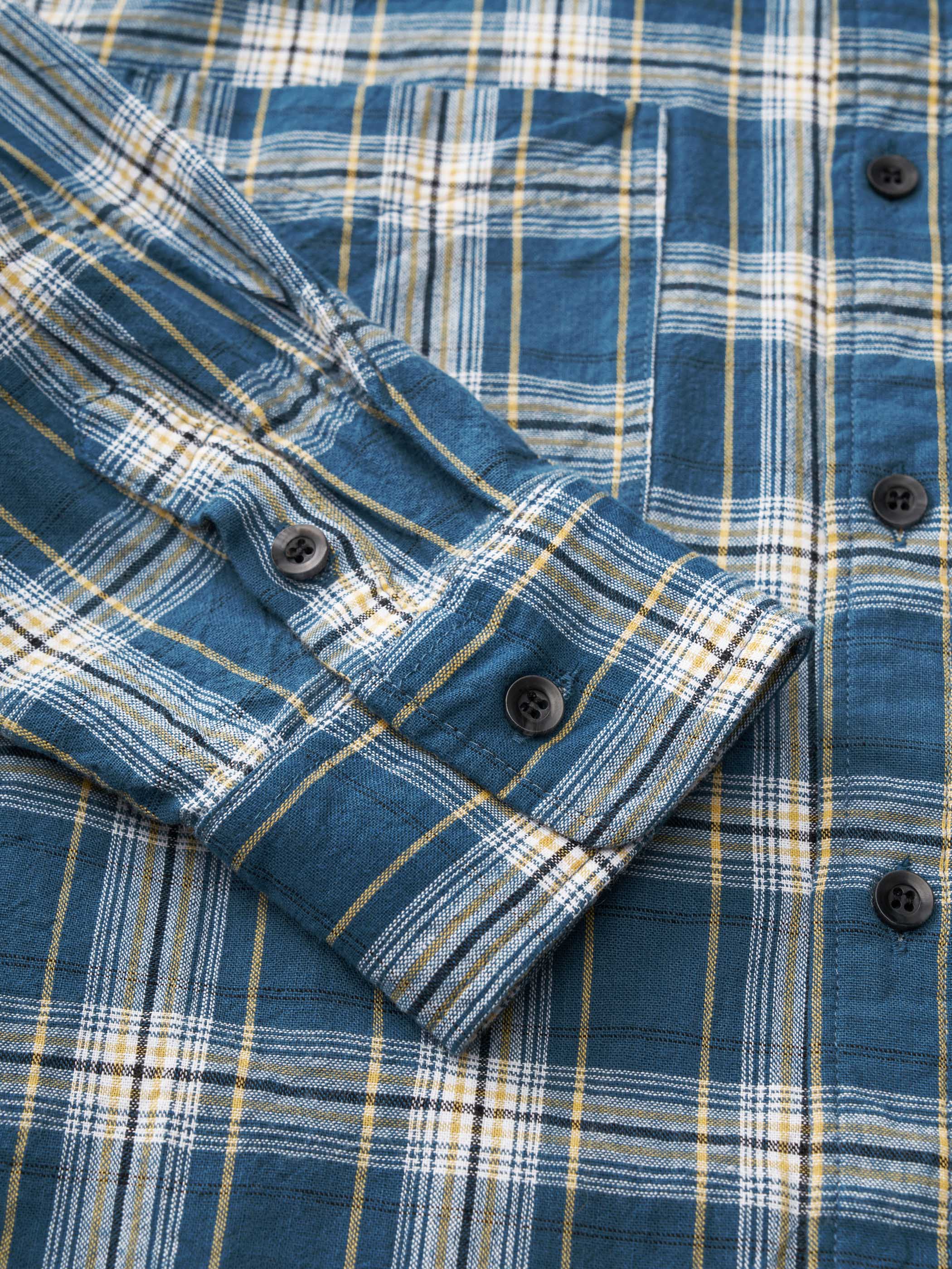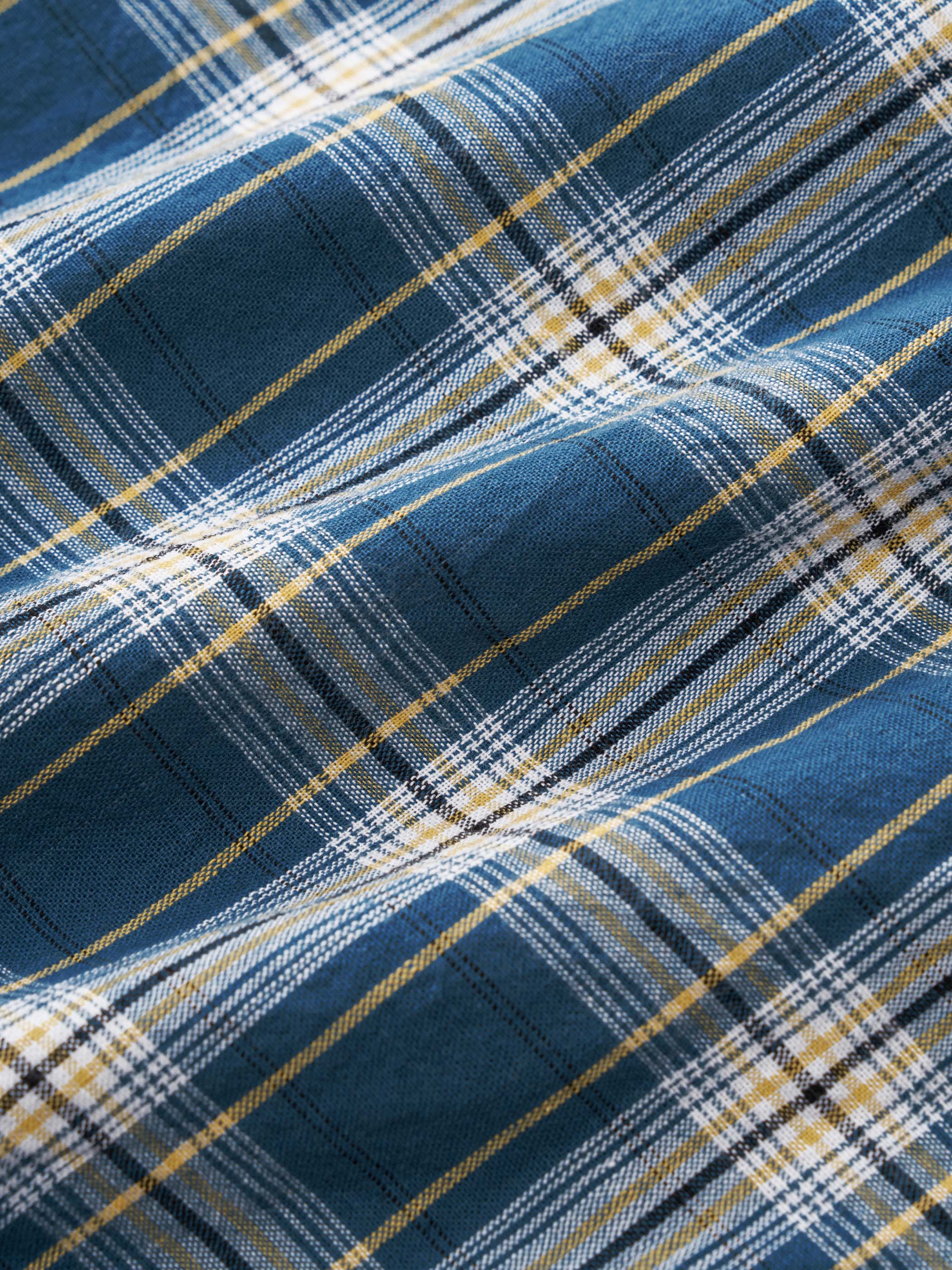 この長袖シャツは、チェック柄のデザインを採用しており、青と黄色の組み合わせが爽やかな白と相性が良く、自然で清新な感覚を醸し出しています。