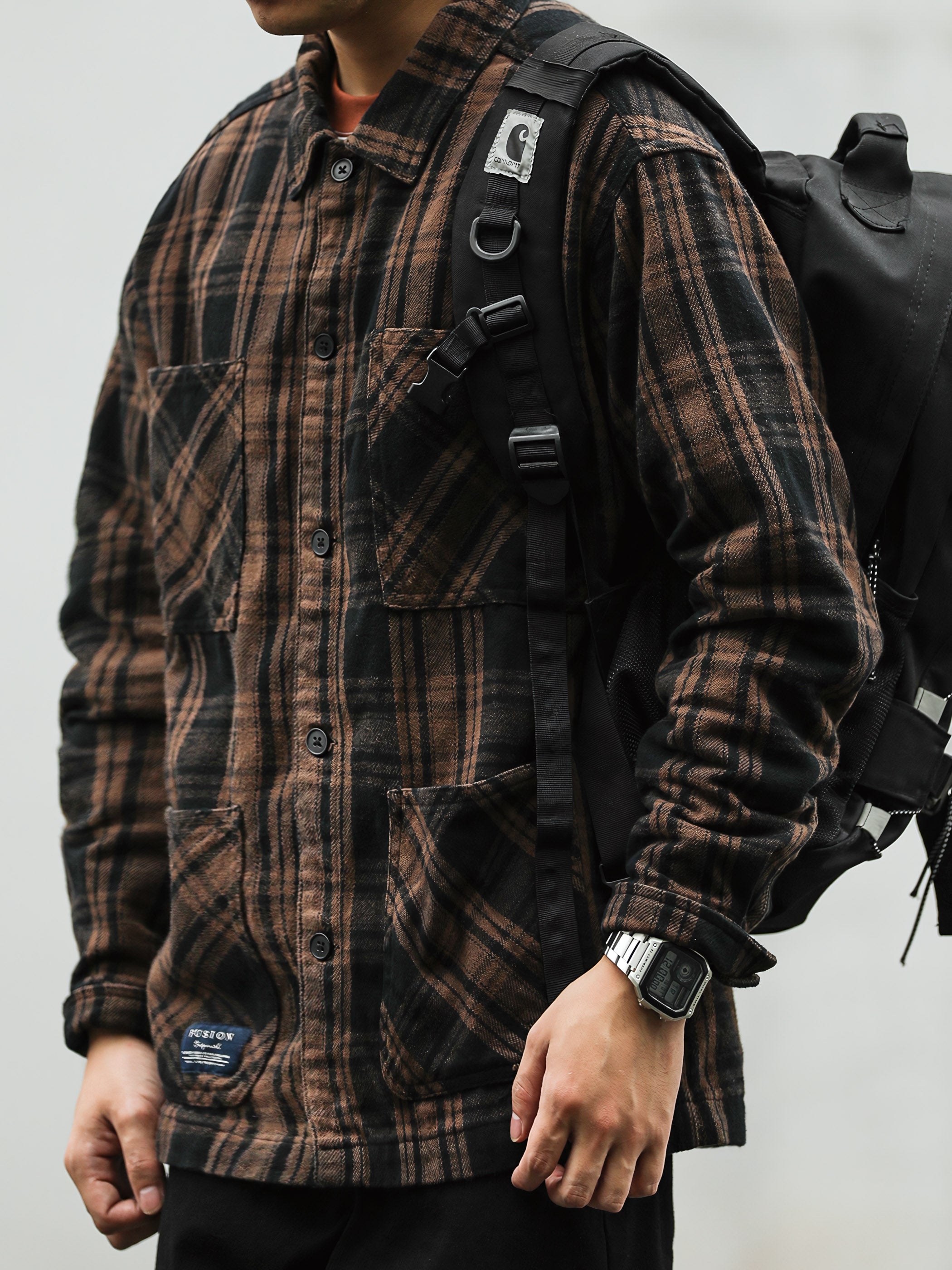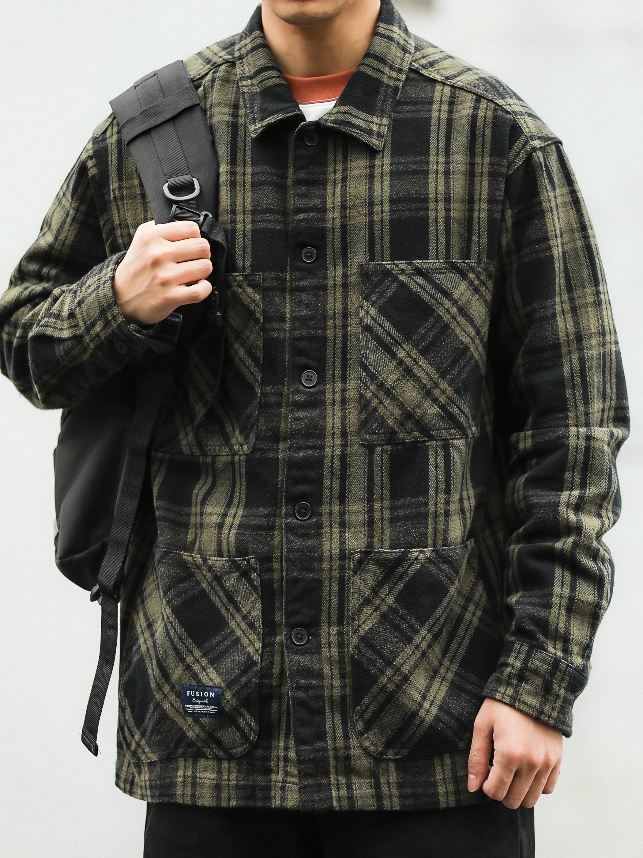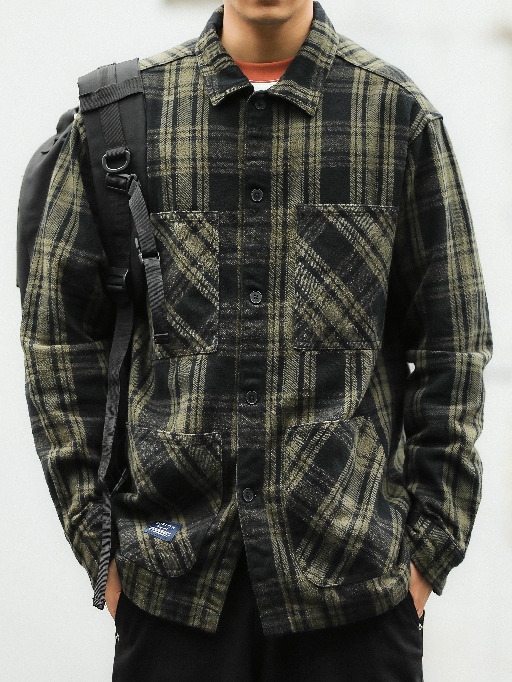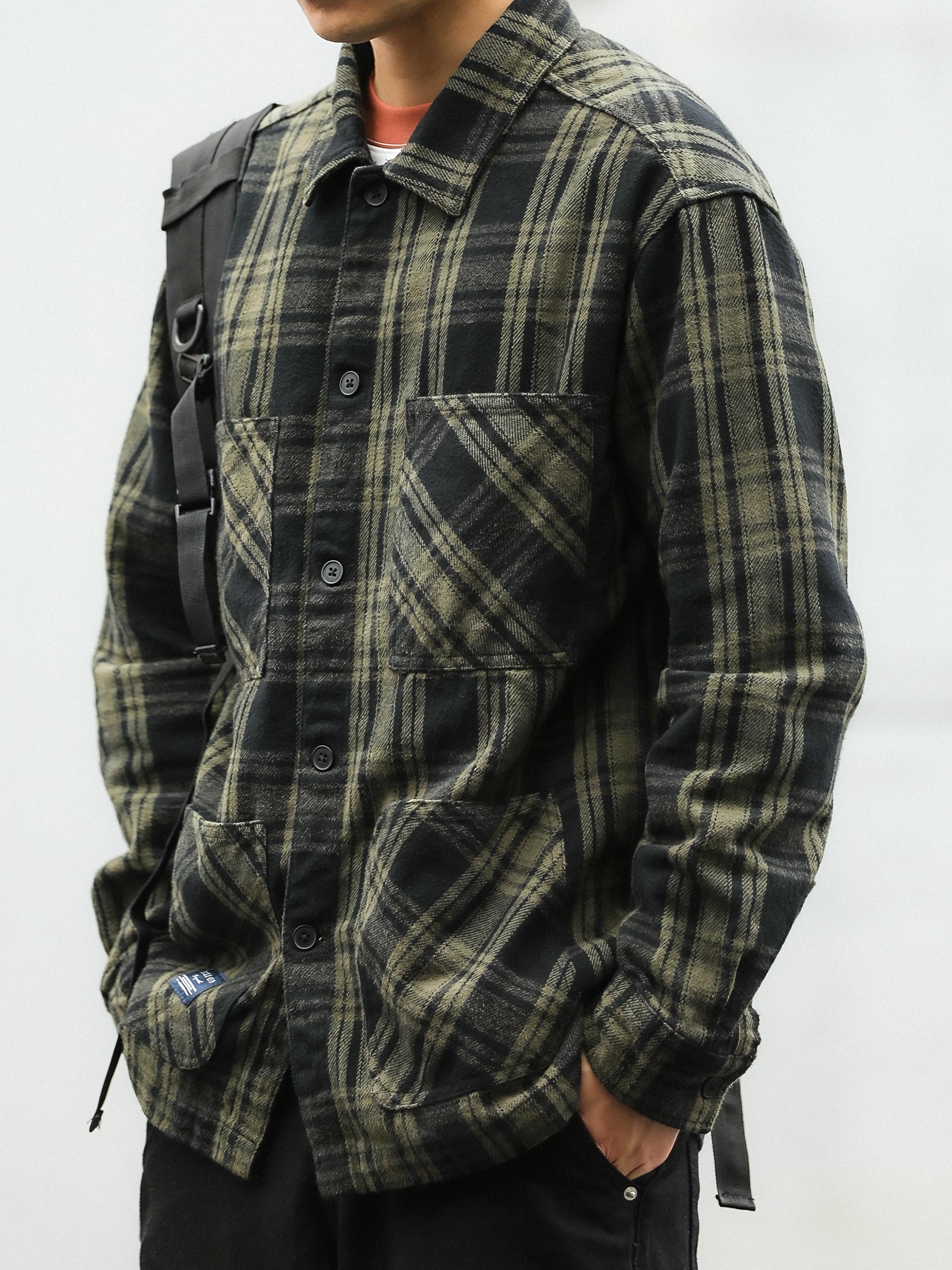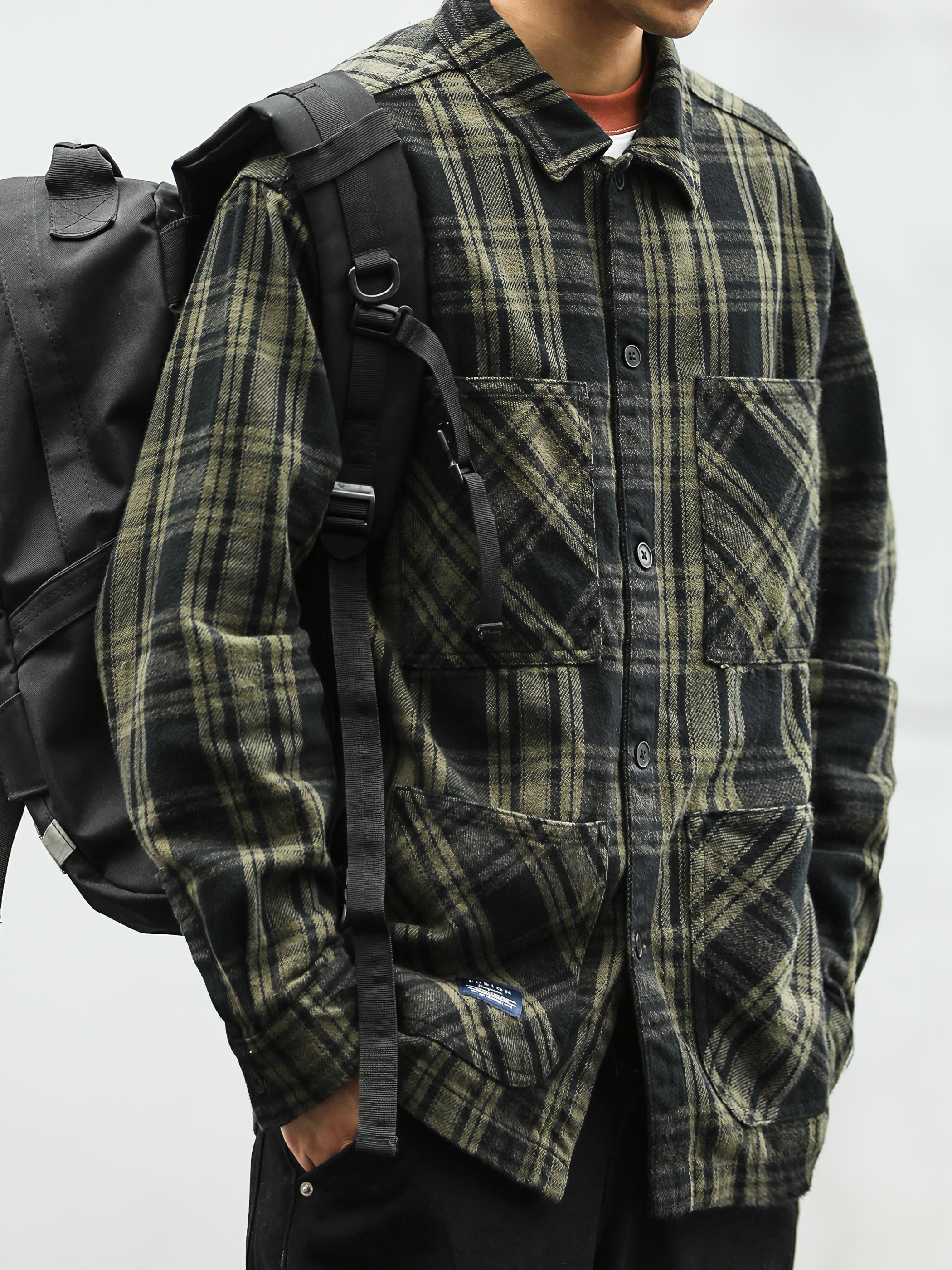 この多ポケットのチェック柄ウールシャツは、折り返し襟と立体的なパッチポケットを備えたユニークなデザインで、ファッション性と個性を引き立てています。ラベルの装飾が全体のデザインを洗練させ、シャツに視覚的な魅力を与えます。2つの異なる色から選ぶことができ、さまざまな着用シーンや個人の好みに対応します。