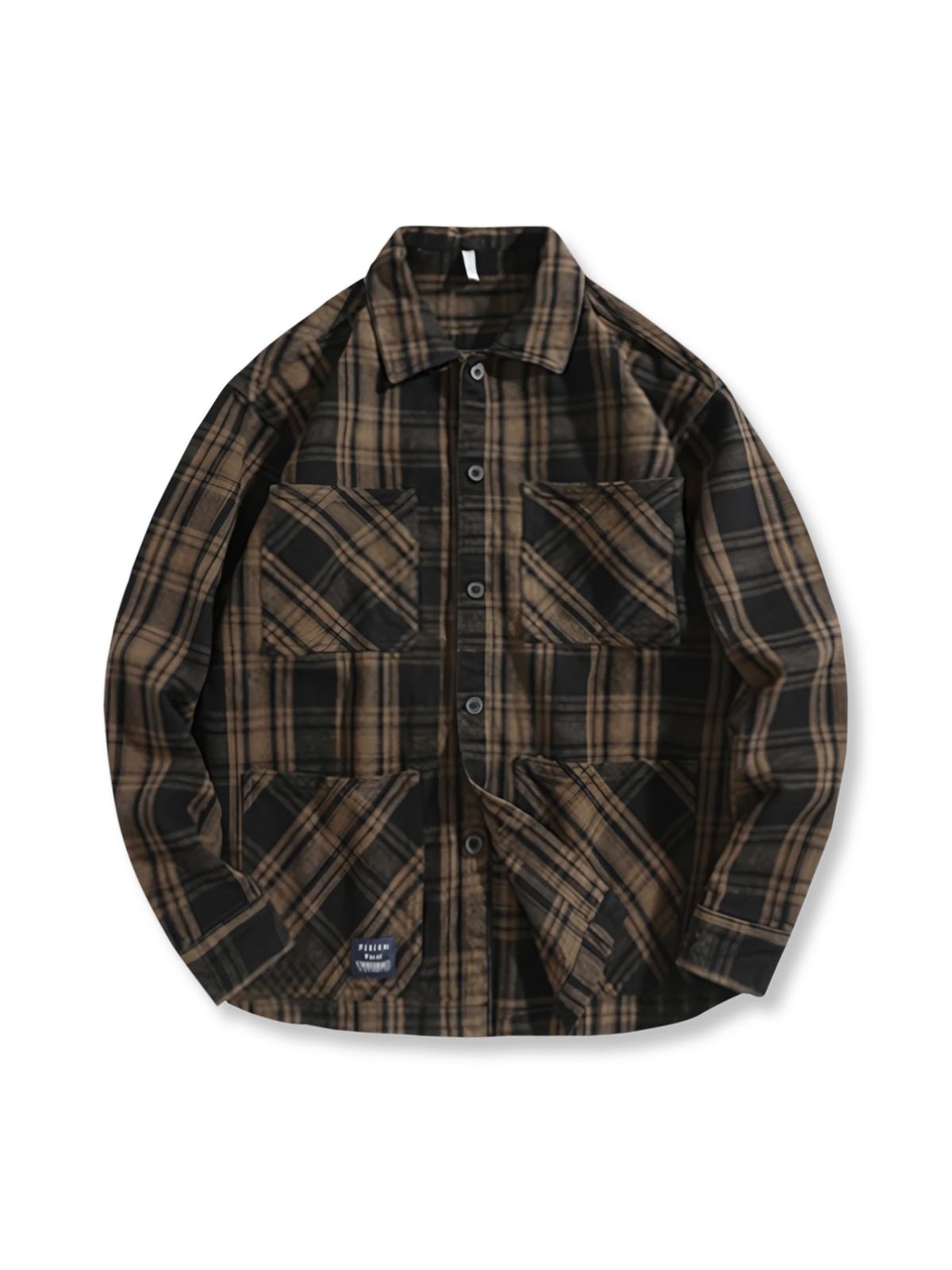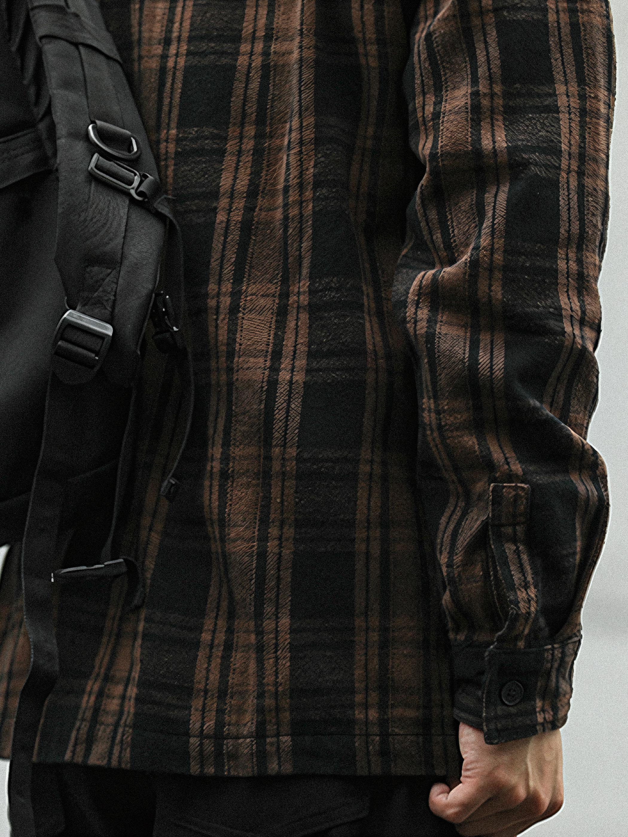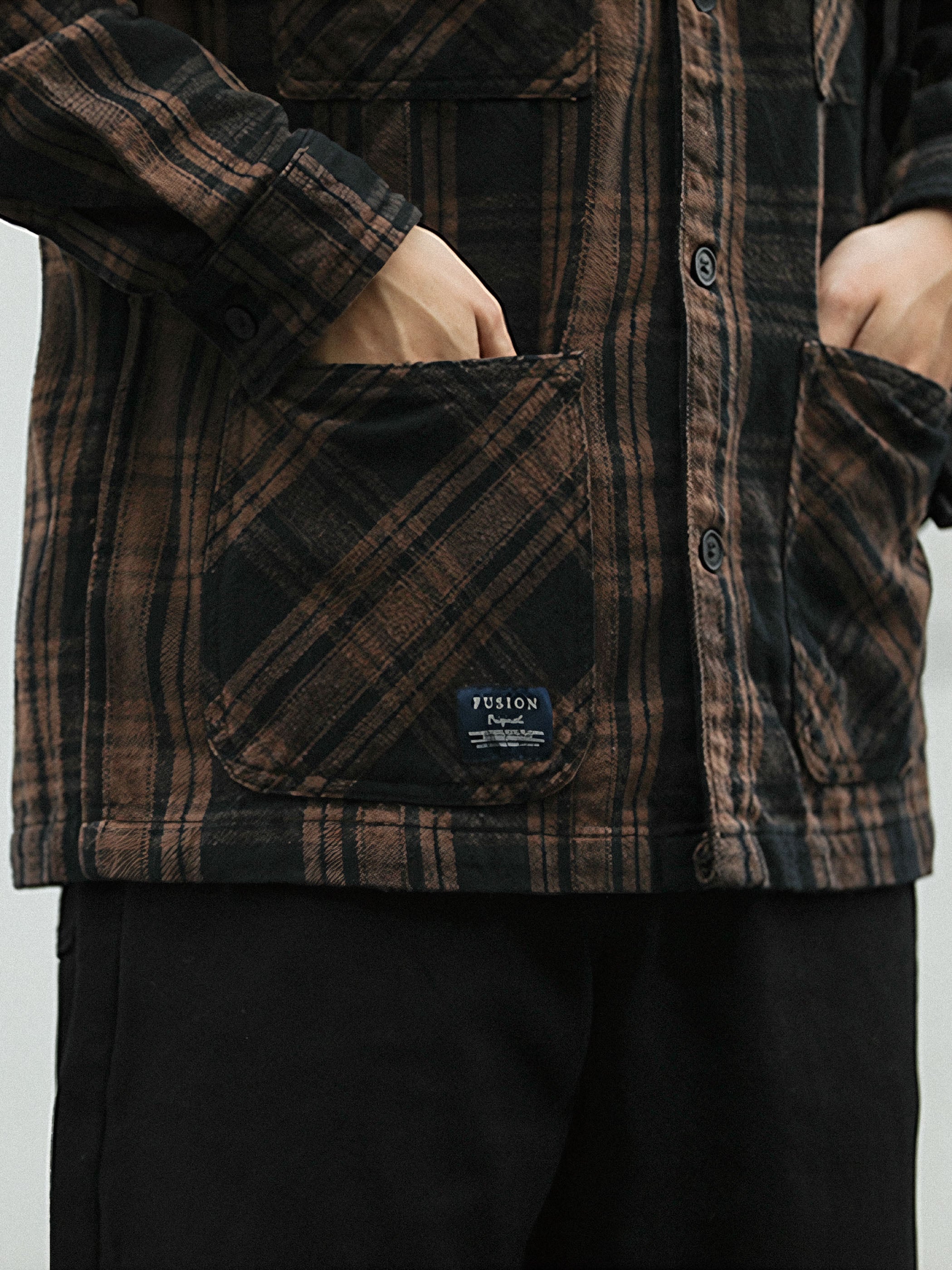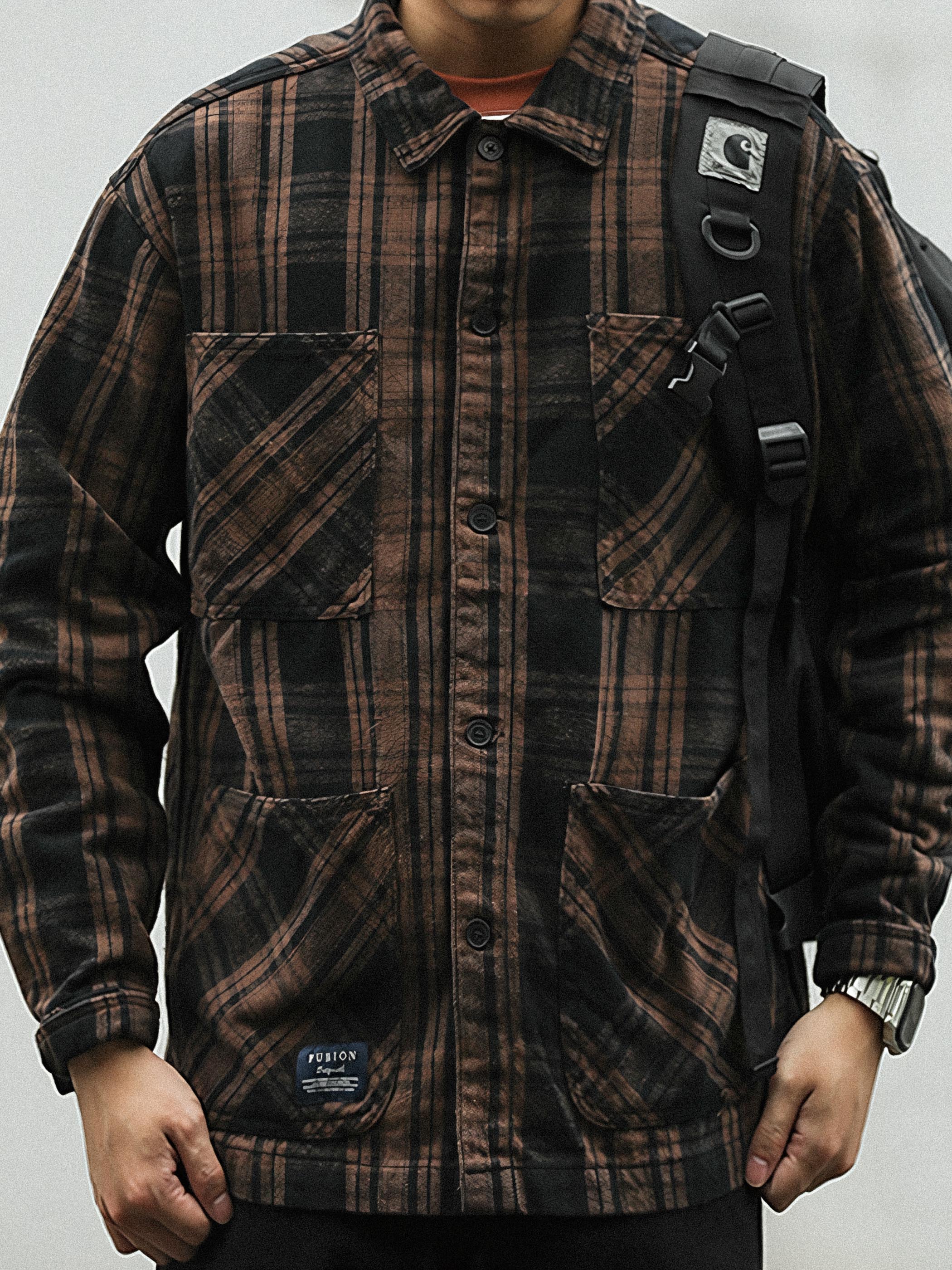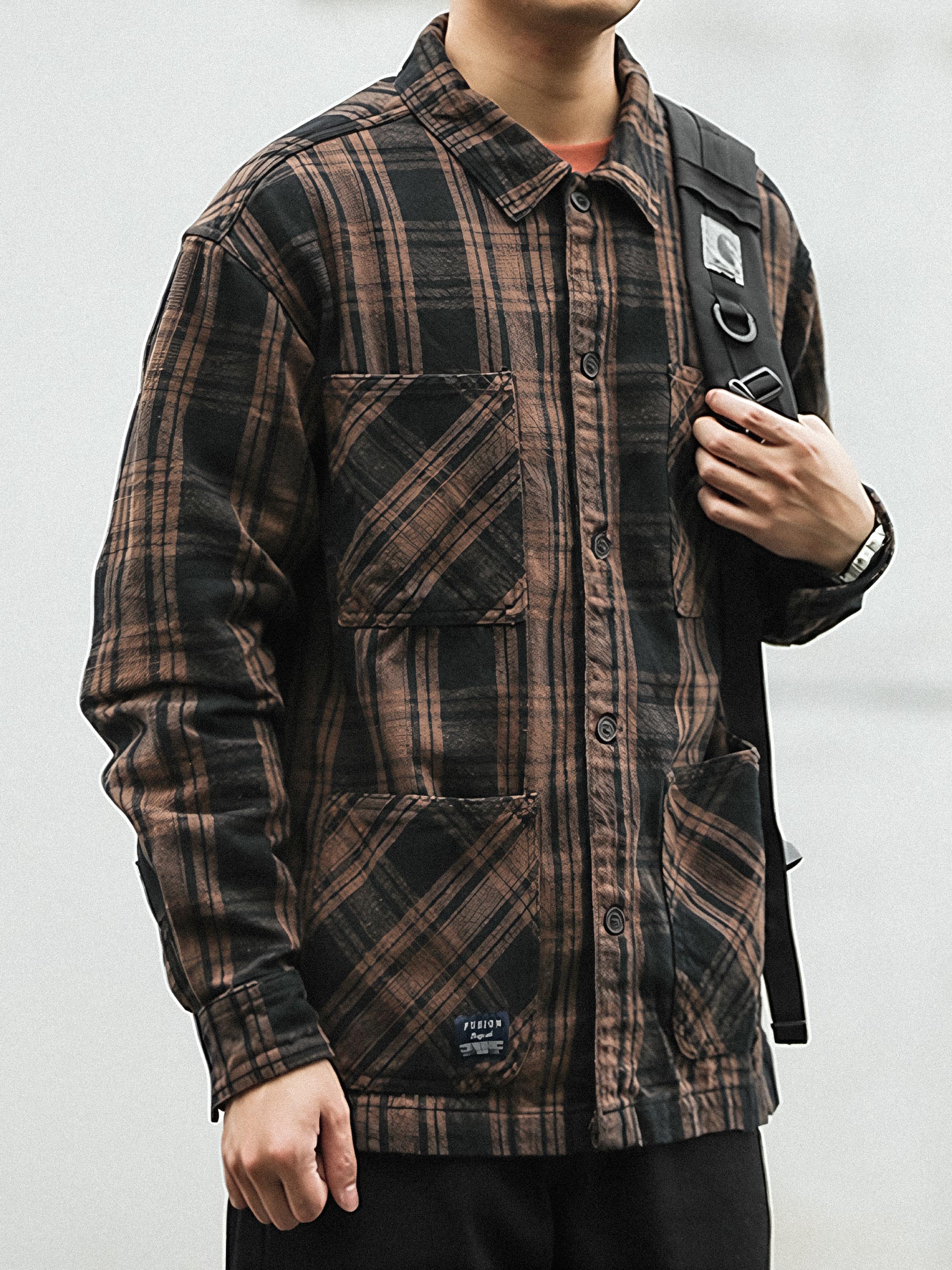 この多ポケットのチェック柄ウールシャツは、折り返し襟と立体的なパッチポケットを備えたユニークなデザインで、ファッション性と個性を引き立てています。ラベルの装飾が全体のデザインを洗練させ、シャツに視覚的な魅力を与えます。2つの異なる色から選ぶことができ、さまざまな着用シーンや個人の好みに対応します。