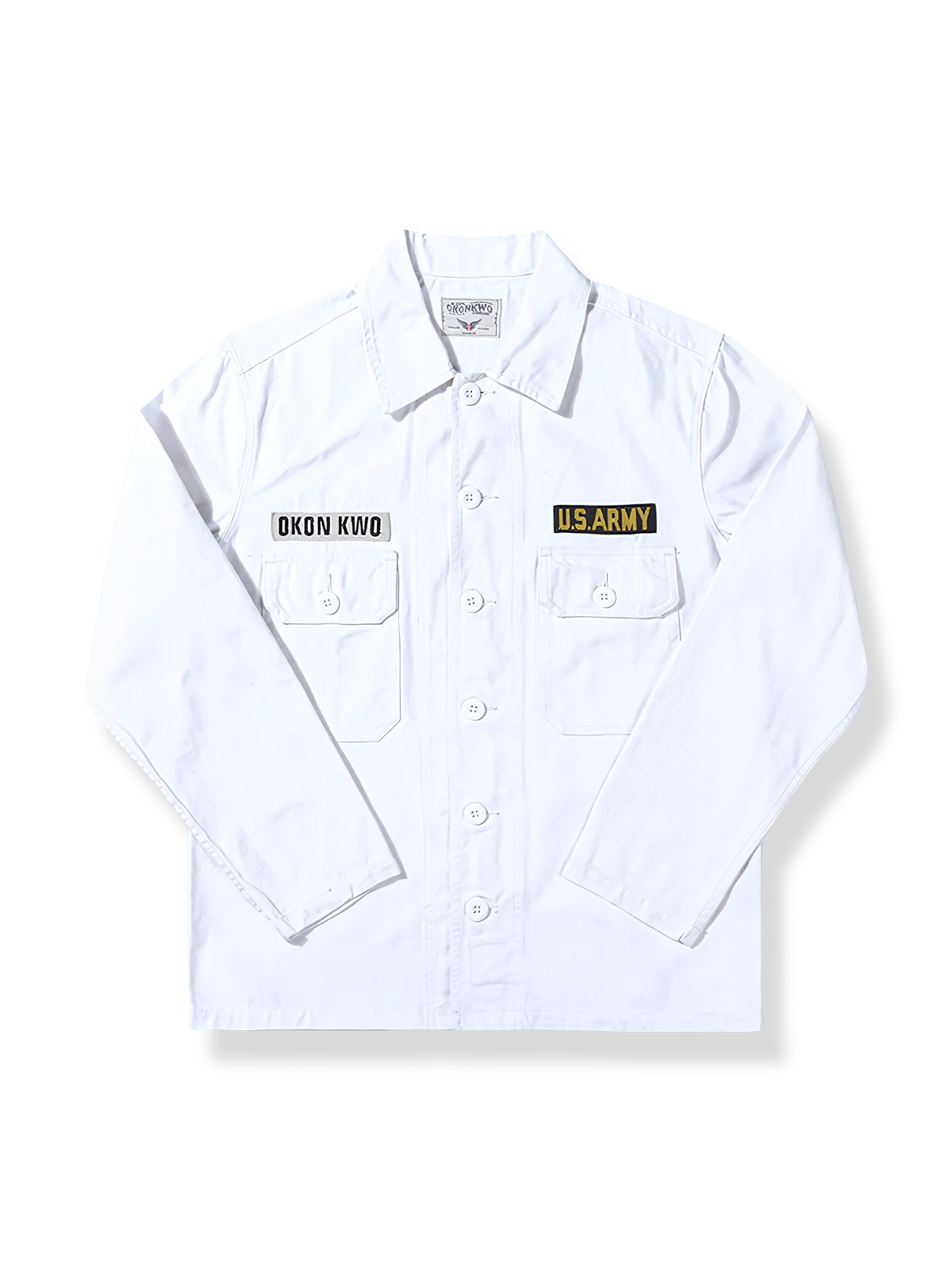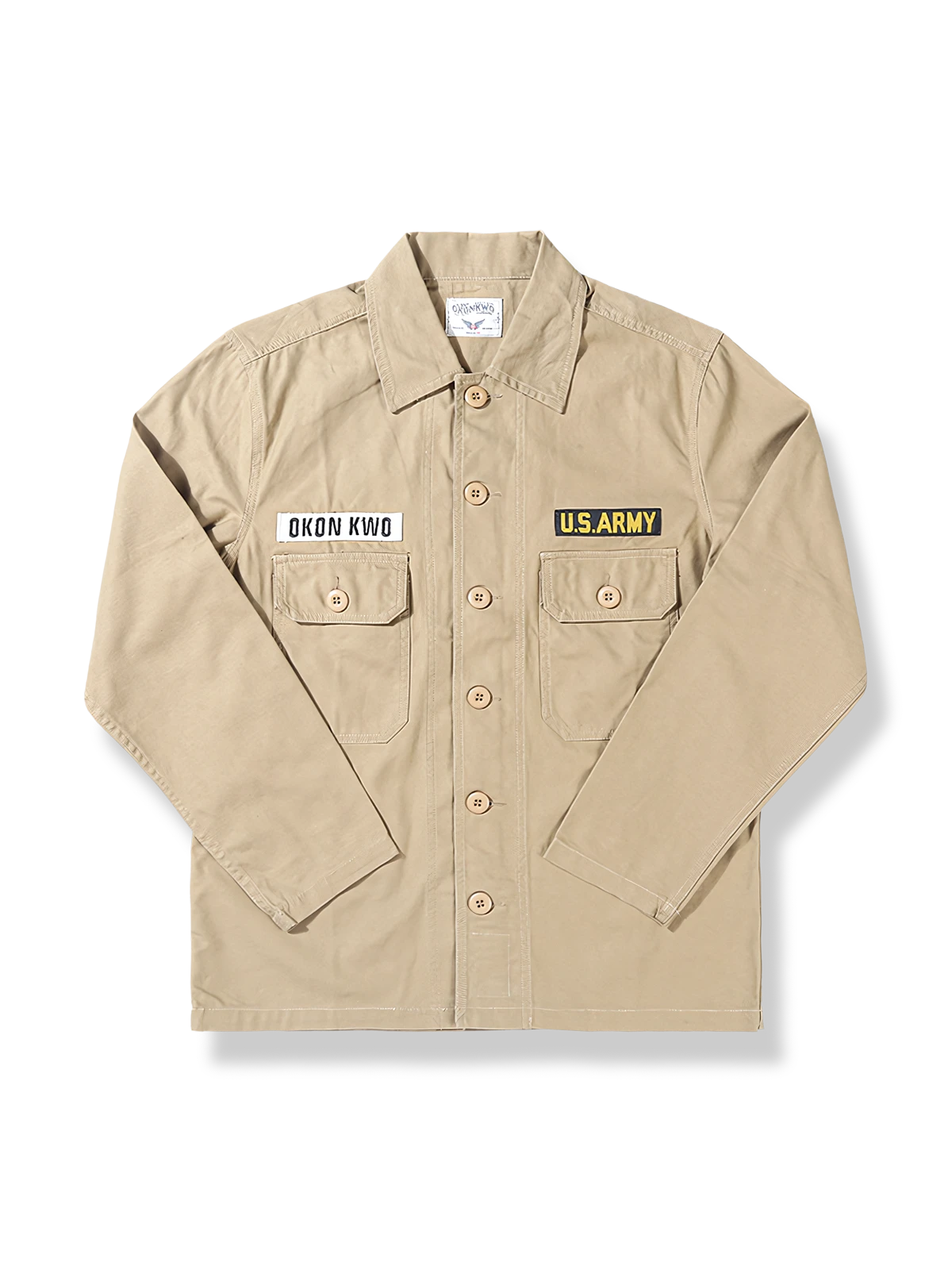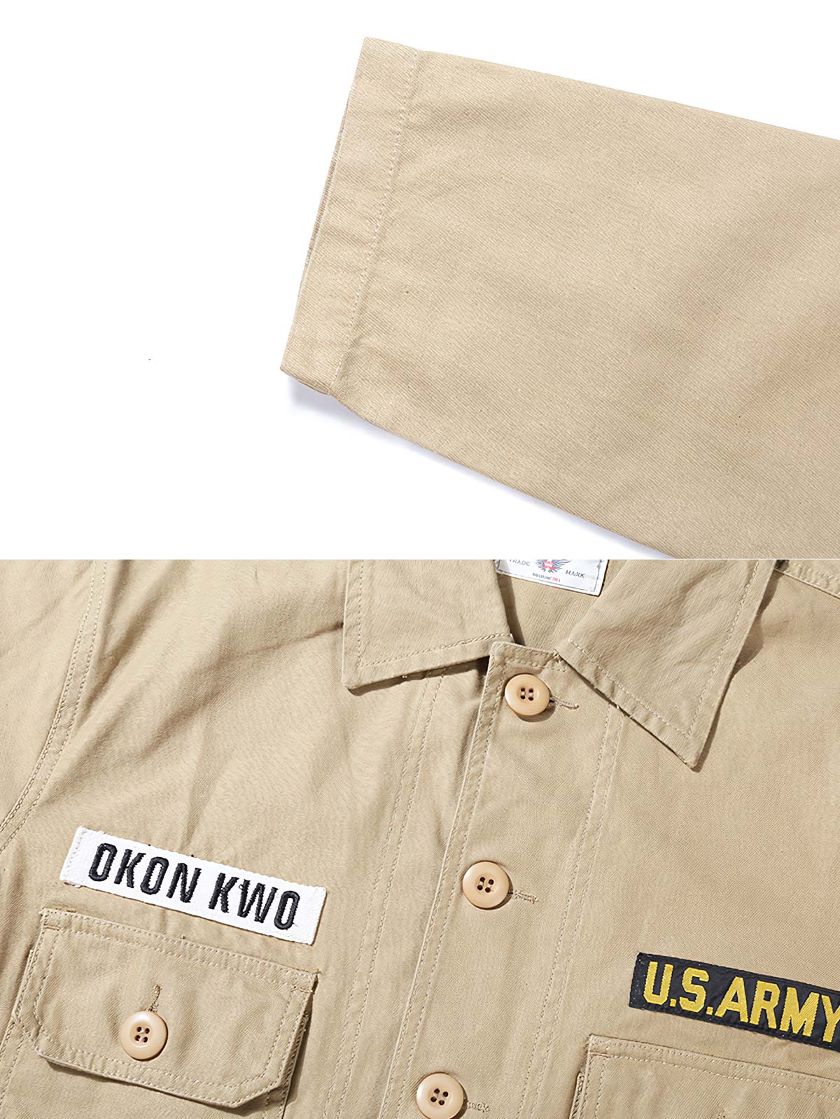 そのデザインは、第二次世界大戦時の軍服の機能性とシンプルなスタイルを体現し、クラシックなオリーブグリーンと顕著な「U.S.ARMY」の文字は、軍事史への敬意であると同時に、現代のポピュラーなレトロトレンドの象徴的な要素です。精巧なディテール処理、例えば二つのポケットのデザインや前立ての対称的なボタン配置は、実用性を高めながら美しさも損ないません。