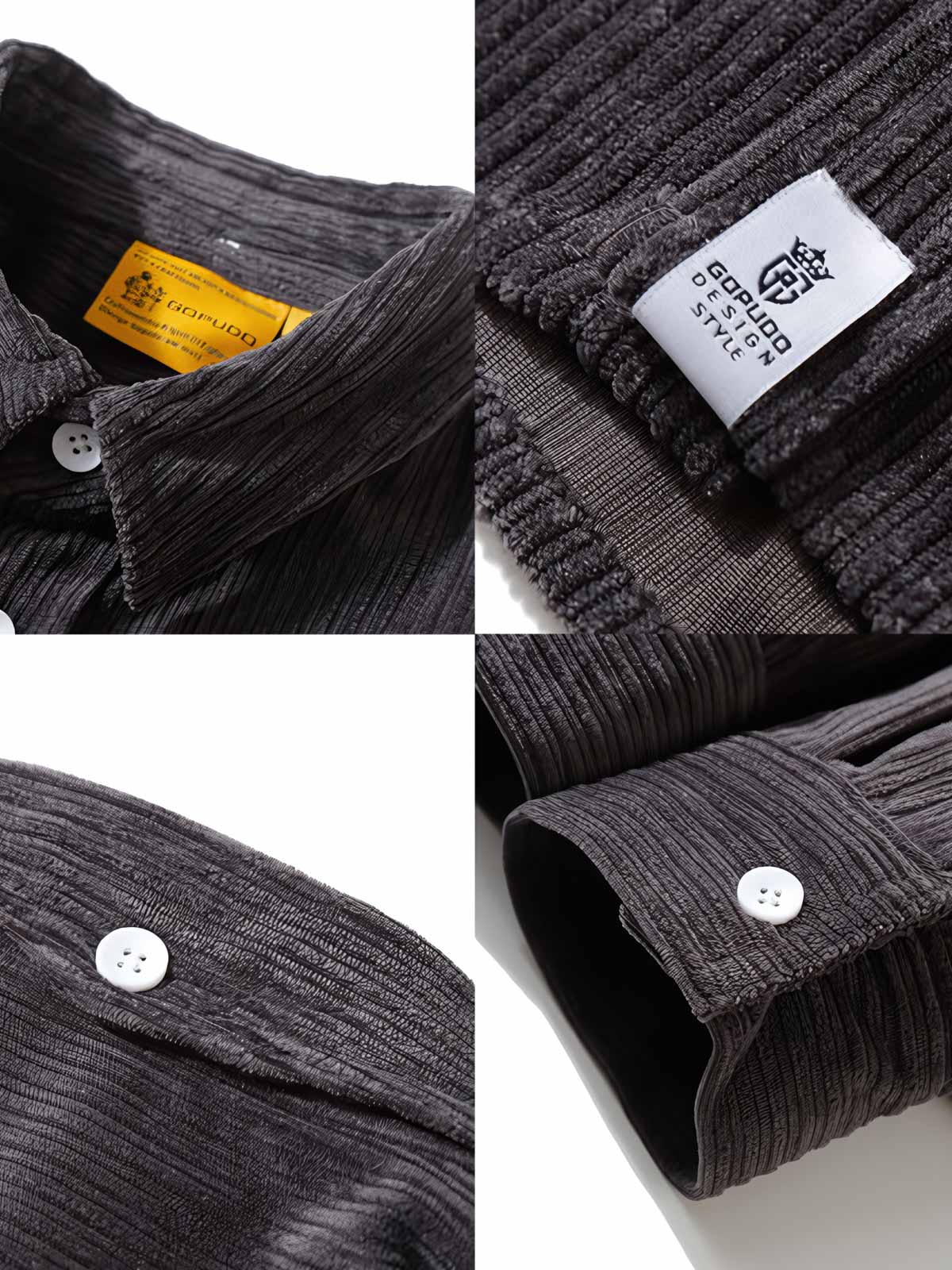 これらのコーデュロイシャツは、クラシックなカジュアルウェアのスタイルからインスピレーションを得ています。コーデュロイは、耐久性と独特の質感で知られる歴史ある生地で、秋冬の服装に広く使用されています。シャツの裾はわずかに丸みを帯びており、袖口と襟のデザインはシンプルで、インナーとしても、一枚で着用しても適しています。