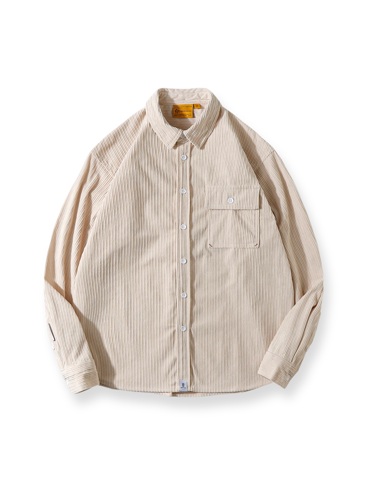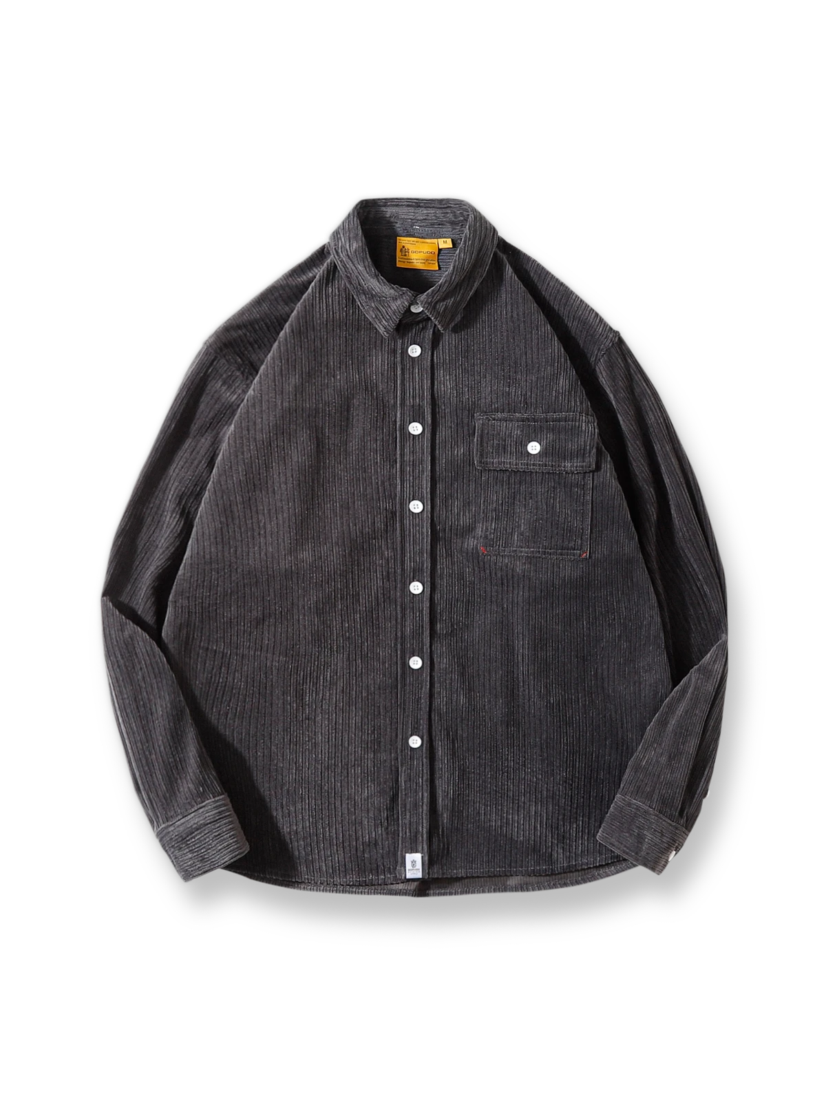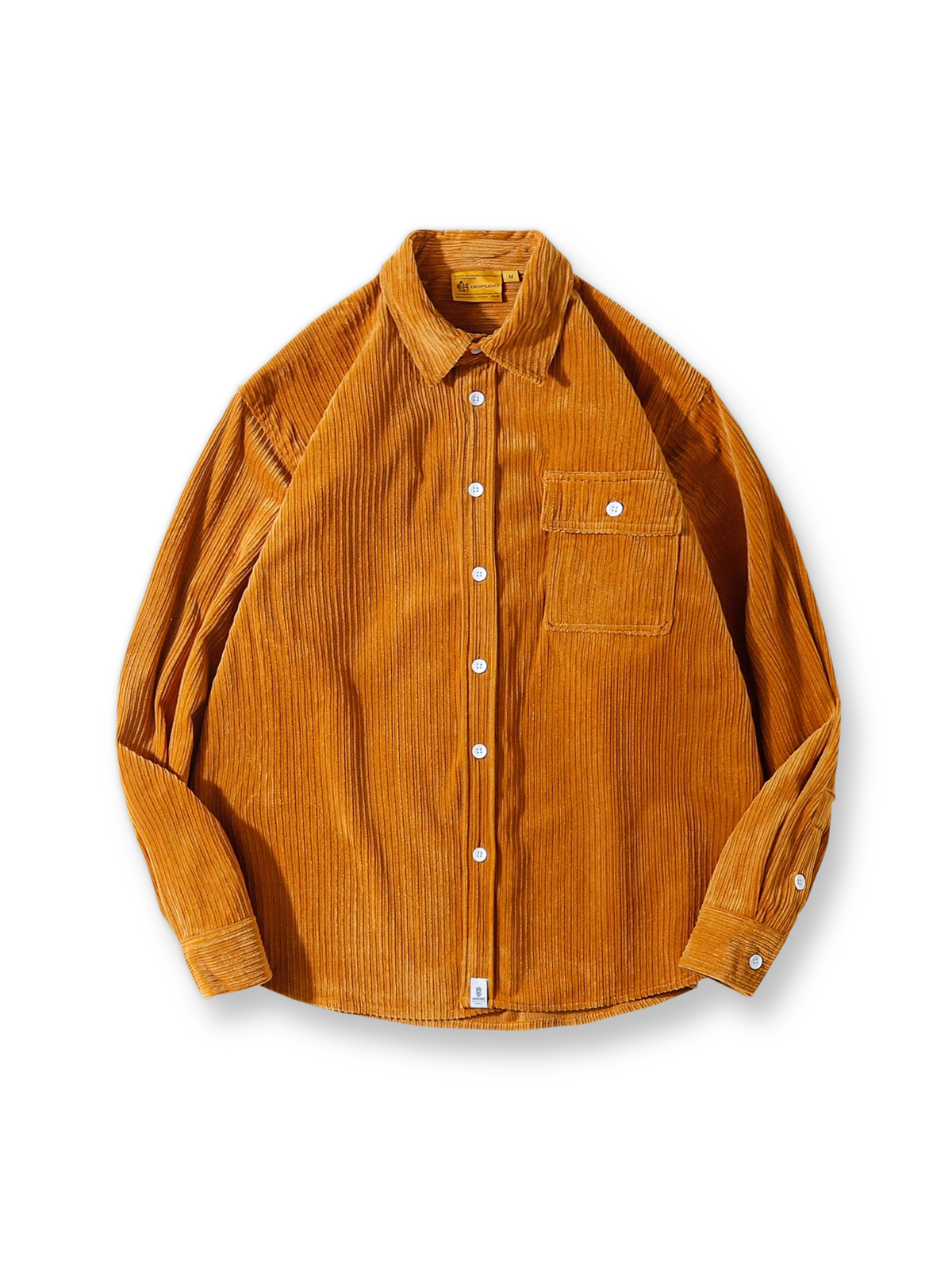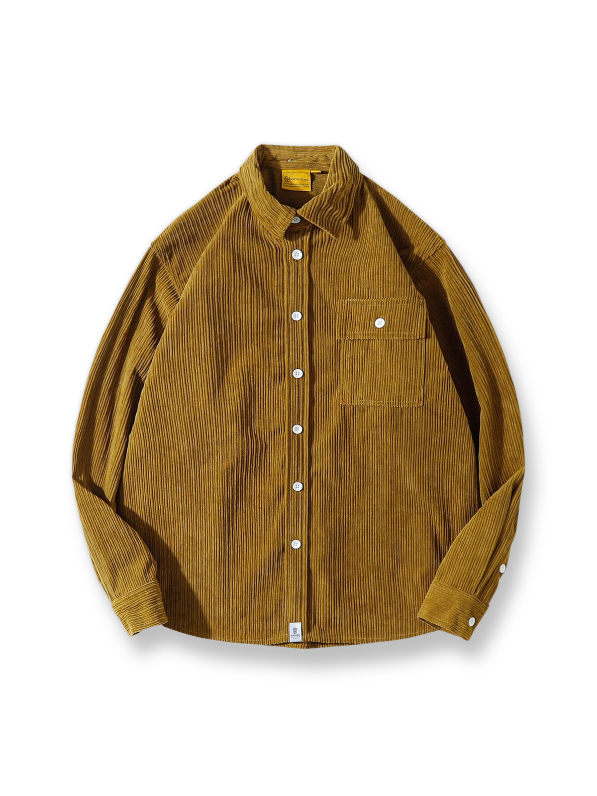 使用されているコーデュロイは、細かい繊維のある綿素材で、幅広のストライプは豊かな触感を提供し、視覚的な層を加えます。シャツの細部の処理、例えば同色のボタンや精密な縫製は、工芸への厳格な姿勢を反映しています。