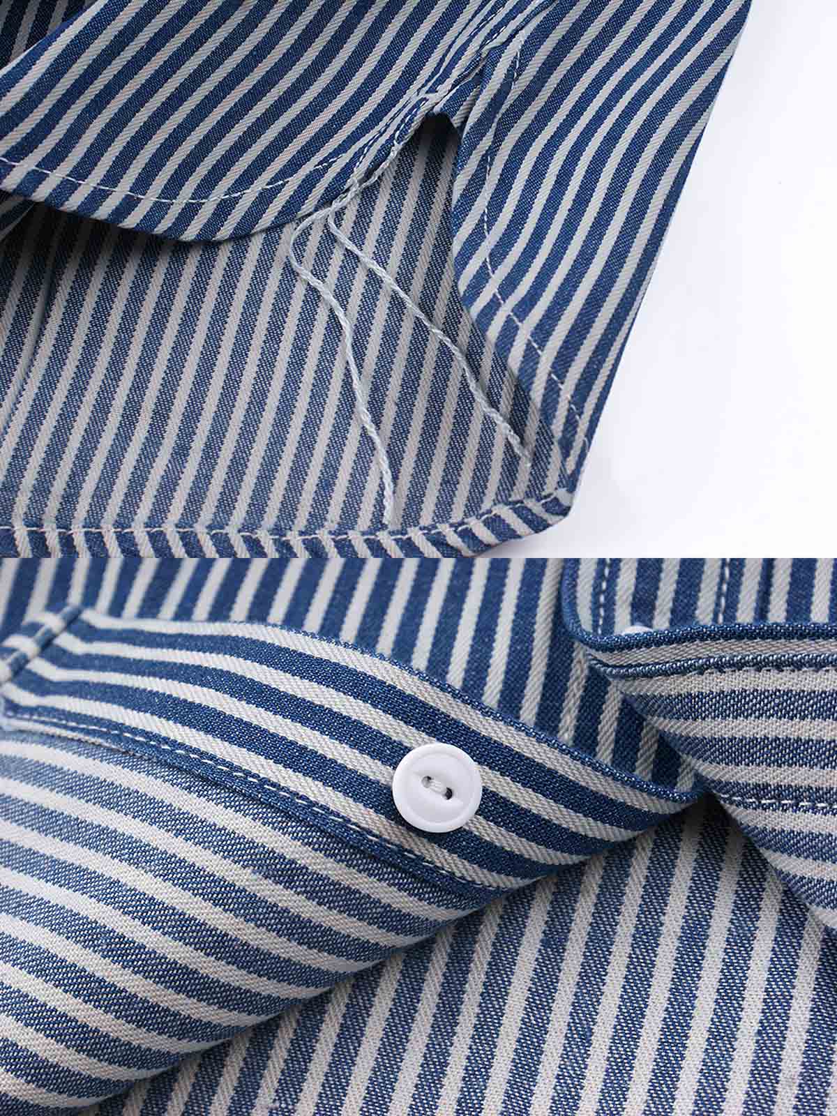 シャツは合体しているが窮屈ではなく、快適な着用体験を確保しています。深い紺色の綿麻混紡布地は、衣類の通気性と快適さを高めていますが、太いストライプのキャンバス布地は質感を追加しています。