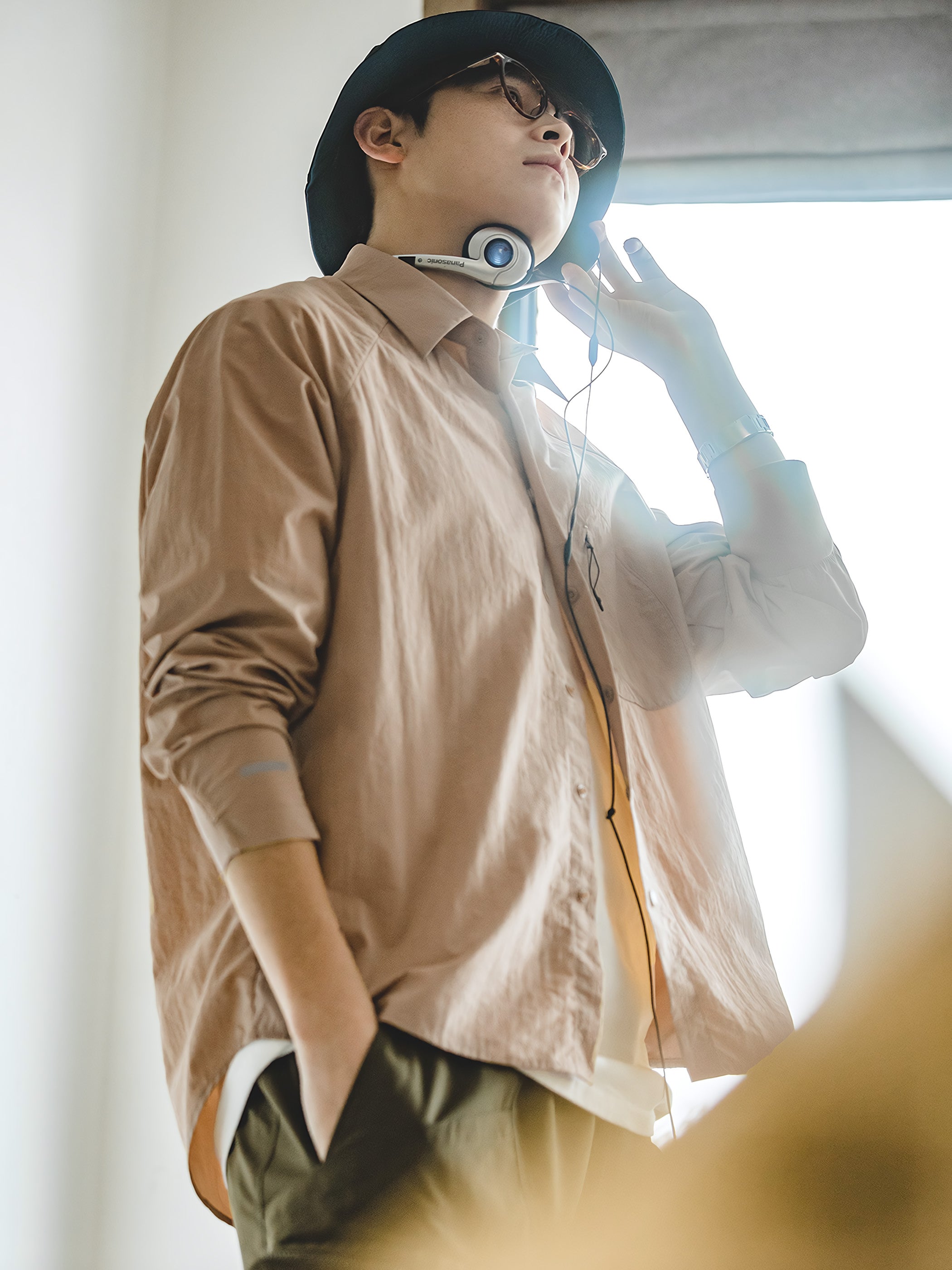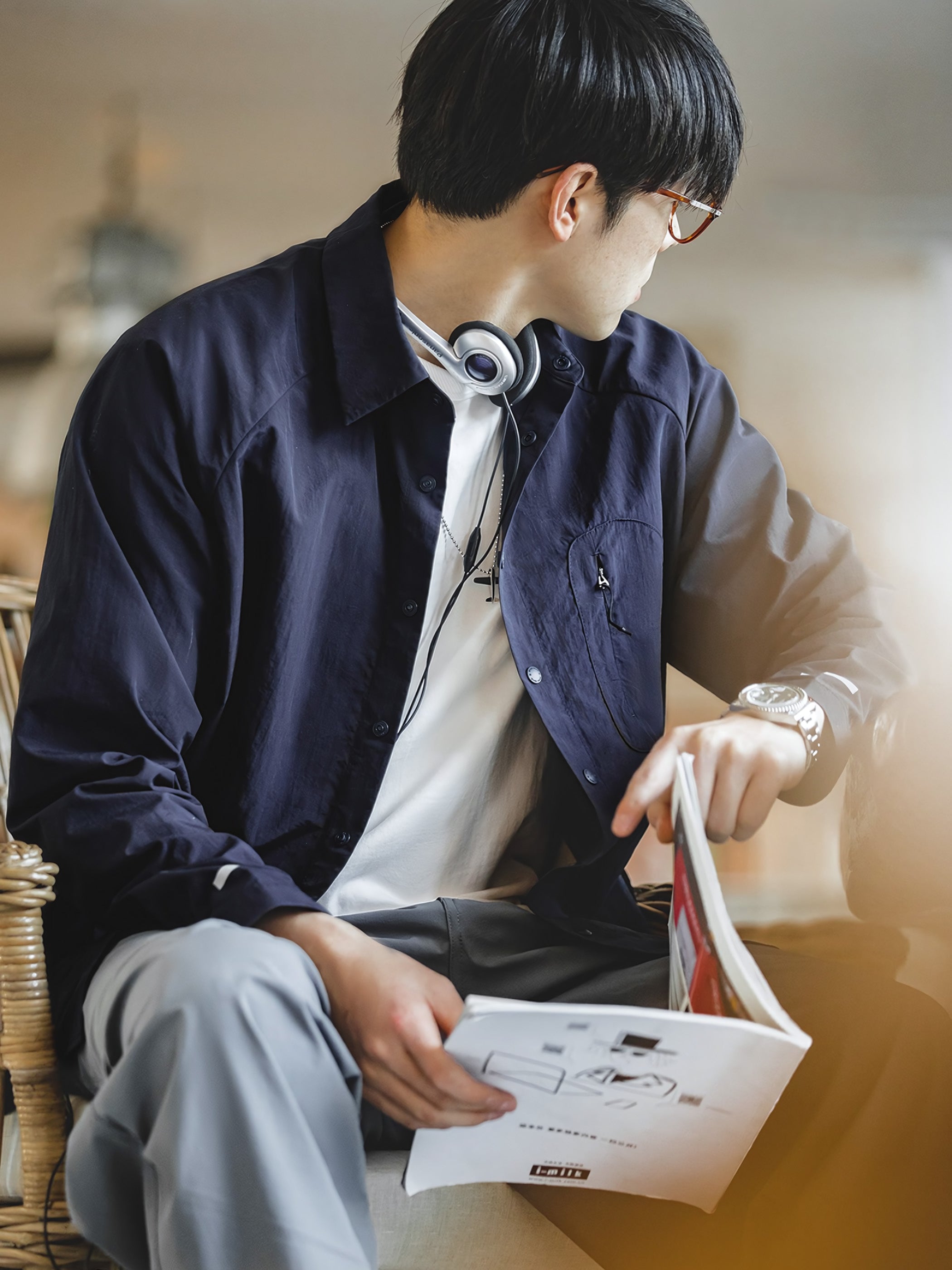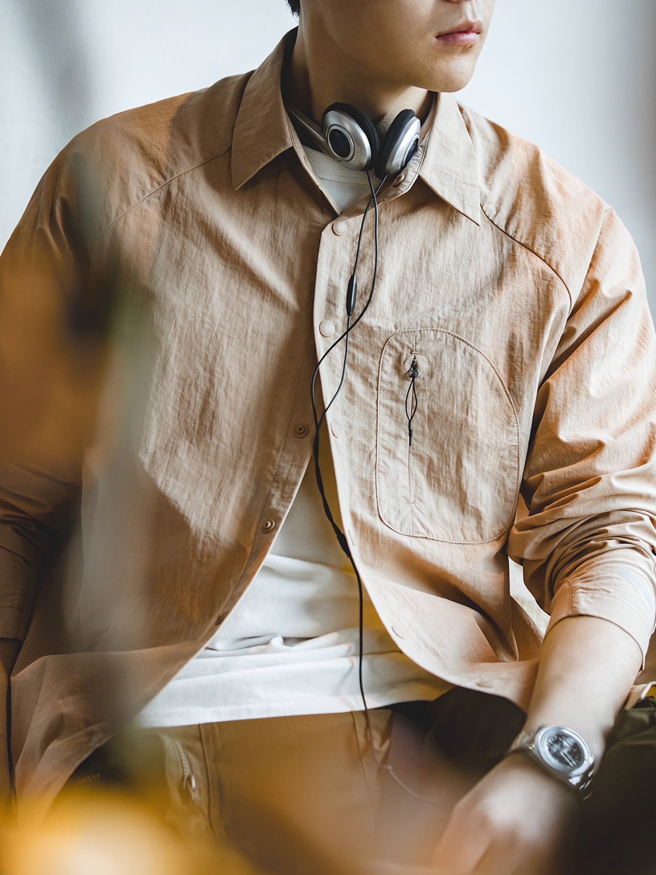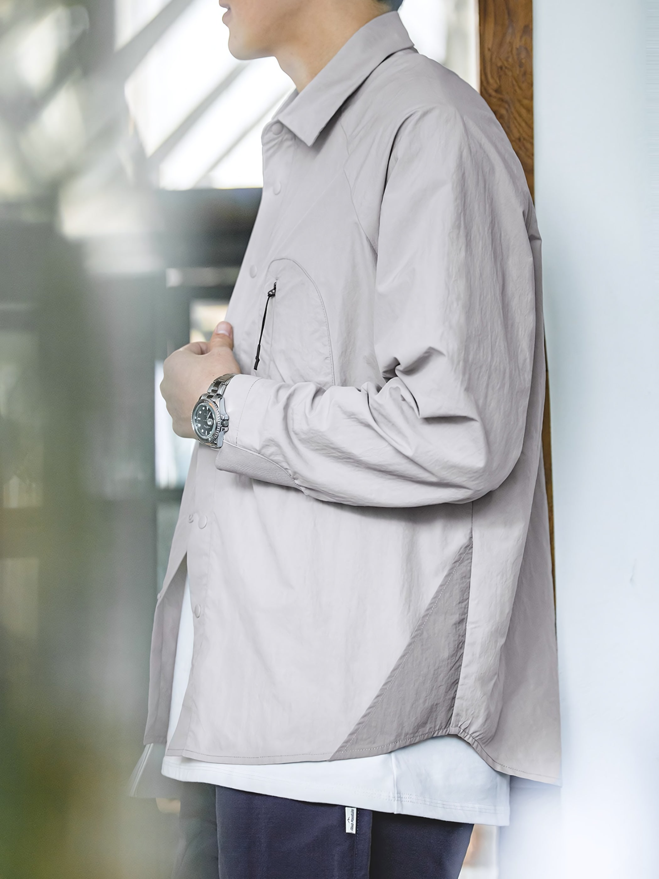 シャツのシルエットは全体的にハードで洗練されており、同時に袖口には伸縮性のあるゴムが使われており、袖口が手首によりフィットし、快適性が増しました。