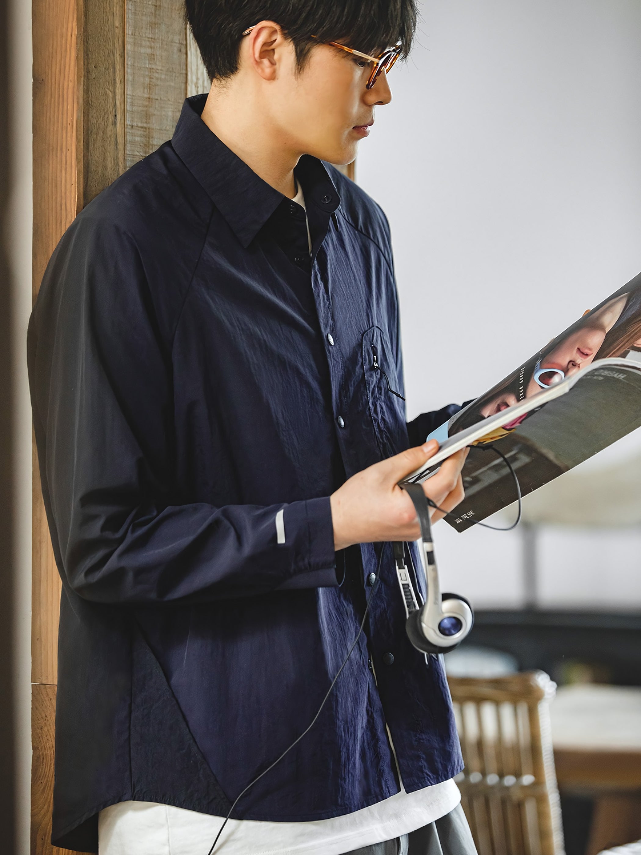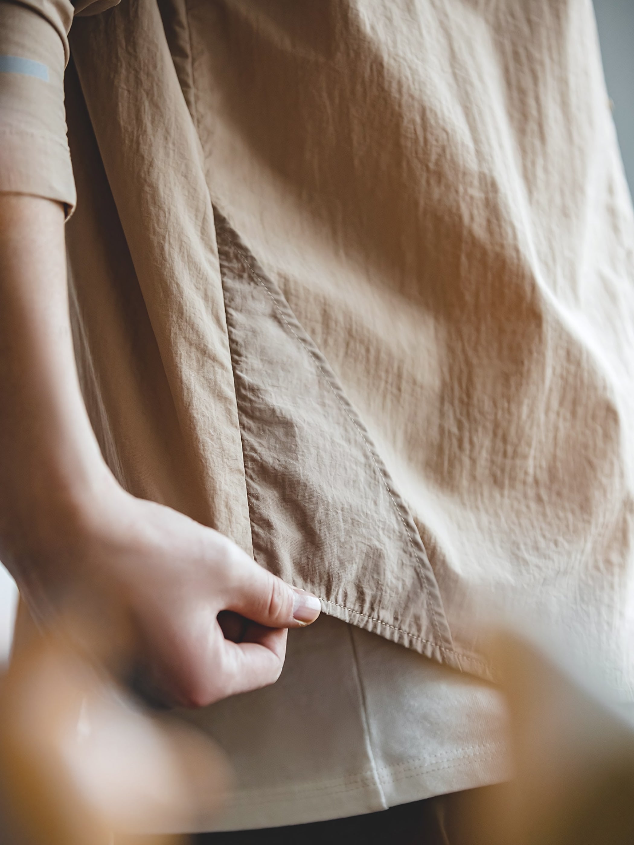 このシャツは薄手の長袖デザインで、選べる3つの低彩度カラーが自由に選べます。布面のウォッシャブル加工により、衬衫にはマットな質感と独自のテクスチャーが備わり、ユニークなディテールが魅力的です。衬衫の裾に組み込まれたジオメトリックな裁断部分が構造的な要素を融合し、全体的なスタイリングをより特別で印象的にします。