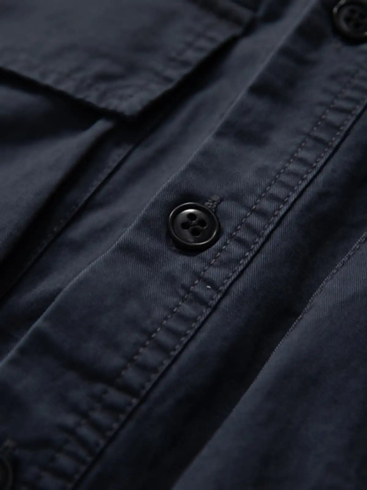 アメリカンヴィンテージのワークジャケットをイメージし、両胸にフラップ付き立体ポケットを配置。深めのマチと縫い込みによるボックスシルエットは、収納力とミリタリーテイストを両立しつつ、着用時のドロップショルダーがリラックスした雰囲気を演出。100%コットンの平織り生地は適度なハリと通気性を備え、夏でも涼しく快適な着心地をキープ。オリーブグリーン、ライトグレー、ネイビーブルーの3色で展開し、どの色もデニムやチノ、ミリタリーパンツと合わせやすい。ショーツやスリムパンツを合わせれば、シンプルながら男らしいミリタリーミックススタイルが完成する。