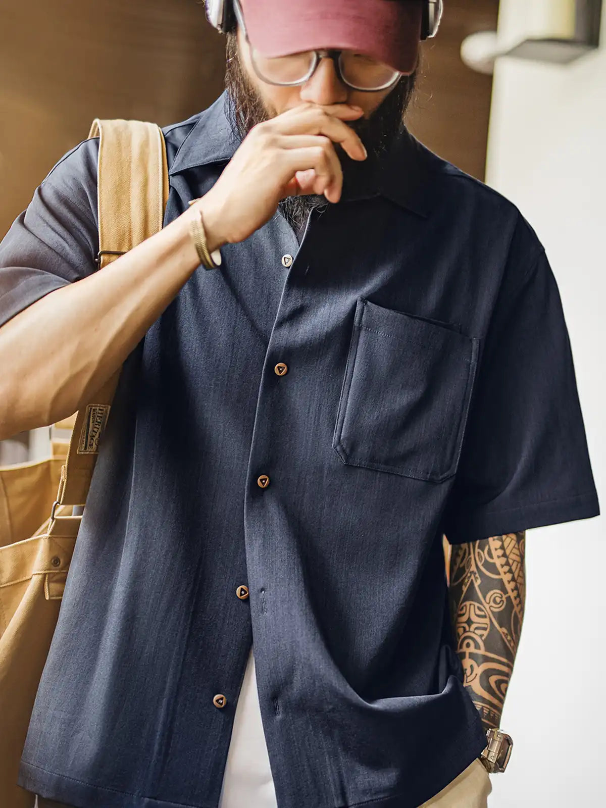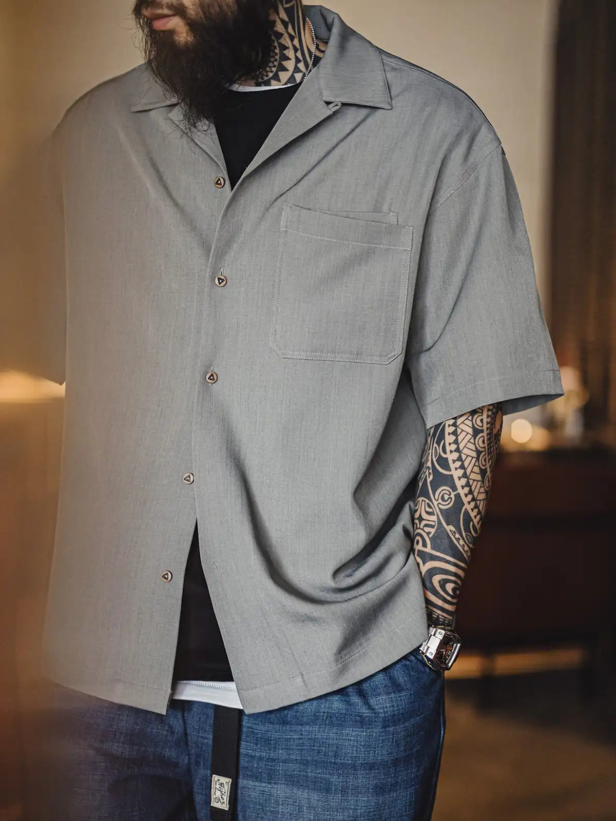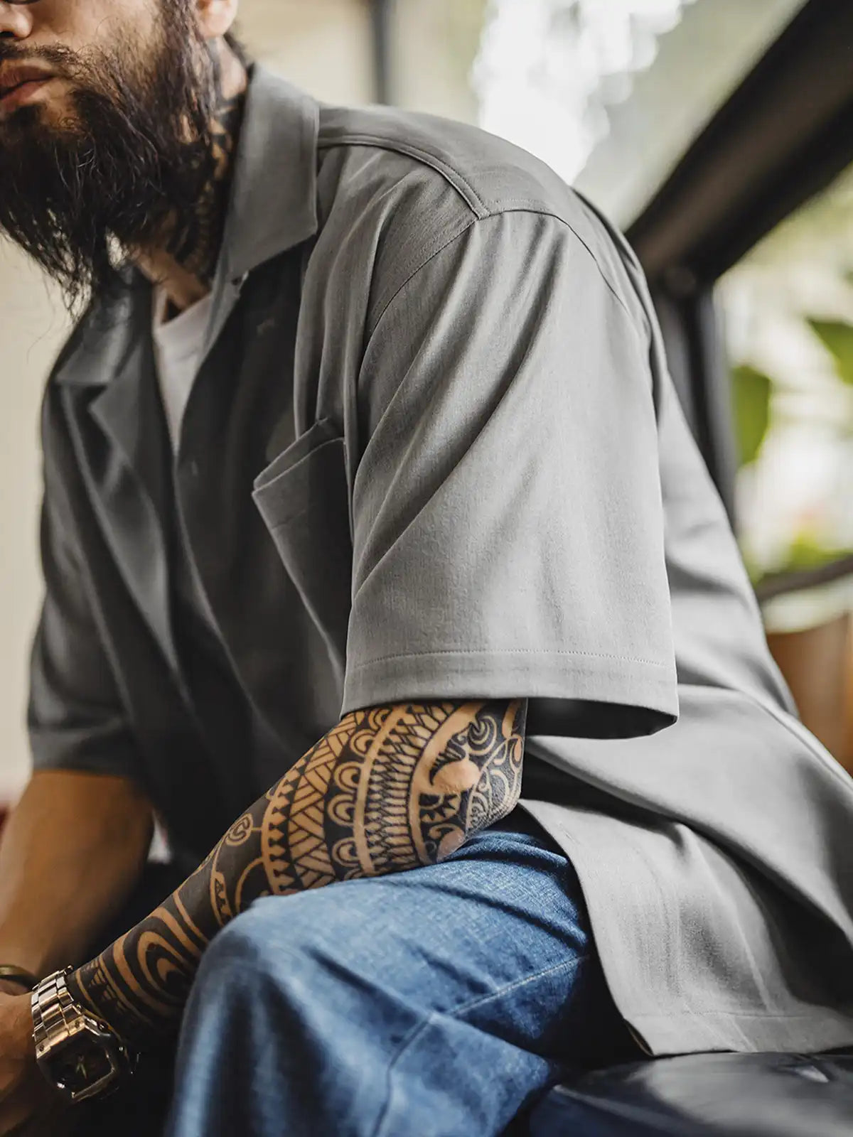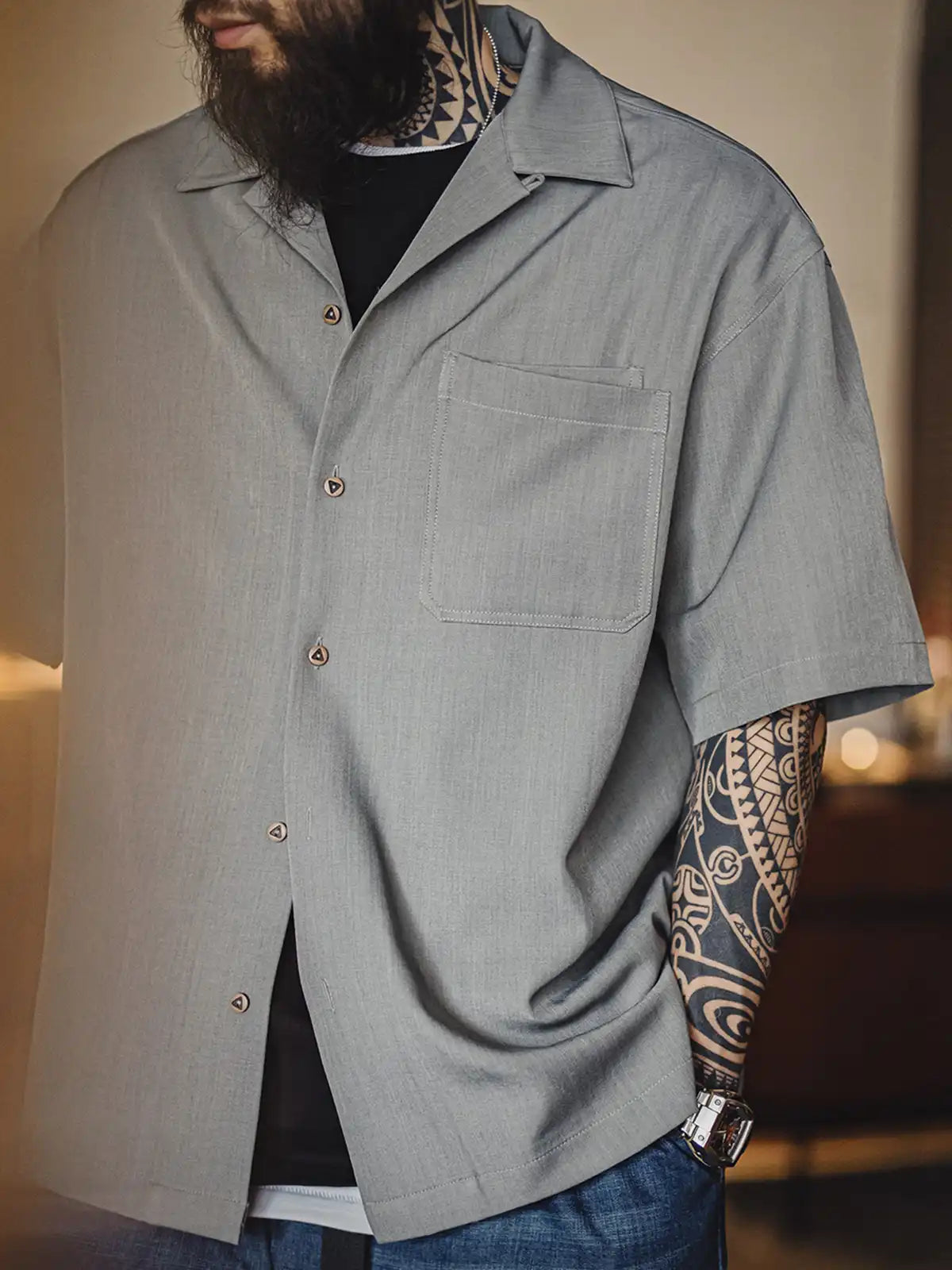 手入れが簡単でシワになりにくい97%ポリエステル・3%ポリウレタン混紡素材を使用し、古き良きペッパーグレー系の「塩胡椒(ソルト&ペッパー)」カラーに染め上げた一着。ドロップショルダーとワイドボックスシルエットがリラックスしたムードを演出しつつ、独特のドレープ感を強調するデザイン。胸元には開閉感をもたらす「内三角ダブルボタン」ディテールを配置し、開けた状態でもきれいに流れるアロハ風の襟元を実現。後ろ襟に施された幾何学的なステッチラインが背中のラインを引き立て、シンプルなコーディネートにもさりげないアクセントを添える。軽やかな見た目ながらポリウレタンの微ストレッチ性で動きやすく、リゾートからタウンユースまで1枚で「軽くヴィンテージを楽しむ」スタイルを完成させる。
