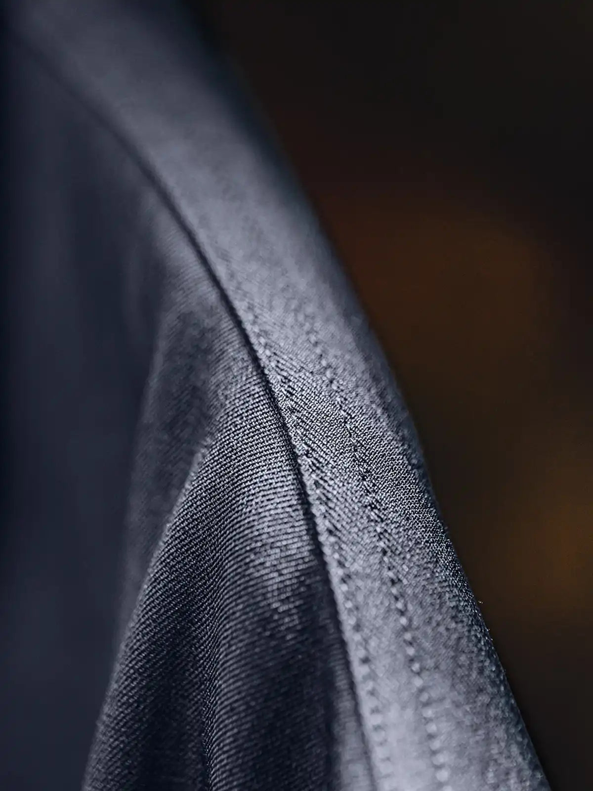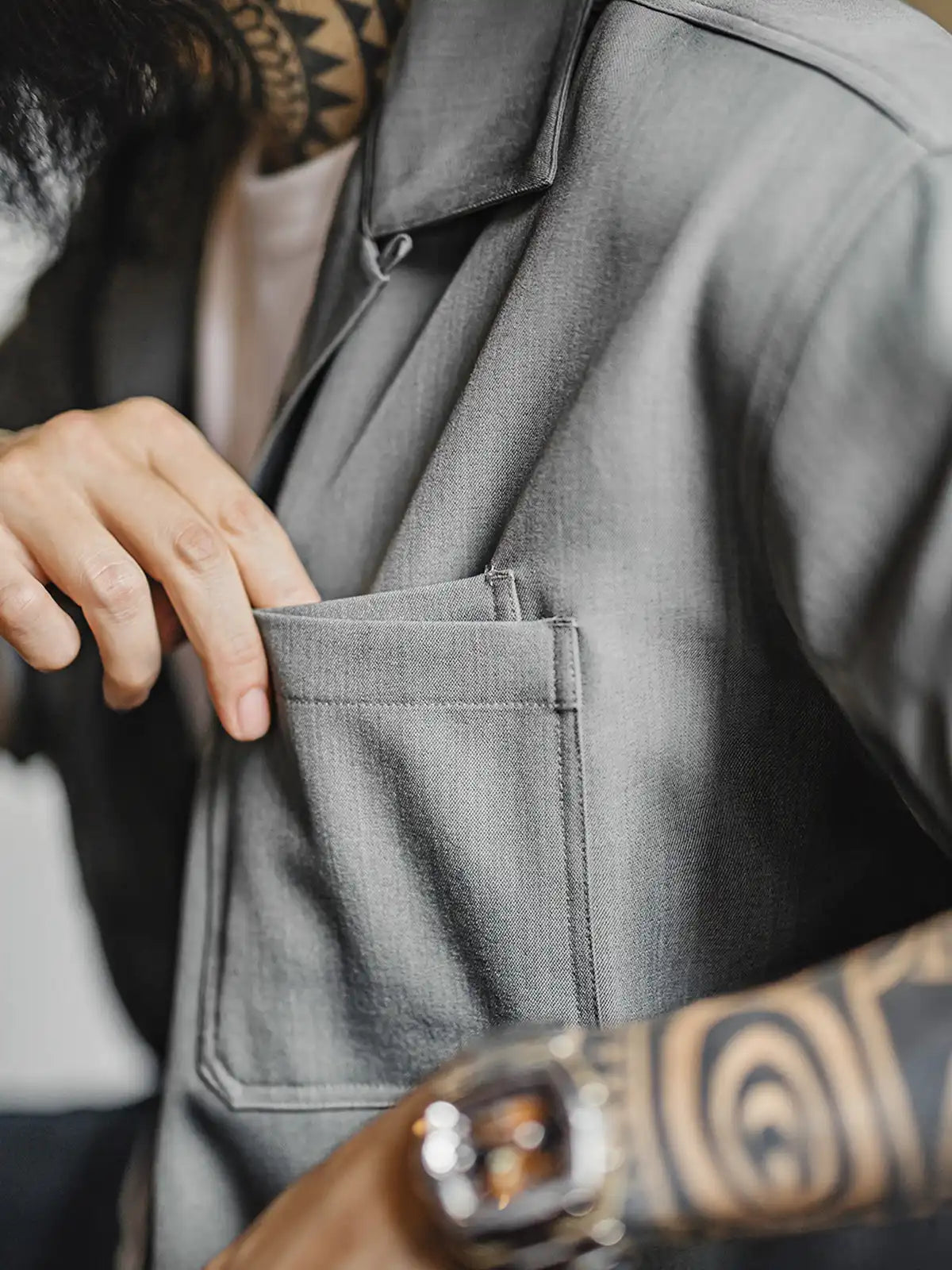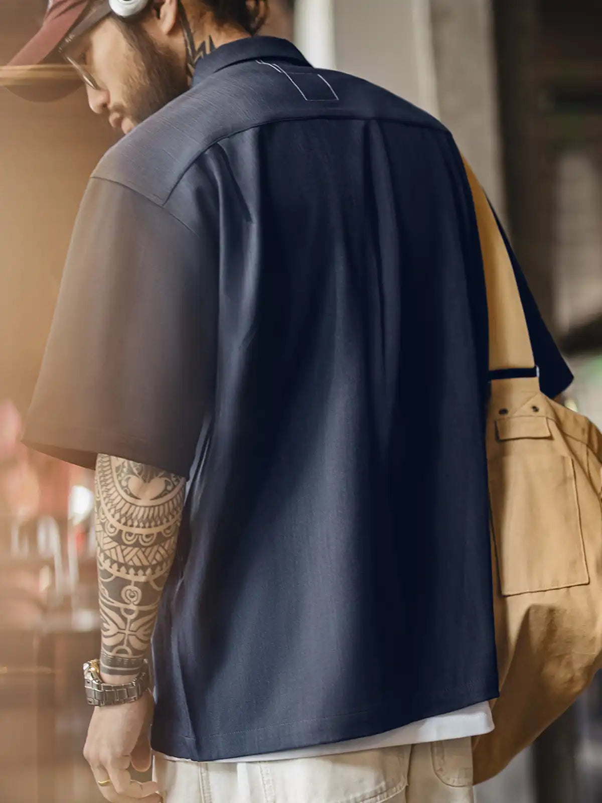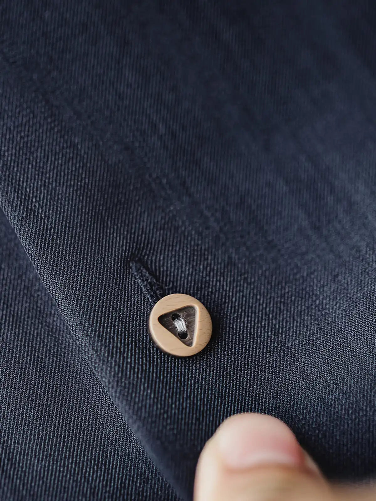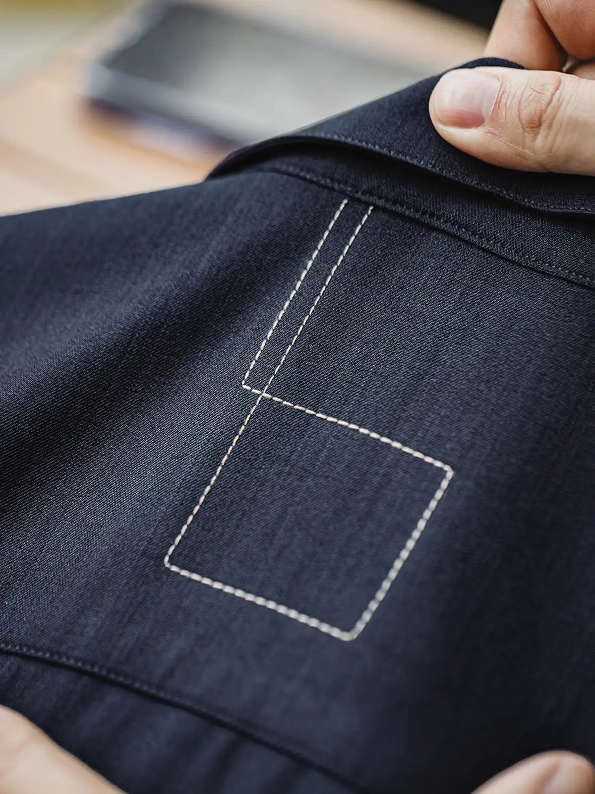 手入れが簡単でシワになりにくい97%ポリエステル・3%ポリウレタン混紡素材を使用し、古き良きペッパーグレー系の「塩胡椒(ソルト&ペッパー)」カラーに染め上げた一着。ドロップショルダーとワイドボックスシルエットがリラックスしたムードを演出しつつ、独特のドレープ感を強調するデザイン。胸元には開閉感をもたらす「内三角ダブルボタン」ディテールを配置し、開けた状態でもきれいに流れるアロハ風の襟元を実現。後ろ襟に施された幾何学的なステッチラインが背中のラインを引き立て、シンプルなコーディネートにもさりげないアクセントを添える。軽やかな見た目ながらポリウレタンの微ストレッチ性で動きやすく、リゾートからタウンユースまで1枚で「軽くヴィンテージを楽しむ」スタイルを完成させる。