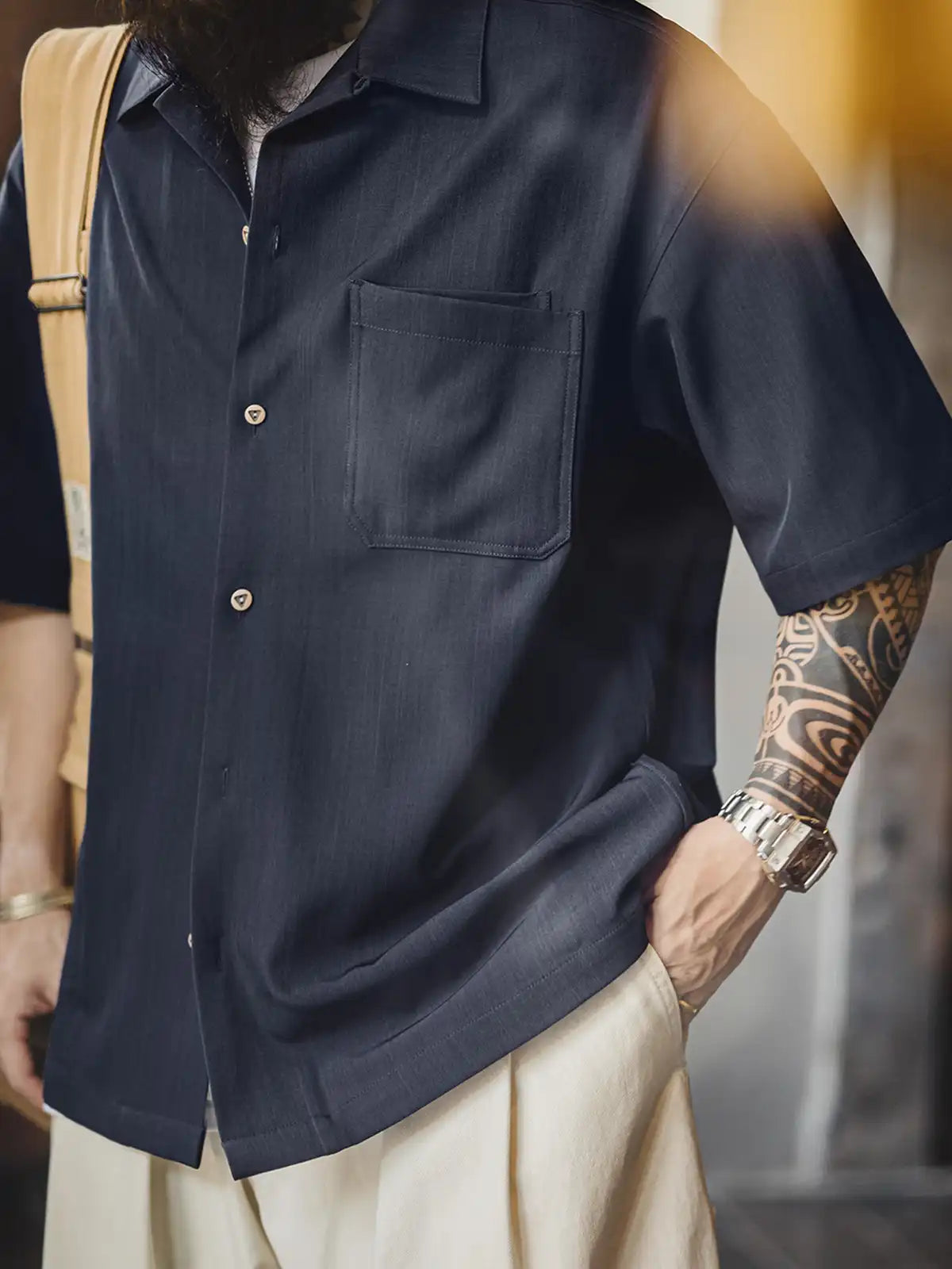 97%ポリエステル・3%ポリウレタンの薄手ストレッチ素材で仕立てた、ヴィンテージ風の味わいを備えたキューバカラ―半袖シャツ。